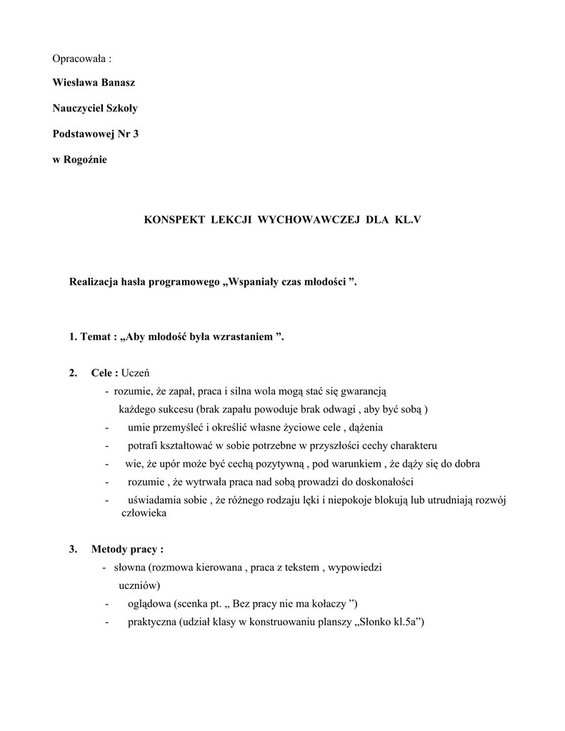 Opracowała : Wiesława Banasz Nauczyciel Szkoły Podstawowej Nr 3 w Rogoźnie KONSPEKT LEKCJI WYCHOWAWCZEJ DLA KL.V Realizacja hasła programowego „Wspaniały czas młodości ”. 1. Temat : „Aby młodość była wzrastaniem ”. 2. Cele : Uczeń - rozumie, że zapał, praca i silna wola mogą stać się gwarancją każdego sukcesu (brak zapału powoduje brak odwagi , aby być sobą ) - umie przemyśleć i określić własne życiowe cele , dążenia - potrafi kształtować w sobie potrzebne w przyszłości cechy charakteru - wie, że upór może być cechą pozytywną , pod warunkiem , że dąży się do dobra - rozumie , że wytrwała praca nad sobą prowadzi do doskonałości - 3. uświadamia sobie , że różnego rodzaju lęki i niepokoje blokują lub utrudniają rozwój człowieka Metody pracy : - słowna (rozmowa kierowana , praca z tekstem , wypowiedzi uczniów) - oglądowa (scenka pt. „ Bez pracy nie ma kołaczy ”) - praktyczna (udział klasy w konstruowaniu planszy „Słonko kl.5a”) 4. 5. Formy pracy : a. indywidualna b. grupowa c. zbiorowa Środki dydaktyczne : a. kamień i młotek - narzędzia rzeźbiarza b. strój wynalazcy piorunochronu – Beniamina Franklina c. ziarenka nasion, doniczki, papierowa kura d. drabina e. zdjęcia z okresu przedszkolnego f. magnetofon g. kolorowe plansze: 1) „Słonko kl.Va” 2) „Czas młodości to ..... 3) Praca nad sobą + Trwanie w dobrym = Doskonałość 6. Tok lekcji 6.1 Powitanie gości 6.2 Zapowiedź zajęć „Aby młodość była wzrastaniem” 6.3 Nauczyciel wieszając planszę z napisem : - Czas młodości to czas .... pyta : - Z czym Wam się kojarzy Czas młodości (zdanie to było do przemyślenia jako zadanie domowe). Najczęściej powtarzające się wersje zapisywane są na tablicy np.: Czas młodości to czas: - zabawy - uczenia się - nie przejmowania się kłopotami - rozczarowań - zdobywania nowych doświadczeń - radości - zakochiwania się - nieodpowiedzialności 6.4 Nauczyciel ustosunkowuje się do wypowiedzi. Czas młodości to czas nie tylko zabawy, rozrywek, beztroski , to także czas rozczarowań, zdobywania nowych doświadczeń, uczenia się i zmagania się z trudnościami. 6.5 Nauczyciel zachęca do refleksji: Refleksja – Zastanówcie się teraz - co zrobić z młodością? - jak ją wykorzystać, aby nie zmarnować możliwości - ku czemu poprzez młodość zmierzacie? Aby ukierunkować Wasze myślenie, proponuję wysłuchanie bajki o dwóch ziarenkach : „ Dwa ziarenka upadły w świeżo zaoraną rolę . Pierwsze rzekło : Chcę wzrastać, chcę zapuścić głęboko korzenie i wypuścić kiełek... Chcę rozwijać moje delikatne pączki jak transparenty ogłaszające nadejście wiosny.... Pragnę czuć ciepło słońca na swojej twarzy i błogosławieństwo porannej rosy na swoich płatkach I wyrosło. Drugie rzekło : Boję się zapuścić korzenie w głąb ziemi. Nie wiem, co mnie tam może spotkać w tych ciemnościach. Jeśli zacznę wzrastać, mogę zniszczyć moje delikatne kiełki, przeciskając się przez ziemię nade mną .... Co się stanie, jeśli otworzę moje delikatne pączki i jakiś ślimak będzie chciał je pożreć? Kiedy zakwitnę, jakieś dziecko może mnie wyrwać z ziemi. Nie, raczej wolę poczekać, aż będzie bezpieczniej. Więc czekało. Jakaś kura grzebiąc w ziemi na podwórku znalazła czekające ziarenko i po prostu je zjadła. ” Ziarenko – to ja (należy utożsamić siebie z pojęciem ziarenka) Jakim człowiekiem chcę być, czy tym , co podejmie trud i ryzyko wzrastania (tak jak ziarenko I), czy tym , który nie zaryzykuje i zostanie połknięty przez życie (tak jak ziarenko) 6.6 Uczniowie oglądają swoje zdjęcia z okresu przedszkolnego (tydzień wcześniej nauczyciel prosi by je przynieśli) Nauczyciel prowadzi rozmowę : N. : Pamiętacie czasy przedszkolne? ... Jak wiele rzeczy nie umieliście wówczas robić i jak wiele nauczyliście się przez te pięć lat. Czy ktoś z Was chciałby cofnąć się do przedszkola? U.: Nie N.: Dlaczego? U.: Jeszcze raz musiałbym U.: Tak N.: Dlaczego? U.: Wszystko umiałbym i nie uczyć się tabliczki mnożenia musiałbym uczyć się N. : Wynika z tego , że każdy z Was musiał włożyć niemały trud , aby posiąść tę wiedzę , którą posiadacie i stać się mądrzejszym człowiekiem . 6.7 Dyskusja na temat : - Czy można osiągnąć sukces bez pracy ? Opowiadanie inscenizowane pt. „ Bez pracy nie ma kołaczy ” ( w wykonaniu uczniów ) wg . K. Wójtowicza Narrator - Kiedyś zapytano Beniamina Franklina – wynalazcę piorunochronu – skąd u niego tyle wytrwałości . Wynalazca odpowiedział : Beniamin Franklin - Obserwował pan kiedyś rzeźbiarza przy pracy . Sto razy uderza on w to samo miejsce , a mimo to nie widać najmniejszej rysy . Ale potem za sto pierwszym razem kamień pęka . Jednak przecież , nie to ostatnie uderzenie przynosi sukces , lecz tamte sto poprzednich prowadzi do niego . - Rzeźbiarz rzeźbiący w kamieniu ! Nauczyciel pyta : Czy jednak gdy kamień pęknie dzieło rzeźbiarza jest ukończone ? Podsumowanie : Człowiek , podobnie jak ten rzeźbiarz przez całe życie wykuwa swój los. Ale tylko wtedy ten , kto uparcie dąży do celu , ten cel osiągnie . Pracując nad sobą kształtujemy charakter , umiejętności , życzliwość dla innych , umiejętność niesienia pomocy potrzebującym , bycia przyjacielem . „ Stawać się ” coraz bardziej człowiekiem , to wzrastać , zdobywać wiedzę , mądrość , pracować nad charakterem – wypracowywać cechy pozytywne , a negatywne eliminować . Rozwijać w sobie dobro i dostrzegać je w innych . „ Stawać się ” coraz bardziej człowiekiem – to kochać i szanować siebie i innych , tak samo jak chcielibyśmy aby nas kochano i szanowano . Żyć w prawdzie , zgodnie ze swoim sumieniem , nie krzywdzić nikogo słowem ani czynem . Aby młodość Wasza była wzrastaniem , radość życia , którą posiadacie nie może być zakłócon