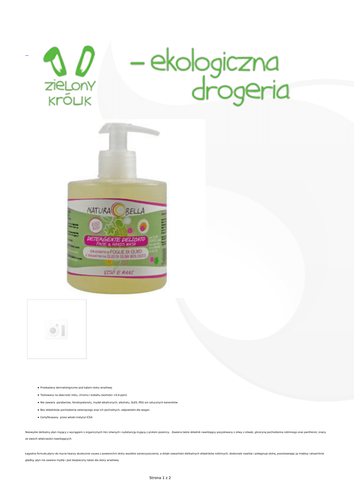 Przebadany dermatologicznie pod kątem skóry wrażliwej Testowany na obecność niklu, chromu i kobaltu (wartości <0,4 ppm) Nie zawiera parabenów, fenoksyetanolu, mydeł alkalicznych, alkoholu, SLES, PEG ani sztucznych barwników Bez składników pochodzenia zwierzęcego oraz ich pochodnych, odpowiedni dla wegan Certyfikowany przez włoski instytut ICEA Niezwykle delikatny płyn myjący z wyciągiem z organicznych liści oliwnych i substancją myjącą z protein pszenicy. Zawiera także składnik nawilżający pozyskiwany z oliwy z oliwek, glicerynę pochodzenia roślinnego oraz panthenol, znany ze swoich właściwości nawilżających. Łagodna formuła płynu do mycia twarzy skutecznie usuwa z powierzchni skóry wszelkie zanieczyszczenia, a dzięki zawartości delikatnych składników roślinnych, doskonale nawilża i pielęgnuje skórę, pozostawiając ją miękką i aksamitnie gładką, płyn nie zawiera mydła i jest bezpieczny także dla skóry wrażliwej. Strona 1 z 2 Hydrolizowane białko pszenicy – substancja odpowiedzialna za utrzymywanie wody w naskórku, dzięki czemu go nawilża, a także zmiękcza i wygładza. Ze względu na duży rozmiar cząsteczek nie penetruje w głąb skóry, pozostając na powierzchni. Pantenol (prowitamina B5) ma działanie przeciwzapalne, przyspiesza procesy regeneracji naskórka, wykorzystywany jest w preparatach do pielęgnacji skóry i włosów, dzięki zdolności wnikania w ich strukturę, gdzie ulega przekształceniu w kwas pantotenowy, czyli właściwą witaminę B5, nadaje skórze uczucie gładkości. Oliwa z oliwek - jest jednym z najlepszych naturalnych środków nawilżających. Należy do emolientów, które mogą wnikać w skórę a jej lekka konsystencja sprawia, że doskonale nadaje się do nawilżania. Oliwa jest bogata w nienasycone kwasy tłuszczowe (około 72% kwasu oleinowego) iwitaminę E, ważne dla dobrej kondycji skóry. Ponadto oliwa z oliwek posiada właściwości przeciwzapalne, dzięki czemu nie tylko nawilża ale także pielęgnuje skórę. Oliwa nie powoduje reakcji alergicznych, jest więc idealna nawet dla wrażliwej skóry. Pojemność: 350 ml Produkt wegański Aqua (Water), Caprylyl/Capryl Glucoside, Ammonium Lauryl Sulfate, Glycerin, Sodium Lauroyl Sarcosinate, Olivamidopropyl Betaine*, Cocamidopropyl Betaine, Olea Europaea (Olive) Leaf Extact**, Sodium Chloride, Coco-Glucoside, Glyceryl Oleate, Panthenol, Sodium Cocoyl Hydrolyzed Wheat Protein, Parfum (Fragrance), Sodium Benzoate, Potassium Sorbate, Lactic Acid. Składniki: * roślinny tensyd z oliwy z oliwek pochodzącej z biologicznych upraw ** składnik pochodzący z biologicznych upraw Warunki przechowywania: Szampon zawiera aktywne składniki roślinne, zalecane jest przechowywanie produktu w temperaturze między 10 a 28 ºC Płyn należy zużyć w okresie 12 miesięcy od otwarcia Strona 2 z 2