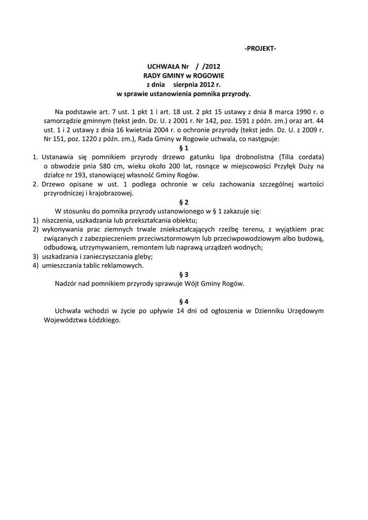 -PROJEKTUCHWAŁA Nr / /2012 RADY GMINY w ROGOWIE z dnia sierpnia 2012 r. w sprawie ustanowienia pomnika przyrody. 1. 2. 1) 2) 3) 4) Na podstawie art. 7 ust. 1 pkt 1 i art. 18 ust. 2 pkt 15 ustawy z dnia 8 marca 1990 r. o samorządzie gminnym (tekst jedn. Dz. U. z 2001 r. Nr 142, poz. 1591 z późn. zm.) oraz art. 44 ust. 1 i 2 ustawy z dnia 16 kwietnia 2004 r. o ochronie przyrody (tekst jedn. Dz. U. z 2009 r. Nr 151, poz. 1220 z późn. zm.), Rada Gminy w Rogowie uchwala, co następuje: §1 Ustanawia się pomnikiem przyrody drzewo gatunku lipa drobnolistna (Tilia cordata) o obwodzie pnia 580 cm, wieku około 200 lat, rosnące w miejscowości Przyłęk Duży na działce nr 193, stanowiącej własność Gminy Rogów. Drzewo opisane w ust. 1 podlega ochronie w celu zachowania szczególnej wartości przyrodniczej i krajobrazowej. §2 W stosunku do pomnika przyrody ustanowionego w § 1 zakazuje się: niszczenia, uszkadzania lub przekształcania obiektu; wykonywania prac ziemnych trwale zniekształcających rzeźbę terenu, z wyjątkiem prac związanych z zabezpieczeniem przeciwsztormowym lub przeciwpowodziowym albo budową, odbudową, utrzymywaniem, remontem lub naprawą urządzeń wodnych; uszkadzania i zanieczyszczania gleby; umieszczania tablic reklamowych. §3 Nadzór nad pomnikiem przyrody sprawuje Wójt Gminy Rogów. §4 Uchwała wchodzi w życie po upływie 14 dni od ogłoszenia w Dzienniku Urzędowym Województwa Łódzkiego. UZASADNIENIE 1. Przedstawienie stanu istniejącego Aktem prawnym regulującym obecnie cele, zasady i formy ochrony przyrody w Polsce jest ustawa z dnia 16 kwietnia 2004 r. o ochronie przyrody (tekst jednolity: Dz. U. z 2009 r. Nr 151, poz. 1220). Zgodnie z art. 40 ust. 1 ww. ustawy pomnikami przyrody są skupiska tworów przyrody żywej o szczególnej wartości przyrodniczej, naukowej, kulturowej, historycznej lub krajobrazowej oraz odznaczające się indywidualnymi cechami, wyróżniającymi je wśród innych tworów, okazałych rozmiarów drzewa, krzewy gatunków rodzimych lub obcych, źródła, wodospady, wywierzyska, skałki, jary, głazy narzutowe oraz jaskinie. Proponowane do objęcia formą ochrony prawnej lipa drobnolistna (Tilia cordata) zlokalizowane jest w miejscowości Przyłęk Duży na działce nr ewidencyjny 193 (pas drogi gminnej). Z przeprowadzonej oceny biologicznej drzewa wynika, iż ze względu na szczególne wartości przyrodnicze i krajobrazowe oraz z uwagi na pokaźne rozmiary kwalifikuje się ona do ustanowienia, jako pomniki przyrody. Przez kilka lat w Przyłęku Dużym mieszkał i tworzył Władysław Reymont. Według mieszkańców Przyłęka Dużego ponoć właśnie pod tą lipą siadywał przyszły laureat nagrody Nobla. 2. Wykazanie różnic między dotychczasowym, a projektowanym stanem prawnym Zgodnie z art. 44 ust. 1 ustawy z dnia 16 kwietnia 2009 roku o ochronie przyrody ustanowienie pomnika następuje w drodze uchwały rady gminy. Przedmiotowy projekt uchwały wymaga uzgodnienia z właściwym Regionalnym Dyrektorem Ochrony Środowiska. Podjęcie niniejszej uchwały zwiększy liczbę drzew o statucie pomnika przyrody, które rosną w granicach administracyjnych. 3. Charakterystyka przewidywanych skutków społecznych i gospodarczych Wyróżnienie przedmiotowej lipy poprzez uznanie jej za pomnik przyrody przyczyni się do kształtowania wśród mieszkańców, szczególnie wśród młodych pokoleń, wrażliwości estetycznej na piękno przyrody, a także przyczyni się do wzrostu świadomości ekologicznej mieszkańców i zwiększenia dbałości o walory przyrodnicze środowiska naturalnego. Podjęcie przez Radę Gminy w Rogowie niniejszej Uchwały jest przejawem dbałości o środowisko naturalne - by jego wartości zachować dla przyszłych pokoleń. 4. Skutki finansowe, związane z wejściem w życie uchwały Ustanowienie przedmiotowego drzewa pomnikiem przyrody niesie ze sobą koszty związane z oznakowaniem tabliczką informacyjną, wskazującą na status prawny drzewa będącego pojedynczym tworem przyrody żywej oraz koszty wynikające z przeprowadzanych, doraźnie i w razie potrzeby prac pielęgnacyjnych i konserwatorskich drzew (przy wsparciu finansowym WFOŚi GW w Łodzi).