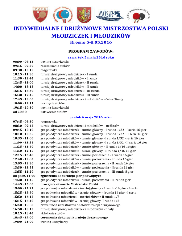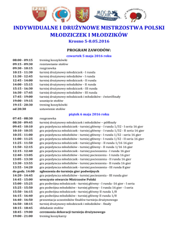 INDYWIDUALNE I DRUŻYNOWE MISTRZOSTWA POLSKI MŁODZICZEK I MŁODZIKÓW Krosno 5-8.05.2016 PROGRAM ZAWODÓW: czwartek 5 maja 2016 roku 08:00 - 09:15 09:15 - 09:30 09:30 - 10:15 10:15 - 11:30 11:30 - 12:45 12:45 - 14:00 14:00 - 15:15 15:15 - 16:30 16:30 - 17:45 17:45 - 19:00 19:00 - 19:15 19:15 - 20:30 od 20:30 trening koszykówki rozstawianie stołów rozgrzewka turniej drużynowy młodziczek - I runda turniej drużynowy młodzików - I runda turniej drużynowy młodziczek - II runda turniej drużynowy młodzików - II runda turniej drużynowy młodziczek - III runda turniej drużynowy młodzików - III runda turniej drużynowy młodziczek i młodzików - ćwierćfinały usunięcie stołów trening koszykówki ustawienie stołów piątek 6 maja 2016 roku 07:45 - 08:30 08:30 - 09:45 09:45 - 10:10 10:10 - 10:35 10:35 - 11:00 11:00 - 11:25 11:25 - 11:50 11:50 - 12:15 12:15 - 12:40 12:40 - 13:05 13:05 - 13:30 13:30 - 13:55 13:55 - 14:20 do godz. 14:00 14:20 - 14:45 14:45 - 15:00 15:00 - 15:25 15:25 - 15:50 15:50 - 16:15 16:15 - 16:40 16:40 - 16:50 16:50 - 18:15 18:15 - 18:45 18:45 - 19:00 19:00 - 21:00 rozgrzewka turniej drużynowy młodziczek i młodzików – półfinały gra pojedyncza młodziczek - turniej główny - I runda 1/32 - I seria 16 gier gra pojedyncza młodziczek - turniej główny - I runda 1/32 - II seria 16 gier gra pojedyncza młodzików - turniej główny - I runda 1/32 - seria 16 gier gra pojedyncza młodzików - turniej główny - I runda 1/32 - II seria 16 gier gra pojedyncza młodziczek - turniej główny - II runda 1/16 16 gier gra pojedyncza młodzików - turniej główny - II runda 1/16 16 gier gra pojedyncza młodziczek - turniej pocieszenia - I runda 16 gier gra pojedyncza młodzików - turniej pocieszenia - I runda 16 gier gra pojedyncza młodziczek - turniej pocieszenia - II runda 16 gier gra pojedyncza młodzików - turniej pocieszenia - II runda 16 gier gra pojedyncza młodziczek - turniej pocieszenia - III runda 8 gier zgłoszenia do turnieju gier podwójnych gra pojedyncza młodzików - turniej pocieszenia - III runda gier uroczyste otwarcie Mistrzostw Polski gra podwójna młodziczek - turniej główny - I runda -16 gier - I seria gra podwójna młodzików - turniej główny - I runda 16 gier - I seria gra podwójna młodziczek - turniej główny II runda 1/8 gra podwójna młodzików - turniej główny II runda 1/8 prezentacja uczestników finałów turnieju drużynowego turniej drużynowy młodziczek i młodzików - finały składanie stołów ceremonia dekoracji turnieju drużynowego trening koszykarzy INDYWIDUALNE I DRUŻYNOWE MISTRZOSTWA POLSKI MŁODZICZEK I MŁODZIKÓW Krosno 5-8.05.2016 PROGRAM ZAWODÓW: sobota 7 maja 2016 roku 08:30 - 09:30 trening koszykarzy - goście 09:30 - 10:15 trening koszykarzy - Krosno 10:15 - 10:30 rozstawiane stołów 10:30 - 11:00 rozgrzewka 11:00 - 11:25 gra pojedyncza młodziczek- turniej główny III runda 1/8 - 8 gier 11:25 - 11:50 gra pojedyncza młodzików - turniej główny III runda 1/8 - 8 gier 11:50 - 12:15 gra pojedyncza młodziczek - turniej pocieszenia IV runda - 8 gier 12:15 - 12:40 gra pojedyncza młodzików - turniej pocieszenia - IV runda - 8 gier 12:40 - 13:05 gra pojedyncza młodziczek - turniej pocieszenia - V runda - 8 gier 13:05 - 13:30 gra pojedyncza młodzików - turniej pocieszenia - V runda - 8 gier 13:30 - 13:55 gra podwójna młodziczek - turniej główny III runda - 1/4 13:55 - 14:20 gra podwójna młodzików - turniej główny III runda - 1/4 14:20 - 14:55 gra pojedyncza młodziczek - turniej główny IV runda - 1/4 finału - 4 gry 14:55 - 15:20 gra pojedyncza młodzików - turniej główny IV runda - 1/4 finału - 4 gry 15:20 - 15:45 gra podwójna młodziczek - turniej główny - V runda - 1/2 finału - 2 gry 15:45 - 16:10 gra podwójna młodzików - turniej główny - V runda - 1/2 finału - 2 gry 16:15 - 17:00 sprzątanie hali niedziela 8 maja 2016 roku 08:30 - 09:30 trening koszykarzy gości 09:30 - 10:15 trening koszykarzy gospodarzy 10:15 - 10:30 rozstawienie stołów 10:30 - 11:00 rozgrzewka 11:00 - 11:30 gra pojedyncza młodziczek - turniej główny - V runda 1/2 finału 11:30 - 12:00 gra pojedyncza młodzików - turniej główny - V runda 1/2 finału 12:00 - 12:30 gra podwójna młodziczek - finał 12:30 - 13:00 gra podwójna młodzików - finał 13:00 - 13:30 gra pojedyncza młodziczek - finał 13:30 - 14:00 gra pojedyncza młodzików - finał 14:00 - 14:30 ceremonia dekoracji i zakończenie Mistrzostw Polski opr. Podkarpacki Okręgowy Związek Tenisa Stołowego