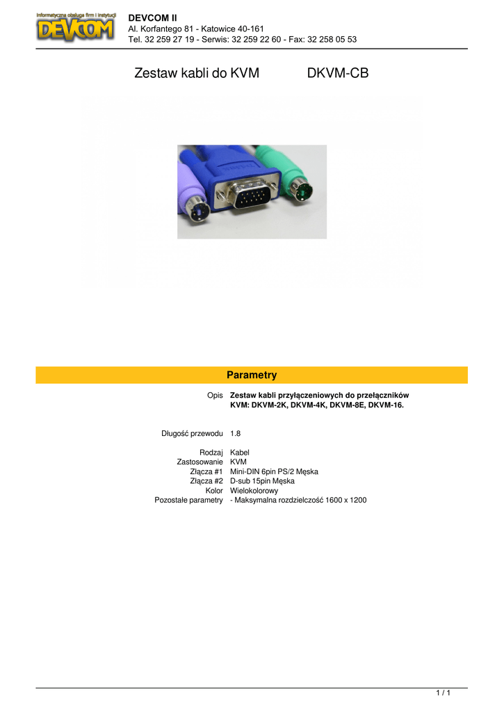 DEVCOM II Al. Korfantego 81 - Katowice 40-161 Tel. 32 259 27 19 - Serwis: 32 259 22 60 - Fax: 32 258 05 53 Zestaw kabli do KVM DKVM-CB Parametry Opis Zestaw kabli przyłączeniowych do przełączników KVM: DKVM-2K, DKVM-4K, DKVM-8E, DKVM-16. Długość przewodu 1.8 Rodzaj Zastosowanie Złącza #1 Złącza #2 Kolor Pozostałe parametry Kabel KVM Mini-DIN 6pin PS/2 Męska D-sub 15pin Męska Wielokolorowy - Maksymalna rozdzielczość 1600 x 1200 1/1 Powered by TCPDF (www.tcpdf.org)