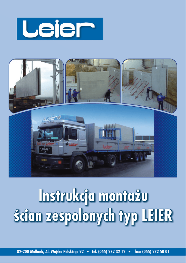 Instrukcja monta¿u œcian zespolonych typ LEIER 82-200 Malbork, Al. Wojska Polskiego 92 • tel. (055) 272 32 12 • fax: (055) 272 50 01 1 Podstawowe wyposa¿enie w materia³ i urz¹dzenia do monta¿u œcian: Wiertarka udarowa, wiert³o f. 14, statyw pod niwelator, niwelator, listwa niwelacyjna, wkrêtarka udarowa z koñcówk¹ wymienn¹ (rozmiar 19), poziomnica, przed³u¿acz do pr¹du, ³om, haki dŸwigowe, szlifierka k¹towa z tarczami, m³otek, odpowiednia pomoc do podnoszenia. Materia³ drobny: wkrêty do drewna f.12, ko³ki f.14, listwy przek³adkowe, podk³adki o ró¿nych gruboœciach. Podpory ukoœne mo¿na wypo¿yczyæ. Rys. 1 2 Prace wstêpne przed monta¿em œcian: • Dok³adnoœæ wysokoœci p³yty pod³ogowej lub ³awy fundamentowej +/- 1 cm. • Przy betonowaniu zatroszczyæ siê o dok³adne, systematyczne roz³o¿enie zbrojenia startowego (rys. 2 i 3). Nie stosowaæ mat budowlanych stalowych (siatek). • Odstêp od zewnêtrznej krawêdzi œciany do prêtów (zbrojenia startowego) min. 7 cm. • Przed zamontowaniem œcian trzeba nanieœæ szkic podstawowy wszystkich œcian - zewnêtrzny lub wewnêtrzny rys krawêdzi, drzwi i przepustów a najwy¿szy punkt p³yty pod³ogowej, który jest dla œcian orientacyjny, nale¿y zniwelowaæ u¿ywaj¹c podk³adek plastikowych (rys. 2). • Najwy¿szy punkt orientacyjny (fuga w pod³o¿u wed³ug planu uk³adania) = górna krawêdŸ podk³adki. • Na jeden element stosowaæ minimum 4 punkty podporowe (2 szalunek zewnêtrzny, 2 szalunek wewnêtrzny). Ewentualnie dodatkowo przy otworach. • Za pomoc¹ kombinacji podk³adek o ró¿nych gruboœciach powstaje jednakowa p³aszczyzna ustawienia elementów. szk ic z zbrojenie startowe ew nêt rzn y sz k ic w ew n. p³yta podk³adowa Rys. 2 we fuga d³u g p przy lan po u m d³ o ont ¿u a¿u koñcówki zbrojenia startowego skierowaæ do œrodka œciany Rys. 3 3 Roz³adunek elementów: • Numeracjê elementów porównaæ z planem uk³adania (szalunek zewnêtrzny: na planie uk³adania z regu³y zaznaczony elips¹ lub trójk¹tem). • ¯¹dany element podczepiæ do podnoœnika (rys. 6 i 7). • Pozosta³e elementy zabezpieczyæ. • Usun¹æ bolec zabezpieczaj¹cy dla ¿¹danego elementu (rys. 4 i 5). • Powoli i w kierunku pionowym podnieœæ ze stojaka. • Przy transporcie w pozycji le¿¹cej patrz Punkt 6. Rys. 6 bolec zabezpieczaj¹cy uchwyt wyci¹gowy Rys. 4 Rys. 5 Rys. 7 4 Krótkotrwa³e sk³adowanie: • Dla potrzeb krótkotrwa³ego sk³adowania nale¿y zabezpieczyæ odpowiedni¹ powierzchniê magazynow¹. Tak¿e krótkotrwale sk³adowane elementy musz¹ byæ wystarczaj¹co zabezpieczone. 5 Roz³adunek elementów: • Elementy nale¿y zawsze roz³adowywaæ za pomoc¹ zainstalowanego na budowie dŸwigu. • Przy naprê¿aniu zawiesi zwróciæ uwagê na równe podnoszenie; tak skracaæ zawiesia aby element móg³ byæ podniesiony i u³o¿ony poziomo. • K¹t zawiesia do œciany powinien wynosiæ min. 60O – Zwróciæ uwagê aby ³añcuchy by³y wystarczaj¹co d³ugie! (rys.8) • Podnosiæ powoli, unikaæ nag³ych ruchów. Rys. 8 uchwyt wyci¹gowy k³adzenie z pozycji transportowej 6 „K³adzenie” i „Obracanie” wysokich elementów: deski listwy podk³adowe ≥ 10 cm Rys. 9 przekrêcanie (Rys.11, 12) podnosiæ, nie naciskaæ (pchaæ) do pozycji pionowej d³ugi szalunek do do³u (jeœli wystêpuje) uchwyt wyci¹gowy listwy podk³adowe deski Rys. 10 - 30 cm Warianty obracania Chcemy zwróciæ Pañstwa uwagê na koniecznoœæ wczeœniejszego (przed rozpoczêciem monta¿u) uzgodnienia z producentem szczególnych przypadków jak np. przek³adanie wysokich elementów (>2,8 m) z zastosowaniem dŸwigu samochodowego z dwoma wyci¹gami linowymi lub za pomoc¹ dwóch dŸwigów samojezdnych. dŸwig • Element w „pozycji transportowej” (rys.5) jest podnoszony i po³o¿ony. • W celu obrócenia poziomego nale¿y przygotowaæ klocki drewniane i deski. • Jako pomoc w przechylaniu s³u¿¹ deski (nie stosowaæ podk³adów punktowych mog¹cych wyszczerbiæ p³ytê) • Przy k³adzeniu nale¿y zwróciæ uwagê na: - d³u¿sza œcianka znajduje siê zawsze na dole! - S³upy > lub = 10 cm uk³adaæ zawsze pod kratownic¹! Uwa¿aæ na odstêpy krawêdzi, nie stosowaæ podk³adów punktowych! - Oczko zawiesia lub haka ustawiæ w kierunku œrodka gruboœci œciany – aby unikn¹æ uszkodzenia krawêdzi w³o¿yæ deskê. • Przewiesiæ haki (po³o¿enie transportowe po³o¿enie wysokie). • W celu wyrównania poziomów nale¿y pod³o¿yæ deskê pod doln¹ krawêdŸ œciany, (patrz rys.9, 10) przednie czêœci odci¹¿yæ (np. d³u¿sz¹ œciankê ...). • Podczas obracania zawsze nale¿y zwróciæ uwagê, a¿eby dŸwig wykonywa³ funkcjê „podnoszenie”, a nie „opuszczanie”. • Przy wysokoœciach œcian ponad 6,0 m nale¿y wzi¹æ pod uwagê szczególne ustalenia dla roz³adunku i monta¿u. Producent chêtnie je Pañstwu przeka¿e. d³u¿szy szalunek do do³u Rys. 11 Przy podnoszeniu dostarczonych elementów œciennych z pozycji le¿¹cej do pozycji stoj¹cej potrzebne s¹ 2 podnoœniki linowe przy dŸwigu samochodowym lub na dŸwigu samojezdnym Rys. 12 7 Uk³adanie elementu: • Przy obracaniu elementu do ustawienia nale¿y uwa¿aæ, aby ju¿ ustawione elementy nie przesunê³y siê lub nie zosta³y uszkodzone. • Aby unikn¹æ uszkodzeñ kratownicy i elementów wbudowywanych przez zbrojenie startowe nale¿y opuszczaæ element powoli i przeszkadzaj¹ce zbrojenie startowe delikatnie (wystarczaj¹co) odgi¹æ. • Element nale¿y postawiæ na punkty podporowe i szkic. • Nale¿y zwróciæ uwagê na pionowe ustawienie elementu dŸwigiem! • Nale¿y wzi¹æ pod uwagê pionow¹ fugê (0,5 - 2,0 cm*). • Korekty po³o¿enia ostatecznego nale¿y dokonywaæ ostro¿nie delikatnie przesuwaj¹c szczypcami. • Element zabezpieczyæ podporami ukoœnymi (z regu³y 2 sztuki /element). - Dyble œcienne s¹ wbudowane fabrycznie. - Podporê ukoœn¹ przykrêciæ do œciany za pomoc¹ wkrêt