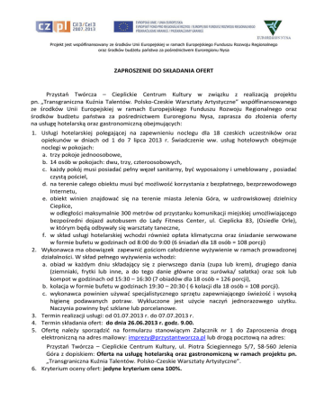 Projekt jest współfinansowany ze środków Unii Europejskiej w ramach Europejskiego Funduszu Rozwoju Regionalnego oraz środków budżetu państwa za pośrednictwem Euroregionu Nysa ZAPROSZENIE DO SKŁADANIA OFERT Przystań Twórcza – Cieplickie Centrum Kultury w związku z realizacją projektu pn. „Transgraniczna Kuźnia Talentów. Polsko-Czeskie Warsztaty Artystyczne” współfinansowanego ze środków Unii Europejskiej w ramach Europejskiego Funduszu Rozwoju Regionalnego oraz środków budżetu państwa za pośrednictwem Euroregionu Nysa, zaprasza do złożenia oferty na usługę hotelarską oraz gastronomiczną obejmujących: 1. Usługi hotelarskiej polegającej na zapewnieniu noclegu dla 18 czeskich uczestników oraz opiekunów w dniach od 1 do 7 lipca 2013 r. Świadczenie ww. usług hotelowych obejmuje noclegi w pokojach: a. trzy pokoje jednoosobowe, b. 14 osób w pokojach: dwu, trzy, czteroosobowych, c. każdy pokój musi posiadać pełny węzeł sanitarny, być wyposażony i umeblowany , posiadać czystą pościel, d. na terenie całego obiektu musi być możliwość korzystania z bezpłatnego, bezprzewodowego Internetu, e. obiekt winien znajdować się na terenie miasta Jelenia Góra, w uzdrowiskowej dzielnicy Cieplice, w odległości maksymalnie 300 metrów od przystanku komunikacji miejskiej umożliwiającego bezpośredni dojazd autobusem do Lady Fitness Center, ul. Cieplicka 83, (Osiedle Orle), w którym będą odbywały się warsztaty taneczne, f. w skład usługi hotelarskiej wchodzi również opłata klimatyczna oraz śniadanie serwowane w formie bufetu w godzinach od 8:00 do 9:00 (6 śniadań dla 18 osób = 108 porcji) 2. Wykonawca ma obowiązek zapewnić gościom całodzienne wyżywienie w ramach prowadzonej działalności. W skład pełnego wyżywienia wchodzi: a. obiad w każdym dniu składający się z pierwszego dania (zupa lub krem), drugiego dania (ziemniaki, frytki lub inne, a do tego danie główne oraz surówka/ sałatka) oraz sok lub kompot w godzinach od 15:30 – 16:30 (7 obiadów dla 18 osób = 126 porcji), b. kolacja w formie bufetu w godzinach 19:30 – 20:30 ( 6 kolacji dla 18 osób = 108 porcji). c. wykonawca powinien używać specjalistycznego sprzętu zapewniającego świeżość i wysoką higienę podawanych potraw. Wykluczone jest użycie naczyń jednorazowego użytku. Naczynia powinny być szklane lub porcelanowe. 3. Termin realizacji usługi: od 01.07.2013 r. do 07.07.2013 r. 4. Termin składania ofert: do dnia 26.06.2013 r. godz. 9.00. 5. Ofertę należy sporządzić na formularzu stanowiącym Załącznik nr 1 do Zaproszenia drogą elektroniczną na adres mailowy: [email protected] lub drogą pocztową na adres: Przystań Twórcza – Cieplickie Centrum Kultury, ul. Piotra Ściegiennego 5/7, 58-560 Jelenia Góra z dopiskiem: Oferta na usługę hotelarską oraz gastronomiczną w ramach projektu pn. „Transgraniczna Kuźnia Talentów. Polsko-Czeskie Warsztaty Artystyczne”. 6. Kryterium oceny ofert: jedyne kryterium cena 100%. Projekt jest współfinansowany ze środków Unii Europejskiej w ramach Europejskiego Funduszu Rozwoju Regionalnego oraz środków budżetu państwa za pośrednictwem Euroregionu Nysa 7. Zamawiający zastrzega sobie prawo do unieważnienia zaproszenia do składania ofert bez podania przyczyny. 8. Warunki płatności: w przeciągu 14 dni od daty dostarczenia prawidłowo wystawionej faktury VAT. 9. Osoba upoważniona do kontaktu z Wykonawcami ze strony Zamawiającego: Grzegorz Łukaszuk, tel./fax: 75 712 28 92, e-mail: [email protected]