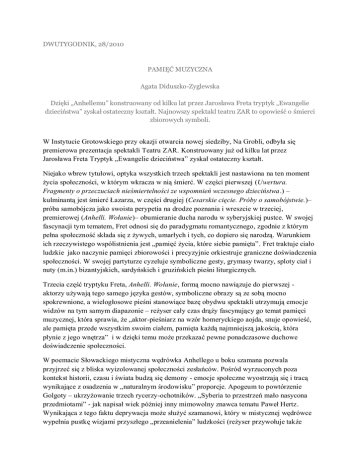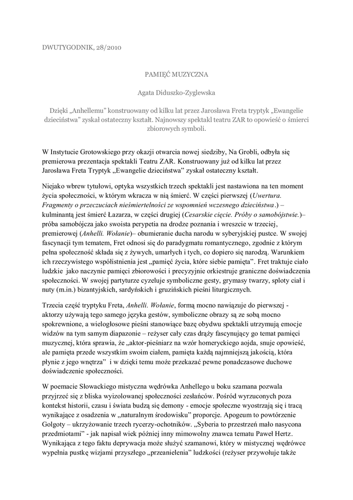 DWUTYGODNIK, 28/2010 PAMIĘĆ MUZYCZNA Agata Diduszko-Zyglewska Dzięki „Anhellemu” konstruowany od kilku lat przez Jarosława Freta tryptyk „Ewangelie dzieciństwa” zyskał ostateczny kształt. Najnowszy spektakl teatru ZAR to opowieść o śmierci zbiorowych symboli. W Instytucie Grotowskiego przy okazji otwarcia nowej siedziby, Na Grobli, odbyła się premierowa prezentacja spektakli Teatru ZAR. Konstruowany już od kilku lat przez Jarosława Freta Tryptyk „Ewangelie dzieciństwa” zyskał ostateczny kształt. Niejako wbrew tytułowi, optyka wszystkich trzech spektakli jest nastawiona na ten moment życia społeczności, w którym wkracza w nią śmierć. W części pierwszej (Uwertura. Fragmenty o przeczuciach nieśmiertelności ze wspomnień wczesnego dzieciństwa.) – kulminantą jest śmierć Łazarza, w części drugiej (Cesarskie cięcie. Próby o samobójstwie.)– próba samobójcza jako swoista perypetia na drodze poznania i wreszcie w trzeciej, premierowej (Anhelli. Wołanie)– obumieranie ducha narodu w syberyjskiej pustce. W swojej fascynacji tym tematem, Fret odnosi się do paradygmatu romantycznego, zgodnie z którym pełna społeczność składa się z żywych, umarłych i tych, co dopiero się narodzą. Warunkiem ich rzeczywistego współistnienia jest „pamięć życia, które siebie pamięta”. Fret traktuje ciało ludzkie jako naczynie pamięci zbiorowości i precyzyjnie orkiestruje graniczne doświadczenia społeczności. W swojej partyturze cyzeluje symboliczne gesty, grymasy twarzy, sploty ciał i nuty (m.in.) bizantyjskich, sardyńskich i gruzińskich pieśni liturgicznych. Trzecia część tryptyku Freta, Anhelli. Wołanie, formą mocno nawiązuje do pierwszej aktorzy używają tego samego języka gestów, symboliczne obrazy są ze sobą mocno spokrewnione, a wielogłosowe pieśni stanowiące bazę obydwu spektakli utrzymują emocje widzów na tym samym diapazonie – reżyser cały czas drąży fascynujący go temat pamięci muzycznej, która sprawia, że „aktor-pieśniarz na wzór homeryckiego aojda, snuje opowieść, ale pamięta przede wszystkim swoim ciałem, pamięta każdą najmniejszą jakością, która płynie z jego wnętrza” i w dzięki temu może przekazać pewne ponadczasowe duchowe doświadczenie społeczności. W poemacie Słowackiego mistyczna wędrówka Anhellego u boku szamana pozwala przyjrzeć się z bliska wyizolowanej społeczności zesłańców. Pośród wyrzuconych poza kontekst historii, czasu i świata budzą się demony - emocje społeczne wyostrzają się i tracą wynikające z osadzenia w „naturalnym środowisku” proporcje. Apogeum to powtórzenie Golgoty – ukrzyżowanie trzech rycerzy-ochotników. „Syberia to przestrzeń mało nasycona przedmiotami” - jak napisał wiek później inny mimowolny znawca tematu Paweł Hertz. Wynikająca z tego faktu deprywacja może służyć szamanowi, który w mistycznej wędrówce wypełnia pustkę wizjami przyszłego „przeanielenia” ludzkości (reżyser przywołuje także „Króla-Ducha”), ale u zwykłych śmiertelników nieodzownie prowadzi do obumierania pozbawionej niezbędnych artefaktów zbiorowej pamięci. Interpretacja Jarosława Freta akcentuje ten aspekt poematu Słowackiego – najdobitniej widać to w komponowanych przez niego symbolicznych obrazach. Nad przestrzenią spektaklu dominuje biała płachta utworzona z wielkiego prostokątnego żagla – w pierwszej scenie półnagi Anhelli przywiązany grubą liną do jednego z jej rogów miota się próbując uchylić rąbka tajemnicy, a może wspiąć się do góry niczym biblijny Jakub. Kolejny obraz to zesłańcy, którzy długimi tyczkami podbijają płachtę coraz wyżej jakby chcieli powstrzymać niebo przed runięciem im na głowy. W chwilę potem, nie znajdując bezpieczeństwa również pod stopami poruszają się po scenie budując przed sobą pomosty z niskich stołeczków, które mozolnie przestawiają, żeby brnąć do przodu. Zawieszeni w pustce, próbują tworzyć własne prowizoryczne szlaki, które jednak znikają tuż po ich przejściu. Przestrzeń pozbawiona jest fizycznych punktów odniesienia, a jej przymusowi mieszkańcy zdają się stopniowo tracić także te symboliczne - ze starej grubej księgi, otwieranej przez jednego z bohaterów sypie się ziemia. Kiedy Anhellego nawiedzają aniołowie, „ich skrzydła nie są śnieżnobiałe, już raczej szare, osmolone dymem dogasających dusz.” – jak pisze sam reżyser. Syberyjska otchłań powoli pożera wszelkie sensy. W finałowej scenie aktorzy w sekwencji dramatycznych upadków i podźwignięć odsłaniają pod deskami podłogi prostokąty ziemi, w których ostatecznie nieruchomieją. Płachta „nieba” spada na nich i przykrywa całą scenę tworząc pejzaż bieli naznaczonej pagórkami grobów. Jedyny widoczny rekwizyt to klatka z dwoma żywymi ptakami – krukiem i wroną. Tryptyk pokazano Na Grobli niechronologicznie – część druga znalazła się na końcu. W kontekście spójności stylistycznej premierowej części trzeciej i uwertury, takie rozwiązanie okazało się niespodziewanie celne. Cesarskie cięcie to spektakl osobny wobec pozostałych, bo osadzony we współczesności. Jarosław Fret rezygnuje w nim ze zmagań z historią i mitami zbiorowości - i przenosi temat śmierci w sferę być może najistotniejszą dla współczesnego Europejczyka – w kameralną przestrzeń indywidualnego umysłu. To przekierowanie uwagi pokazuje już znakomita symboliczna scena, która otwiera spektakl – na podłodze zasypanej potłuczonym szkłem, które wypełnia również szczelinę przecinającą całą scenę w poprzek, bosa dziewczyna z butami w rękach, balansując na granicy upadku, samotnie tańczy tango. Znaczącą wobec pozostałych części tryptyku metamorfozę przechodzi tu sfera muzyczna: oddające ducha społeczności wielogłosy w dużej mierze ustępują pieśni indywidualnej i motywom muzycznym rodem z Pó