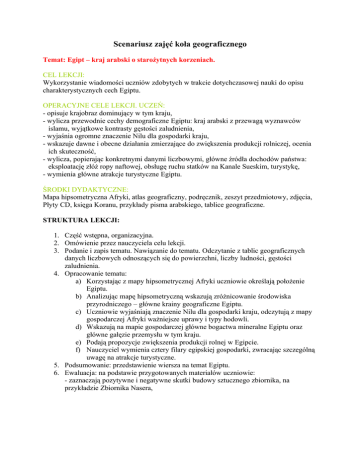 Scenariusz zajęć koła geograficznego Temat: Egipt – kraj arabski o starożytnych korzeniach. CEL LEKCJI: Wykorzystanie wiadomości uczniów zdobytych w trakcie dotychczasowej nauki do opisu charakterystycznych cech Egiptu. OPERACYJNE CELE LEKCJI. UCZEŃ: - opisuje krajobraz dominujący w tym kraju, - wylicza przewodnie cechy demograficzne Egiptu: kraj arabski z przewagą wyznawców islamu, wyjątkowe kontrasty gęstości zaludnienia, - wyjaśnia ogromne znaczenie Nilu dla gospodarki kraju, - wskazuje dawne i obecne działania zmierzające do zwiększenia produkcji rolniczej, ocenia ich skuteczność, - wylicza, popierając konkretnymi danymi liczbowymi, główne źródła dochodów państwa: eksploatację złóż ropy naftowej, obsługę ruchu statków na Kanale Sueskim, turystykę, - wymienia główne atrakcje turystyczne Egiptu. ŚRODKI DYDAKTYCZNE: Mapa hipsometryczna Afryki, atlas geograficzny, podręcznik, zeszyt przedmiotowy, zdjęcia, Płyty CD, księga Koranu, przykłady pisma arabskiego, tablice geograficzne. STRUKTURA LEKCJI: 1. Część wstępna, organizacyjna. 2. Omówienie przez nauczyciela celu lekcji. 3. Podanie i zapis tematu. Nawiązanie do tematu. Odczytanie z tablic geograficznych danych liczbowych odnoszących się do powierzchni, liczby ludności, gęstości zaludnienia. 4. Opracowanie tematu: a) Korzystając z mapy hipsometrycznej Afryki uczniowie określają położenie Egiptu. b) Analizując mapę hipsometryczną wskazują zróżnicowanie środowiska przyrodniczego – główne krainy geograficzne Egiptu. c) Uczniowie wyjaśniają znaczenie Nilu dla gospodarki kraju, odczytują z mapy gospodarczej Afryki ważniejsze uprawy i typy hodowli. d) Wskazują na mapie gospodarczej główne bogactwa mineralne Egiptu oraz główne gałęzie przemysłu w tym kraju. e) Podają propozycje zwiększenia produkcji rolnej w Egipcie. f) Nauczyciel wymienia cztery filary egipskiej gospodarki, zwracając szczególną uwagę na atrakcje turystyczne. 5. Podsumowanie: przedstawienie wiersza na temat Egiptu. 6. Ewaluacja: na podstawie przygotowanych materiałów uczniowie: - zaznaczają pozytywne i negatywne skutki budowy sztucznego zbiornika, na przykładzie Zbiornika Nasera,