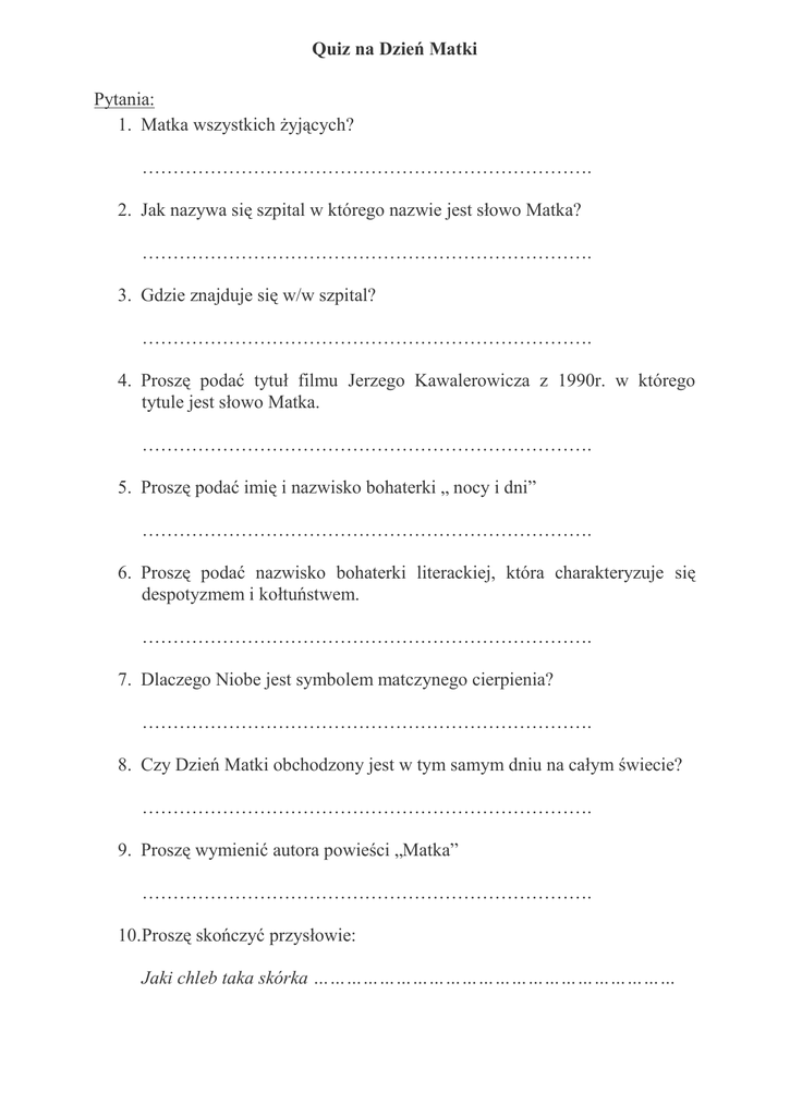 Quiz na Dzień Matki Pytania: 1. Matka wszystkich żyjących? ………………………………………………………………. 2. Jak nazywa się szpital w którego nazwie jest słowo Matka? ………………………………………………………………. 3. Gdzie znajduje się w/w szpital? ………………………………………………………………. 4. Proszę podać tytuł filmu Jerzego Kawalerowicza z 1990r. w którego tytule jest słowo Matka. ………………………………………………………………. 5. Proszę podać imię i nazwisko bohaterki „ nocy i dni” ………………………………………………………………. 6. Proszę podać nazwisko bohaterki literackiej, która charakteryzuje się despotyzmem i kołtuństwem. ………………………………………………………………. 7. Dlaczego Niobe jest symbolem matczynego cierpienia? ………………………………………………………………. 8. Czy Dzień Matki obchodzony jest w tym samym dniu na całym świecie? ………………………………………………………………. 9. Proszę wymienić autora powieści „Matka” ………………………………………………………………. 10.Proszę skończyć przysłowie: Jaki chleb taka skórka …………………………………………………………