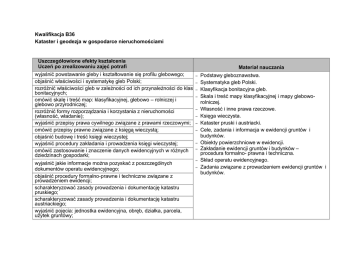 Kwalifikacja B36 Kataster i geodezja w gospodarce nieruchomościami Uszczegółowione efekty kształcenia Uczeń po zrealizowaniu zajęć potrafi wyjaśnić powstawanie gleby i kształtowanie się profilu glebowego; objaśnić właściwości i systematykę gleb Polski; rozróŜnić właściwości gleb w zaleŜności od ich przynaleŜności do klas bonitacyjnych; omówić skalę i treść map: klasyfikacyjnej, glebowo – rolniczej i glebowo przyrodniczej; rozróŜnić formy rozporządzania i korzystania z nieruchomości (własność, władanie); wyjaśnić przepisy prawa cywilnego związane z prawami rzeczowymi; omówić przepisy prawne związane z księgą wieczystą; objaśnić budowę i treść księgi wieczystej; wyjaśnić procedury zakładania i prowadzenia księgi wieczystej; omówić zastosowanie i znaczenie danych ewidencyjnych w róŜnych dziedzinach gospodarki; wyjaśnić jakie informacje moŜna pozyskać z poszczególnych dokumentów operatu ewidencyjnego; objaśnić procedury formalno-prawne i techniczne związane z prowadzeniem ewidencji; scharakteryzować zasady prowadzenia i dokumentację katastru pruskiego; scharakteryzować zasady prowadzenia i dokumentację katastru austriackiego; wyjaśnić pojęcia: jednostka ewidencyjna, obręb, działka, parcela, uŜytek gruntowy; Materiał nauczania – – – – – – – – – – – – Podstawy gleboznawstwa. Systematyka gleb Polski. Klasyfikacja bonitacyjna gleb. Skala i treść mapy klasyfikacyjnej i mapy gleboworolniczej. Własność i inne prawa rzeczowe. Księga wieczysta. Kataster pruski i austriacki. Cele, zadania i informacja w ewidencji gruntów i budynków. Obiekty powierzchniowe w ewidencji. Zakładanie ewidencji gruntów i budynków – procedura formalno- prawna i techniczna. Skład operatu ewidencyjnego. Zadania związane z prowadzeniem ewidencji gruntów i budynków. wyjaśnić przepisy formalno-prawne związane z zakładaniem i prowadzeniem ewidencji gruntów i budynków; wyszczególnić części składowe operatu ewidencji gruntów i budynków; scharakteryzować zawartość informacji w częściach składowych operatu; scharakteryzować dokumenty geodezyjne i prawne katastru nieruchomości pod względem treści oraz wskazać w jakich zadaniach geodezyjnych mogą być wykorzystane; omówić procedury formalno-prawne związane z udostępnianiem dokumentacji katastru nieruchomości; objaśnić rodzaje zmian w ewidencji gruntów rozróŜnić dokumenty geodezyjne oraz prawne będące podstawą do wprowadzania zmian w ewidencji gruntów; wyjaśnić zasady numeracji działek przy podziałach i scaleniach; omówić zasady wprowadzania zmian z urzędu i na wniosek strony w części kartograficznej i opisowej operatu ewidencyjnego. scharakteryzować związek mapy ewidencyjnej i zasadniczej; wyjaśnić skalę, układ i dokładność mapy ewidencyjnej; wyjaśnić pojęcia: kartometryczność, współczynnik deformacji liniowej i powierzchniowej; omówić przepisy formalno-prawne dotyczące ustalenia granic (rozgraniczenia i wznowienia); przedstawić przepisy techniczne dotyczące ustalenia granic (rozgraniczenia i wznowienia); scharakteryzować czynności techniczne związane z pomiarem uzupełniającym; zinterpretować treść szkiców podstawowych i polowych; omówić warunki i etapy postępowania formalno-prawnego podziału nieruchomości; omówić warunki i etapy postępowania formalno-prawnego scalenia i podziału nieruchomości; – – – – – – Skala i treść mapy zasadniczej a mapa ewidencyjna. Deformacja arkusza mapy. Ustalenie granic. Dokumentacja wznowienia i rozgraniczenia. Gospodarka nieruchomościami: podział nieruchomości, podział i scalenie nieruchomości, wywłaszczenie, wycena nieruchomości. Scalenie i wymiana gruntów. scharakteryzować czynności techniczne geodety podczas: podziału, podziału i scalenia oraz wywłaszczenia nieruchomości; omówić warunki i etapy postępowania formalno-prawnego scalenia i wymiany gruntów; scharakteryzować czynności techniczne geodety podczas scalenia i wymiany gruntów; omówić dokumentację geodezyjną sporządzaną podczas ustalenia granic nieruchomości (wznowienia i rozgraniczenia); omówić dokumentację geodezyjną sporządzaną podczas podziału nieruchomości; omówić dokumentację geodezyjną sporządzaną podczas podziału i scalenia oraz wywłaszczenia nieruchomości; omówić dokumentację geodezyjną sporządzaną podczas scalenia i wymiany gruntów. zinterpretować treść mapy klasyfikacyjnej; zinterpretować informacje na mapie glebowo-rolniczej; opracować mapę ewidencyjną; obliczyć na podstawie mapy dane niezbędne do załoŜenia operatu ewidencyjnego; zbadać księgi wieczyste w celu wykorzystania informacji do prac geodezyjnych; wykonać wypis z księgi wieczystej; opracować dokumenty wyjściowe do załoŜenia części opisowej operatu ewidencyjnego; załoŜyć operat ewidencyjny na podstawie przygotowanych materiałów; sporządzić wyrys i wypis z ewidencji (katastru); przygotować zestawienia i wykazy zbiorcze dla gminy i obrębu; wykonać raporty tematyczne na podstawie dokumentacji ewidencyjnej; Podstawy gleboznawstwa. – Systematyka gleb Polski. – Klasyfikacja bonitacyjna gleb. – Kartografia gleb. – Księga wieczysta. – Ewidencji gruntów i budynków: - obliczanie powierzchni, - kreślenie mapy ewidencyjnej, - operat ewidencyjny, - wprowadzenie zmian do operatu ewidencyjnego. – sporządzać wykaz synchronizacyjny i wykaz zmian danych ewidencyjnych; redagować decyzję administracyjną o wprowadzeniu zmian do operatu ewidencyjnego; wprowadzić zmiany w treści mapy ewidencyjnej (katastralnej); wprowadzić zmiany w dokumentacji opisowej operatu ewidencyjnego. wybrać dokumentację ewidencyjną techniczną i prawną niezbędną do celów projektowych na potrzeby zagospodarowania przestrzennego; przygotować dokumentację ewidencyjną techniczną i prawną niezbędną do ustalenia granic i podziału nieruch