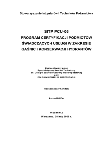 Stowarzyszenie Inżynierów i Techników Pożarnictwa SITP PCU-06 PROGRAM CERTYFIKACJI PODMIOTÓW ŚWIADCZĄCYCH USŁUGI W ZAKRESIE GAŚNIC I KONSERWACJI HYDRANTÓW Zaakceptowany przez Specjalistyczny Komitet Techniczny ds. Usług w Zakresie Ochrony Przeciwpożarowej przy POLSKIM CENTRUM AKREDYTACJI Przewodniczący Komitetu Lucjan MYRDA Wydanie 2 Warszawa, 28 luty 2008 r. SITP PCU-06 SPIS TREŚCI 1. 2. 3. 4. ZAKRES I CEL DOKUMENTU ............................................................................ 3 PODSTAWA CERTYFIKACJI ............................................................................. 3 DEFINICJE .......................................................................................................... 3 PROCEDURA CERTYFIKACJI ........................................................................... 4 4.1. Zakres (rodzaj) certyfikowanych usług......................................................... 4 4.2. Wnioskowanie o certyfikację........................................................................ 4 4.3. Koszty certyfikacji ........................................................................................ 4 4.4. Forma i zawartość certyfikatu ...................................................................... 5 4.5. Okres ważności certyfikatu .......................................................................... 5 4.6. Rozszerzenie zakresu certyfikacji................................................................ 5 4.7. Zawieszanie certyfikacji ............................................................................... 5 4.8. Cofnięcie certyfikacji .................................................................................... 5 4.9. Ograniczenie zakresu certyfikacji ................................................................ 5 4.10. Wygaśnięcie certyfikacji .............................................................................. 6 5. WARUNKI PRZYZNANIA CERTYFIKACJI......................................................... 6 5.1. Wymagania ogólne ...................................................................................... 6 5.1.1. Wymagane dokumenty formalne ...................................................................6 5.1.2. Wymagane dokumenty merytoryczne............................................................6 5.2. Organizacja firmy......................................................................................... 7 5.2.1. Odpowiedzialność za jakość usług ................................................................7 5.2.2. Wyposażenie firmy.........................................................................................7 5.2.3. Dokumentacja ................................................................................................7 5.3. Personel firmy certyfikowanej ...................................................................... 7 5.3.1. Postanowienia ogólne ....................................................................................7 5.3.2. Liczba pracowników .......................................................................................7 5.3.3. Kwalifikacje pracowników...............................................................................8 5.3.4. Szkolenia........................................................................................................8 6. 7. 8. 9. 10. 5.4. System jakości............................................................................................. 8 5.5. Dokumentacja wykonawcza......................................................................... 8 5.6. Rejestr usług................................................................................................ 8 5.7. Audyty i przeglądy ....................................................................................... 9 5.8. Serwis .......................................................................................................... 9 5.9. Ubezpieczenie ............................................................................................. 9 5.10. Reklamacje .................................................................................................. 9 5.11. Inne wymagania........................................................................................... 9 PROCEDURY KONTROLI GAŚNIC I HYDRANTÓW ....................................... 10 REKLAMA ......................................................................................................... 10 ODPOWIEDZIALNOŚĆ ..................................................................................... 11 SPRAWY SPORNE ........................................................................................... 11 ZAŁĄCZNIKI...................................................................................................... 11 Wydanie 2 z 28.02.2008 r. Str. 2/17 SITP PCU-06 1. ZAKRES I CEL DOKUMENTU W niniejszym dokumencie zawarto podstawowe wymagania i procedury, które powinna spełnić Firma usługowa podmiot usługowy świadcząca usługi w zakresie instalacji i konserwacji gaśnic przenośnych i przewoźnych oraz konserwacji hydrantów, poddająca się dobrowolnej certyfikacji. Certyfikat uzyskany w wyniku poddania się Firmy opisanym w niniejszym dokumencie procedurom jest potwierdzeniem zweryfikowania Firmy pod kątem jej wiarygodności i kompetencji do świadczenia dobrej jakości usług (według aktualnego stanu wiedzy) w określonym przez certyfikat zakresie. Usługa zabezpieczenia przeciwpożarowego (projekt, wykonawstwo i konserwacja instalacji), wykonana w obiekcie przez firmę certyfikowaną, może być podstawą wystąpienia przez właściciela obiektu o udzielenie zniżki w ubezpieczeniu obiektu od ognia. 2. PODSTAWA CERTYFIKACJI Podstawą certyfikacji usług w zakresie instalacji i konserwacji gaśnic przenośnych i przewoźnych oraz konserwacji hydrantów są wymagania przepisów przeciwpożarowych i stosownych norm. 3. DEFINICJE W nin