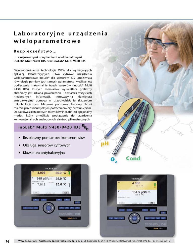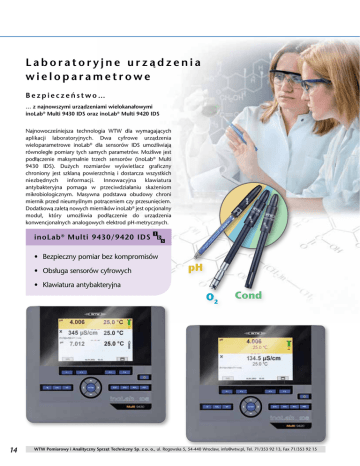 Laboratoryjne urządzenia wieloparametrowe Bezpieczeństwo… … z najnowszymi urządzeniami wielokanałowymi inoLab® Multi 9430 IDS oraz inoLab® Multi 9420 IDS Najnowocześniejsza technologia WTW dla wymagających aplikacji laboratoryjnych. Dwa cyfrowe urządzenia wieloparametrowe inoLab® dla sensorów IDS umożliwiają równoległe pomiary tych samych parametrów. Możliwe jest podłączenie maksymalnie trzech sensorów (inoLab® Multi 9430 IDS). Dużych rozmiarów wyświetlacz graficzny chroniony jest szklaną powierzchnią i dostarcza wszystkich niezbędnych informacji. Innowacyjna klawiatura antybakteryjna pomaga w przeciwdziałaniu skażeniom mikrobiologicznym. Masywna podstawa obudowy chroni miernik przed nieumyślnym potrąceniem czy przesunięciem. Dodatkową zaletą nowych mierników inoLab® jest opcjonalny moduł, który umożliwia podłączenie do urządzenia konwencjonalnych analogowych elektrod pH-metrycznych. inoLab ® Multi 9430/9420 IDS • Bezpieczny pomiar bez kompromisów • Obsługa sensorów cyfrowych pH • Klawiatura antybakteryjna O2 14 Cond WTW Pomiarowy i Analityczny Sprzęt Techniczny Sp. z o. o., ul. Rogowska 5, 54-440 Wrocław, [email protected], Tel. 71/353 92 13, Fax 71/353 92 15 Pomiary wieloparametrowe Parametr 0 1 0 1 1 1 1 0 1 0 1 1 1 1 0 0 0 1 1 1 0 0 1 1 0 1 1 0 0 1 0 1 1 1 1 0 0 0 1 1 1 0 0 1 1 0 1 1 0 0 0 1 0 1 1 1 1 0 0 0 0 1 0 1 1 1C1 0y0f0r 1o1 1 0w0e1 1 0m 1 1 0i 1e1 0r 0n1 i1 0k1i1 0l1 1a1 0b0o1 1 r0a1 0t 1o0 r0y1 0j 1n1 1 1e0 0 0 1 1 1 0 0110111100011100110110111100011010111101011110001110011011001011110001110011011000101111000010111100011100110110110011 111001101010010111100011100110110111100011100110110111100011100110110100101111000111001101101001011110010111011110001110 0110110001110011010111100101111010111100011100110110010111100011100110110001011110000101111000111001101101100110110111 Stabilność pomiarowa 010100101111000111001101101111000111001101101111000110101111010111100011100110110010111100011100110110001011110000101 • Brak błędów dzięki cyfrowej obróbce i transmisji sygnałów 0011100110110110011011011100110101001011110001110011011011110001110011011011110001110011011010010111100011100110110100 oraz danych kalibracyjnych przechowywanych 1110010111011110001110011011011000111001101011110001110011011001100111001101100101111000101111000111001101100111001101 w sensorach. 1011110001110011011001011110001110011011010011011010010111100011100110110100101111001011101111000111001101101100011100 1 0 1 1 1 1 0 0 kontroli 0 1 1 1 0 0 1 1 0 QSC 1 1 0 0 1 1 0bardzo 0 1 1 1 0 0 1 1precyzyjnie 0 1 1 0 0 1 0 1 1 1 1 0 0 0 1 0 1 1 1 1 0 0 0 1 1 1 0 0 1 1 0O 1 1 0 0 1pH 1 1 0 0 1 1 Cond 0110010111100011100110110010111100011100110 • Inteligentna funkcja 0 1 1 1 1 0sensora 1 0 1 1 1 1 0 0i 0zwiększa 1 1 1 0 0 1 1 0 1 niezawodność. 100101111000111001101100010111100001011110001110011011011001101101110011010100101111000111001 informuje o stanie 0111100011100110110111100011100110110100101111000111001101101001011110010111011110001110011011011000111001101011110001 • Funkcja CMC umożliwia kontrolowanie idealnego zakresu 1 1 0 1 1 0 0 1 1 0 0 1 1 1 0 0 1 1 0 1 1 0 0 1 0 1 1 1 1 0 0 0 1 0 1 1 1 1 0 0 0 1 1 1 0 0 1 1 0 1 1 0 0 1 1 1 0 0 1 1 0 1 1 0 0O1 0 1 1 1 1pH 0 0 0 1 1 1 Cond 00110110010111100011100110110 0011100110 pomiarowego i pomaga w prawidłowym wykonywaniu 011001110011011001011110001011110001110011011001110011011001011110001110011011001011110001110011011010011011010010111 pomiarów. 0111001101101001011110010111011110001110011011011000111001101011110001110011011001100111001101100101111000101111000111 0 1 1 0 0 1 1parametrów 1 0 0 1 1 0 1 1 0 0 1 0i 1kanałów 1 1 1 0 0 0 1 1 1 pomiarowych 001001011110001110011011000101111000010111100011100110110110011011011100110101001011110 • Wizualna prezentacja 1 1 1 0 0wygodę 1 1 0 1 1 0 1 1 1 1 i0ułatwia 0 0 1 1 1 0 0pracę. 1101101111000111001101101001011110 0011100110110100101111001101100101111000111001101101 00111001 znacznie zwiększa 01001011110011011001011110 0101111010111100011100110110010111100011100110110001011110000101111000111001101101100110110 011010100101111000111001101101111000111001101101111000110101111010111100011100110110010111100011100110110001011110000 1 0 0 0 1 1 z1 0GLP/AQA 01101101100110110111001101010010111100011100110110111100011100110110111100011100110110100101111000111001101101 Dokumentacja zgodna 01111001011101111000111001101101100011100110101111001011110101111000111001101100101111000111001101100010111100001011110 • Automatyczny zapis wszystkich danych sensora pozwala 110011011011001101101110011010100101111000111001101101111000111001101101111000110101111010111100011100110110010111100011 na precyzyjne zidentyfikowanie poprawności danych 1101100010111100001011110001110011011011001101101110011010100101111000111001101101111000111001101101111000111001101101 i pomiarów. 0111100011100110110100101111001011101111000111001101101100011100110101111000111001101100110011100110110010111100010111 1 1 1 1 0 1 0 1 1 1 1 0 0 0 1 1 1 0 0zwiększa 1 1 0 1 1 0 0 1 0 1 1kontrolę 1 1 0 0 0 1 1 1 0 0nad 110110001011110000101111000111001101101100110110111001101010010111100011100110 • Zarządzanie użytkownikami 1 1 1 0 0pracami 0 1 1 1 0 0 1 1 0 1 1i0 1 1umożliwia 1 1 0 0 0 1 1 0 1 0 1 1 1 1przypisanie 0101111000111001101100101111000111001101100010111100001011110001110011011011001101101 wykonywanymi 1 1 0 1 0 1 0 0osobie. 101111000111001101101111000111001101101111000111001101101001011110001110011011010010111100101110111100011100110 pomiarów konkretnej 1100011100110101111001011110101111000111001101100101111000111001101100010111100001011110001110011011011001101101110011 • Przesyłanie danych w formacie .csv do programu Excel 1001011110001110011011011110001110011011011110001101011110101111000111001101100101111000111001101100010111100001011110 przez interfejs USB, lub zawarte w dostawie 1100110110110011011011100110101001011110001110011011011110001110011011011110001110011011010010111