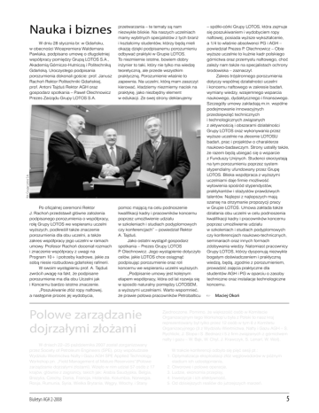 Nauka i biznes Po oficjalnej ceremonii Rektor J. Rachoń przedstawił główne założenia podpisanego porozumienia o współpracy, rolę Grupy LOTOS we wspieraniu uczelni wyższych, podkreślił także znaczenie porozumienia dla obu uczelni, a także zakres współpracy jego uczelni w ramach umowy. Profesor Rachoń doceniał rozmach i znaczenie współpracy z uwagi na Program 10+ i potrzeby kadrowe, jakie za sobą niesie rozbudowa gdańskiej rafinerii. W swoim wystąpieniu prof. A. Tajduś zwrócił uwagę na fakt, że podpisane porozumienie ma dla obu Uczelni jak i Koncernu bardzo istotne znaczenie. „Poszukiwanie złóż ropy naftowej, a następnie proces jej wydobycia, pomoc mającą na celu podnoszenie kwalifikacji kadry i pracowników koncernu poprzez umożliwienie udziału w szkoleniach i studiach podyplomowych czy konferencjach” – powiedział Rektor A. Tajduś. Jako ostatni wystąpił gospodarz spotkania – Prezes Grupy LOTOS P. Olechnowicz. Jego wystąpienie dotyczyło celów, jakie LOTOS chce osiągnąć podpisując porozumienie oraz roli koncernu we wspieraniu uczelni wyższych. „Podpisanie umowy jest kolejnym etapem współpracy, która od lat rozwija się w sposób naturalny pomiędzy LOTOSEM, a wyższymi uczelniami. Warto wspomnieć, że prawie połowa pracowników Petrobalticu fot. Grupa Lotos S.A. W dniu 28 stycznia br. w Gdańsku, w obecności Wicepremiera Waldemara Pawlaka, podpisano umowę o długoletniej współpracy pomiędzy Grupą LOTOS S.A., Akademią Górniczo-Hutniczą i Politechniką Gdańską. Uroczystego podpisania porozumienia dokonali goście: prof. Janusz Rachoń Rektor Politechniki Gdańskiej, prof. Antoni Tajduś Rektor AGH oraz gospodarz spotkania – Paweł Olechnowicz Prezes Zarządu Grupy LOTOS S.A. przetwarzania – te tematy są nam niezwykle bliskie. Na naszych uczelniach mamy wybitnych specjalistów z tych branż i kształcimy studentów, którzy będą mieli okazję dzięki podpisanemu porozumieniu odbywać praktyki w Grupie LOTOS. To niezmiernie istotne, bowiem dobry inżynier to taki, który nie tylko ma wiedzę teoretyczną, ale przede wszystkim praktyczną. Porozumienie właśnie to zapewnia. Na uczelni, którą mam zaszczyt kierować, kładziemy niezmierny nacisk na praktykę, jako niezbędny element w edukacji. Ze swej strony deklarujemy Polowe zarządzanie dojrzałymi złożami W dniach 22 – 25 października 2007 został zorganizowany przez Society of Petroleum Engineers (SPE), przy współudziale Wydziału Wiertnictwa Nafty i Gazu AGH SPE Applied Technology Workshop pn. „Field Management of Mature Reservoirs”(Polowe zarządzanie dojrzałymi złożami). Wzięło w nim udział 57 osób z 17 krajów, głównie z zagranicy, takich jak: Arabia Saudyjska, Belgia, Brazylia, Czechy, Dania, Francja, Holandia, Kolumbia, Norwegia, Rosja, Rumunia, Syria, Wielka Brytania, Węgry, Włochy, i Stany Biuletyn AGH 2-2008 – spółki-córki Grupy LOTOS, która zajmuje się poszukiwaniem i wydobyciem ropy naftowej, posiada wyższe wykształcenie, a 1/4 to właśnie absolwenci PG i AGH – powiedział Prezes P. Olechnowicz – Obie wyższe uczelnie to kuźnie kadr polskiego górnictwa oraz przemysłu naftowego, choć zależy nam także na specjalistach ochrony środowiska – zaznaczył. Zakres trójstronnego porozumienia dotyczy wspólnej działalności uczelni i koncernu naftowego w zakresie badań, wymiany wiedzy, wzajemnego wsparcia naukowego, dydaktycznego i finansowego. Szczegóły umowy zakładają m.in. wspólne podejmowanie innowacyjnych przedsięwzięć technicznych i technologicznych związanych z aktywnością i obszarami działalności Grupy LOTOS oraz wykonywania przez wyższe uczelnie na zlecenie LOTOSU badań, prac i projektów o charakterze naukowo-badawczym. Strony ustaliły także, że razem będą ubiegać się o wsparcie z Funduszy Unijnych. Studenci skorzystają na tym porozumieniu poprzez system stypendialny ufundowany przez Grupę LOTOS. Bliska współpraca z wyższymi uczelniami daje firmie możliwość wyłowienia spośród stypendystów, praktykantów i stażystów prawdziwych talentów. Najlepsi z najlepszych mają szansę na otrzymanie propozycji pracy w Grupie LOTOS. Umowa zakłada także działania obu uczelni w celu podnoszenia kwalifikacji kadry i pracowników koncernu poprzez umożliwienie udziału w szkoleniach i studiach podyplomowych czy konferencjach naukowo-technicznych, seminariach oraz innych formach zdobywania wiedzy. Natomiast pracownicy Grupy LOTOS, którzy dysponują niezwykle bogatym doświadczeniem i praktyczną wiedzą, będą, zgodnie z porozumieniem, prowadzić zajęcia praktyczne dla studentów AGH i PG w oparciu o zasoby techniczne oraz instalacje technologiczne koncernu. Maciej Okoń Zjednoczone. Pomimo, że większość osób w Komitecie Organizacyjnym tego Workshop’u była z Polski to nasz kraj reprezentowany był tylko przez 12 osób w tym 8 z Komitetu Organizacyjnego (3 z Wydziału Wiertnictwa, Nafty i Gazu AGH – S. Rychlicki, J. Stopa i S .Bednarz i 5 z firm związanych z górnictwem nafty i gazu – W. Bąk, W. Chyl, J. Krawczyk, S. Lenart, W. Weil). W trakcie konferencji odbyło się pięć sesji pt.: 1. Optymalizacja eksploatacji złóż węglowodorów w późnym stadium ich udostępniania, 2. Otworowe i polowe operacje, 3. Ludzie, ekonomia przepisy, 4. Inwestycje i ich efektywność, 5. Od dzisiejszych realiów do jutrzejszych marzeń. 5