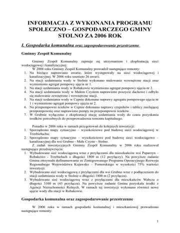 INFORMACJA Z WYKONANIA PROGRAMU SPOŁECZNO – GOSPODARCZEGO GMINY STOLNO ZA 2006 ROK I. Gospodarka komunalna oraz zagospodarowanie przestrzenne Gminny Zespół Komunalny Gminny Zespół Komunalny zajmuje się utrzymaniem i eksploatacją sieci wodociągowej i kanalizacyjnej. W 2006 roku Gminny Zespół Komunalny prowadził następujące remonty: 1. Na bieżąco naprawiano awarie, które występowały na sieci wodociągowej i kanalizacyjnej. W 2006 roku usunięto 26 awarii. 2. Na stacji uzdatniania wody w Stolnie wykonano malowanie wewnętrzne stacji oraz wymieniono agregat pompowy ujęcia nr 1. 3. Na stacji uzdatniania wody w Robakowie wymieniono agregat pompowy ujęcia nr 2. 4. Na stacji uzdatniania wody w Małem Czystem naprawiono poszycie dachowe i odbyło się malowanie zewnętrzne i wewnętrzne stacji. 5. Na stacji uzdatniania wody w Cepnie dokonano naprawy agregatu pompowego ujęcia nr 1 i wymieniono agregat pompowy ujęcia nr 2. 6. Na przepompowni ścieków w Cepnie dokonano naprawy czujników i tablicy zasilającej przepompownię oraz naprawiono pompy na przepompowni ścieków. 7. W Grubnie wyłączono z eksploatacji stację uzdatniania wody do czasu pozyskania środków potrzebnych do przeprowadzenia remontu kapitalnego. Ponadto w 2006 roku w ramach przygotowań do kolejnych inwestycji: 1. Sporządzono mapy sytuacyjno – wysokościowe pod budowę sieci wodociągowej w Trzebiełuchu; 2. Sporządzono mapy sytuacyjno – wysokościowe pod budowę sieci wodociągowo – kanalizacyjnej dla wsi Grubno - Małe Czyste - Stolno. Z zadań inwestycyjnych Gminny Zespół Komunalny w 2006 roku realizował następujące przedsięwzięcia: 1. Wybudowano sieć wodociągową wraz z przyłączami dla mieszkańców wsi Paparzyn – Robakowo - Trzebiełuch o długości 1800 m (12 przyłączy). Na powyższe zadanie Gmina otrzymała dofinansowanie ze Zintegrowanego Programu Operacyjnego Rozwoju Regionalnego Województwa Kujawsko – Pomorskiego w wysokości 75% wartości inwestycji. 2. Wybudowano sieć wodociągową z przyłączami dla wsi Grubno wraz z podłączeniem do stacji uzdatniania wody w Stolnie o długości 1800 m (2 przyłącza). 3. Wybudowano sieć wodociągową wraz z przyłączami dla mieszkańców Wabcza o długości 3100 m (43 przyłącza). Na powyższe zadanie Gmina pozyskała środki z Agencji Nieruchomości Rolnych. W ramach tej inwestycji wykonano również nowe ujęcie wody dla stacji w Robakowie. Gospodarka komunalna oraz zagospodarowanie przestrzenne W 2006 roku w ramach gospodarki komunalnej i mieszkaniowej prowadzono następujące remonty: 1 • • • Wykonano remont połączony z modernizacją świetlicy wiejskiej wraz z zakupem wyposażenia w miejscowości Wabcz. Inwestycja ta otrzymała dofinansowanie w ramach Sektorowego Programu Operacyjnego Działanie 2.3. Odnowa Wsi i Ochrona dziedzictwa kulturowego; Wykonano remont połączony z modernizacją boiska sportowego i świetlicy wiejskiej oraz zakup sprzętu w miejscowości Cepno. Inwestycja ta otrzymała dofinansowanie w ramach Sektorowego Programu Operacyjnego Działanie 2.3. Odnowa Wsi i Ochrona dziedzictwa kulturowego; przy udziale stowarzyszenia Polski Komitet Pomocy Społecznej Zarząd Gminny w Stolnie, które otrzymało dofinansowanie od Wojewody Kujawsko – Pomorskiego dokonano remontu lokalu socjalnego w Pałacu w Klęczkowie (wymiana okien i drzwi, zakup pieca, zakup materiałów budowlanych – do odświeżenia pomieszczenia) z przeznaczeniem dla osoby bezdomnej lub zagrożonej bezdomnością z terenu Gminy Stolno. W ramach działań z zakresu zagospodarowania przestrzennego Gminy Stolno w 2006 roku: w pierwszym półroczu przystąpiono do wykonania miejscowego planu zagospodarowania przestrzennego dla części wsi Grubno pod obwodnicę dla miasta Chełmna. Postępowanie zostało jednak wstrzymane do czasu ostatecznego ustalenia przebiegu obwodnicy. wykonano 56 decyzji o warunkach zabudowy na indywidualne wnioski mieszkańców Gminy. II. Gospodarka gruntami i nieruchomościami Stan gruntów komunalnych na dzień 01.01.2006 r. wynosił 199,9669 ha, w tym grunty zabudowane, niezabudowane, drogi i rowy. W 2006 roku realizowano następujące zadania: 1. Dokończono podjętą w 2005 r. procedurę sprzedaży działki rolnej o pow. 0,232 ha w miejscowości Małe Czyste z przeznaczeniem na poprawę warunków zagospodarowania nieruchomości sąsiedniej stanowiącej własność nabywcy - akt notarialny nr 2776/2006 z dnia 13.06.2006 r. 2. W celu sprzedaży, dokonano podziału geodezyjnego działki budowlanej o powierzchni 0,7807 ha w Wabczu na 6 działek zgodnie z miejscowym planem zagospodarowania przestrzennego dla tego terenu (z przeznaczeniem pod budownictwo mieszkaniowo – usługowe). Następnie w drodze I przetargu w dniu 19.12.2006 r. dokonano sprzedaży 3 działek budowlanych. Przewidywany termin zawarcia aktu notarialnego – styczeń 2007 r. Na pozostałe 3 działki przetarg nie doszedł do sutku z uwagi na brak chętnych nabywców. Przewidywany termin II przetargu na sprzedaż przedmiotowych działek I półrocze 2007 r. 3. Aktem notarialnym Nr 2769/2006r z dnia 5.04.2006 r. dokonano przejęcia na własność Gminy na podstawie zrzeczenia się własności działki o powierzchni 50 m 2 w miejscowości Małe Czyste z przeznaczeniem na poszerzenie drogi gminnej. 4. Dokonano sprzedaży w drodze bezprzetargowej, na wniosek zainteresowanego działki rolnej o pow. 1000 m2 (zasypany rów melioracyjny) położonej we wsi Paparzyn z przeznaczeniem na dołączenie do przyległych nieruchomości, w celu poprawy warunków ich zagospodarowania, stanowiących własność nabywcy (akt notarialny nr 2135/2006 z dnia 8.05.2006 r.). 5. Dokonano sprzedaży na rzecz najemcy: lokalu mieszkalnego nr 1 w budynku Nr 16 w Wichorzu wraz z przynależnościami i ułamkową częścią gruntu o pow.1450 m2 w 2 działce nr 46 we wsi Wichorze - sprzedaż w/w lokalu nastąpiła w formie ratalnej (akt notarialny Nr 361/2006 z dnia 31.01.2006