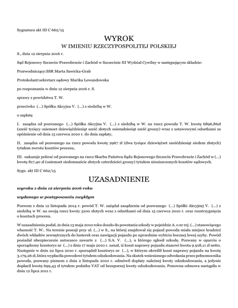 Sygnatura akt III C 662/15 WYROK W IMIENIU RZECZYPOSPOLITEJ POLSKIEJ S., dnia 12 sierpnia 2016 r. Sąd Rejonowy Szczecin-Prawobrzeże i Zachód w Szczecinie III Wydział Cywilny w następującym składzie: Przewodniczący:SSR Marta Sawicka-Grab Protokolant:sekretarz sądowy Marika Lewandowska po rozpoznaniu w dniu 12 sierpnia 2016 r. S. sprawy z powództwa T. W. przeciwko (...) Spółka Akcyjna V. (...) z siedzibą w W. o zapłatę I. zasądza od pozwanego (...) Spółka Akcyjna V. (...) z siedzibą w W. na rzecz powoda T. W. kwotę 6896,86zł (sześć tysięcy osiemset dziewięćdziesiąt sześć złotych osiemdziesiąt sześć groszy) wraz z ustawowymi odsetkami za opóźnienie od dnia 15 czerwca 2010 r. do dnia zapłaty, II. zasądza od pozwanego na rzecz powoda kwotę 2967 zł (dwa tysiące dziewięćset sześćdziesiąt siedem złotych) tytułem zwrotu kosztów procesu, III. nakazuje pobrać od pozwanego na rzecz Skarbu Państwa Sądu Rejonowego Szczecin Prawobrzeże i Zachód w (...) kwotę 817,40 zł (osiemset siedemnaście złotych czterdzieści groszy) tytułem nieuiszczonych kosztów sądowych. Sygn. akt III C 662/15 UZASADNIENIE wyroku z dnia 12 sierpnia 2016 roku wydanego w postępowaniu zwykłym Pozwem z dnia 12 listopada 2014 r. powód T. W. zażądał zasądzenia od pozwanego (...) Spółki Akcyjnej V. (...) z siedzibą w W. na swoją rzecz kwoty 5100 złotych wraz z odsetkami od dnia 15 czerwca 2010 r. oraz rozstrzygnięcia o kosztach procesu. W uzasadnieniu podał, że dnia 13 maja 2010 roku doszło do powstania szkody w pojeździe A. o nr rej. (...) stanowiącego własność T. W.. Na terenie posesji przy ul. (...) w S., na której znajdował się pojazd powoda miała miejsce kradzież dwóch wkładów zewnętrznych do lusterek oraz nawigacji pojazdu po uprzednim wybiciu bocznej lewej szyby. Powód posiadał ubezpieczenie autocasco zawarte z (...) S.A. V. (...), u którego zgłosił szkodę. Pozwany w oparciu o sporządzony kosztorys nr (...) z dnia 17 maja 2010 r. uznał, iż koszt naprawy pojazdu stanowi kwota 9.918,11 zł netto. Następnie w dniu 22 lipca 2010 r. sporządził kosztorys nr (...), w którym określił koszt naprawy pojazdu na kwotę 3.179,26 zł, która wypłaciła powodowi tytułem odszkodowania. Na skutek wniesionego odwołania przez pełnomocnika powoda, pozwany pismem z dnia 2 listopada 2010 r. odmówił dopłaty należnej kwoty odszkodowania, a jedynie dopłacił kwotę 699,43 zł tytułem podatku VAT od bezspornej kwoty odszkodowania. Ponowna odmowa nastąpiła w dniu 12 lipca 2011 r. Powód podał, że w dniu 22 lipca 2013 r. powód złożył wniosek o zawezwanie do próby ugodowej z udziałem ubezpieczyciela. Do zawarcia ugody nie doszło. Dochodzona kwota 5100 zł stanowi częściową kompensatę za poniesioną szkodę majątkową przysługującą na podstawie zawartej z pozwaną umową ubezpieczenia komunikacyjnego z dnia 18 grudnia 2009 r. Odszkodowanie należne jest w kwocie brutto. Nakazem zapłaty z dnia 29 grudnia 2014 r. Sąd Rejonowy Szczecin-Prawobrzeże i Zachód w Szczecinie orzekł o obowiązku zapłacenia przez pozwanego na rzecz powoda kwoty 5100 zł wraz z odsetkami oraz kosztami procesu w tym kosztami wywołanymi próba ugodową w postępowaniu o sygn. akt VI Co 3404/13 ( k. 42). Powyższemu nakazowi zapłaty pozwany sprzeciwił się, zaskarżając go w całości. Wniósł o oddalenie powództwa oraz podniósł, że wartość odszkodowania zgodnie z Ogólnymi Warunkami Ubezpieczenia ustala na podstawie metody kosztorysowej lub oryginalnych faktur i rachunków dokumentujących naprawę pojazdu. Kwota przyznanego i wypłaconego odszkodowania odpowiada rozmiarom szkody majątkowej i stanowi pełną kompensatę szkody ( k. 46-51). W toku procesu obie strony podtrzymały dotychczasowe stanowiska. Sąd ustalił następujący stan faktyczny: Dnia 13 maja 2010 r. przy ul. (...) w S. z samochodu A. o nr rej (...) należącego do T. W. po wybiciu bocznej lewej szyby skradziono dwa wkłady zewnętrzne do lusterek oraz nawigację pojazdu - radio. Okoliczność bezsporna Powód w dniu 18 grudnia 2009 r. zawarł umowę ubezpieczenia autocasco o numerze (...) z (...) S.A. V. (...) na okres od 19 grudnia 2009 r. do 18 grudnia 2010 r. Polisa została wykupiona z pełnym zakresem ubezpieczenia, udziałem własnym w szkodach częściowych i amortyzacją części. Spółka (...) S.A. V. (...) została przejęta przez (...) Spółki Akcyjnej V. (...) z siedzibą w W., u którego powód w dniu 14 maja 2010 r. zgłosił szkodę. Okoliczność bezsporna, a nadto dowód: -umowa ubezpieczenia z dnia 18 grudnia 2009 r. k.14 Wedle § 21 ust. 1 ogólnych warunków ubezpieczenia pojazdów lądowych (autocasco) z klauzulą ochrony prawnej (...) ustala wysokość odszkodowania za szkody zgodnie z dyspozycją Ubezpieczonego lub osoby przez niego upoważnionej na podstawie wyceny (...) (metoda kosztorysowa) lub na podstawie oryginalnych faktur i rachunków dokumentujących usługę naprawy uszkodzonego pojazdu. Wedle § 21 ust. 7 OWU w przypadku, gdy wysokość szkody ustalana jest na podstawie wyceny ( metoda kosztorysowa), (...) ustala wysokość szkody z uwzględnieniem aktualnie obowiązujących przepisów o podatku od towarów i usług ( VAT) , w oparciu o: 1) ceny materiałów i części zamiennych oraz istniejących części zamiennych o porównywalnej jakości , dystrybuowanych w sieciach funkcjonujących poza siecią oficjalnego producenta/ importera pojazdu, o których mowa w rozporządzeniu Rady Ministrów z dnia 28 stycznia 2003 r. w sprawie wyłączenia określonych porozumień wertykalnych w sektorze pojazdów samochodowych spod zakazu porozumień ograniczających konkurencję, 2) systemu kosztorysowania Audatex lub Eurotax dla wymiaru robocizny, 3) średnie stawki dla robocizny, ustalone przez (...) w oparciu o średnie ceny usług stosowane na terenie gdzie szkoda jest likwidowana, nie wyższe jednaj od stawek stosowanych przez oficjalnych przed