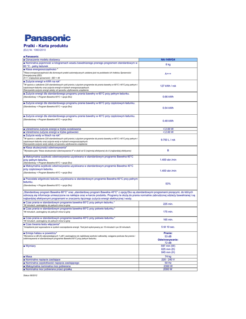 Pralki - Karta produktu (EU) Nr. 1060/2010 ■ Panasonic ■ Oznaczenie modelu dostawcy ■ Nominalna pojemność w kilogramach wsadu bawełnianego pranego programem standardowym w 60 °C - pełny ładunek ■ Klasa energooszczędności * *Klasa energooszczędności dla domowych pralek automatycznych ustalana jest na podstawie ich Indeksu Sprawności Energetycznej (EEI). A+++ (najwyższa sprawność) : EEI < 46 ■ Zużycie energii w kWh na rok* *W oparciu o założenie 220 standardowych cykli prania z użyciem programów do prania bawełny w 60°C i 40°C przy pełnym i częściowym ładunku oraz zużycia energii w trybach energooszczędnych. Rzeczywiste zużycie energii zależy od sposobu użytkowania urządzenia NA-148VG4 8 kg A+++ 127 kWh / rok ■ Zużycie energii dla standardowego programu prania bawełny w 60°C przy pełnym ładunku. (Standardowy = Program Bawełna 60°C + opcja Eko) 0.66 kWh ■ Zużycie energii dla standardowego programu prania bawełny w 60°C przy częściowym ładunku. (Standardowy = Program Bawełna 60°C + opcja Eko) 0.54 kWh ■ Zużycie energii dla standardowego programu prania bawełny w 40°C przy częściowym ładunku. (Standardowy = Program Bawełna 40°C + opcja Eko) ■ Uśrednione zużycie energii w trybie oczekiwania ■ Uśrednione zużycie energii w trybie gotowości ■ Zużycie wody w litrach na rok* *W oparciu o założenie 220 standardowych cykli prania z użyciem programów do prania bawełny w 60°C i 40°C przy pełnym i częściowym ładunku oraz zużycia wody w trybach energooszczędnych. Rzeczywiste zużycie wody zależy od sposobu użytkowania urządzenia ■ Klasa skuteczności odwirowywania* *Wyrażana jako "klasa skuteczności odwirowywania X" w skali od G (najmniej efektywne) do A (najbardziej efektywne) ■ Maksymalna szybkość odwirowywania uzyskiwana w standardowym programie Bawełna 60°C przy pełnym ładunku. 0.48 kWh <2.00 W <2.00 W 9.750 L / rok B 1.400 obr./min (Standardowy = Program Bawełna 60°C + opcja Eko) ■ Maksymalna szybkość odwirowywania uzyskiwana w standardowym programie Bawełna 40°C przy częściowym ładunku. (Standardowy = Program Bawełna 40°C + opcja Eko) ■ Pozostała wilgotność ładunku uzyskiwana w standardowym programie Bawełna 60°C przy pełnym ładunku. (Standardowy = Program Bawełna 60°C + opcja Eko) 1.400 obr./min 53% „Standardowy program Bawełna 60°C” oraz „standardowy program Bawełna 40°C” z opcją Eko są standardowymi programami piorącymi, do których odnoszą się informacje umieszczone na naklejce oraz w karcie produktu. Programy te służą do prania normalnie zabrudzonej odzieży bawełnianej i są najbardziej efektywnymi programami w znaczeniu łącznego zużycia energii elektrycznej i wody. ■ Czas prania w standardowym programie bawełna 60°C przy pełnym ładunku.* *W minutach, zaokrąglony do pełnych minut w górę 225 min. ■ Czas prania w standardowym programie bawełna 60°C przy połowie ładunku.* *W minutach, zaokrąglony do pełnych minut w górę ■ Czas prania w standardowym programie bawełna 40°C przy połowie ładunku.* *W minutach, zaokrąglony do pełnych minut w górę 175 min. 165 min. ■ Czas trwania testu włączenia* *Urządzenie jest wyposażone w system oszczędzania energii. Test jest wykonywany po 10 minutach i po 30 minutach. ■ Emisja hałasu w powietrzu* *Wyrażona w dB (A) odpowiadających 1 pW i zaokrąglona do najbliższej wartości całkowitej, osiągana podczas faz prania i odwirowywania w standardowym programie Bawełna 60°C przy pełnym ładunku. ■ Wymiary ■ Masa ■ Nominalne napięcie zasilające ■ Nominalna częstotliwość napięcia zasilającego ■ Maksymalna nominalna moc pobierana ■ Nominalna moc pobierana przez grzałkę Status 08/2012 5 till 10 sec. Pranie: 53 dB Odwirowywanie: 72 dB 597 mm (W) 625 mm (D) 845 mm (H) 74 kg 220 - 240 V 50 Hz 2350 W 2000 W