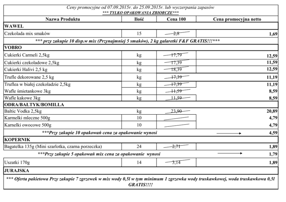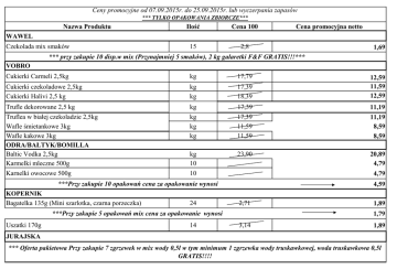 Ceny promocyjne od 07.09.2015r. do 25.09.2015r. lub wyczerpania zapasów *** TYLKO OPAKOWANIA ZBIORCZE*** Nazwa Produktu Ilość Cena 100 15 2,8 Cena promocyjna netto WAWEL Czekolada mix smaków 1,69 *** przy zakupie 10 disp.w mix (Przynajmniej 5 smaków), 2 kg galaretki F&F GRATIS!!!*** VOBRO Cukierki Carmeli 2,5kg kg 17,79 Cukierki czekoladowe 2,5kg Cukierki Halivi 2,5 kg kg kg 17,39 18,39 Trufle dekorowane 2,5 kg kg 17,39 Truflea w białej czekoladzie 2,5kg Wafle śmietankowe 3kg Wafle kakowe 3kg ODRA/BAŁTYK/BOMILLA Baltic Vodka 2,5kg Karmelki mleczne 500g kg kg kg 17,39 11,59 11,59 kg 10 23,90 Karnelki owocowe 500g 10 24 14 20,89 4,79 4,59 2,71 ***Przy zakupie 5 opakowań mix cena za opakowanie wynosi Uszatki 170g 11,19 11,19 8,59 8,59 4,79 ***Przy zakupie 10 opakowań cena za opakowanie wynosi KOPERNIK Bagatelka 135g (Mini szarlotka, czarna porzeczka) 12,59 11,59 12,59 1,89 1,79 3,14 1,89 JURAJSKA *** Oferta pakietowa Przy zakupie 7 zgrzewek w mix wody 0,5l w tym minimum 1 zgrzewka wody truskawkowej, woda truskawkowa 0,5l GRATIS!!!! KUPIEC Ryż paraboliczny 4*100g 12 3,19 2,19 Ryż naturalny brązowy 4*100g 14 3,19 2,19 Owsianki 50g mix smaków 14 1,25 0,99 Ciastka zbożowe 50g 14 1,35 1,27 ***Przy zakupie 6kart mix(owsianki i ciastek zbożowych), 1 karton Owsianki ze śliwką 50g Gratis!! Wafle ryżowe asort. 16 2,39 ***Przy zakupie 6 kart wafli, jeden karton wafli ryżowych wielozbożowych GRATIS!!1 1,95 1,67 Płatki jęczmienne błyskawiczne 400g 16 2,29 1,95 Płatki owsiane błyskawiczne 400g Płatki owsiane górskie 400g 16 16 2,29 2,29 1,95 1,95 CENOS ***Przy zakupie soli stołowej i kamiennej powyżej 0,5 palety cena wynosi Kasza gryczana 4*100g 12 4,02 ***Przy zakupie kaszy gryczanej 4*100g powyżej 5 opakowań cena wynosi Kasza gryczana biała 12 4,02 ***Przy zakupie kaszy gryczanej białej powyżej 5 opakowań cena wynosi 0,69 2,79 2,69 2,79 2,69 FOODCARE Napój energetyczny Balack 250g 24 ***Przy zakupie napoju energetycznego Black powyżej 10zgrz, 1 zgrz GRATIS!! 1,29 1,17 SOKPOL Napój GRAND jabłkowy, pomarańcz, wieloowoc. 0,2l 27 ***Przy zakupie w mix napoju GRAND 0,2l powyżej 10 zgrzewek cena wynosi 0,69 0,59 STOVIT Dżem Mirella mix smaków 260g 8 2,25 *** przy zakupie 10 zgrz.w mix., cena wynosi Dżem Stovit mix smaków 260g 8 1,65 1,60 3,29 *** przy zakupie 10 zgrz w mix., cena wynosi 2,45 2,35 GRAAL ERA RYB Paprykarz szczeciński 330g 24 ***Przy zakupie powyżej 5 opakowań cena wynosi 1,99 1,75 1,65