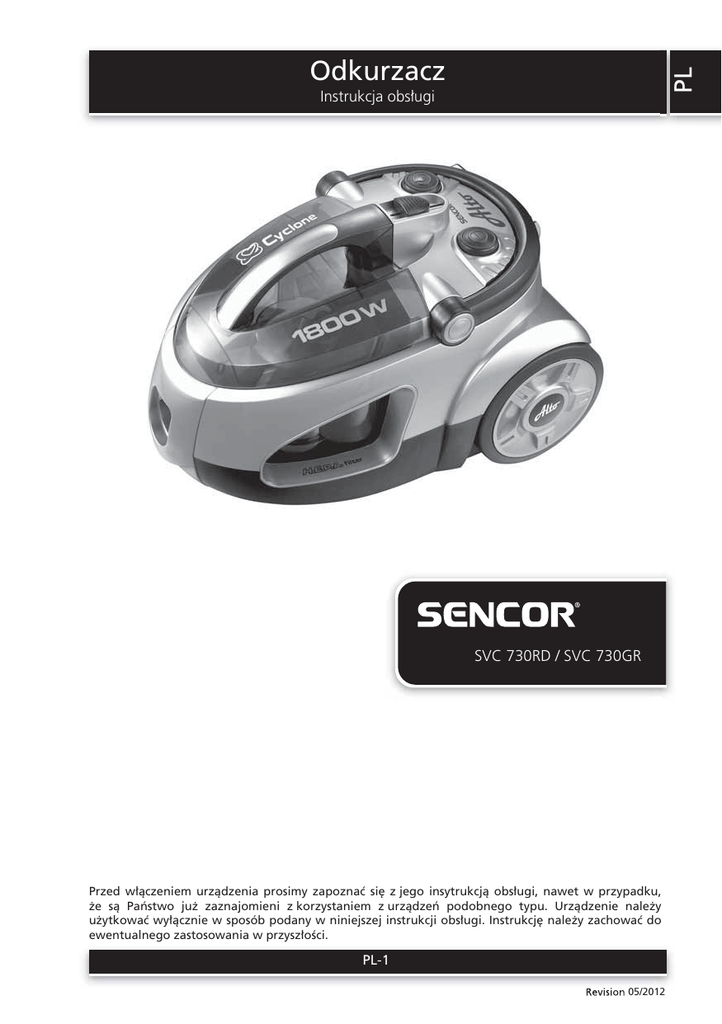 PL Odkurzacz Instrukcja obsługi SVC 730RD / SVC 730GR Przed włączeniem urządzenia prosimy zapoznać się z jego insytrukcją obsługi, nawet w przypadku, że są Państwo już zaznajomieni z korzystaniem z urządzeń podobnego typu. Urządzenie należy użytkować wyłącznie w sposób podany w niniejszej instrukcji obsługi. Instrukcję należy zachować do ewentualnego zastosowania w przyszłości. PL-1 05/2012 PL Odkurzacz SVC 730RD / SVC 730GR SPIS TREŚCI WAŻNE UWAGI. . . . . . . . . . . . . . . . . . . . . . . . . . . . . . . . . . . . . . . . . . . . . . . . . . . . . . . . . . . . . . . . . . . . . . . 2 OPIS ODKURZACZA . . . . . . . . . . . . . . . . . . . . . . . . . . . . . . . . . . . . . . . . . . . . . . . . . . . . . . . . . . . . . . . . . . . 3 BUDOWA ODKURZACZA . . . . . . . . . . . . . . . . . . . . . . . . . . . . . . . . . . . . . . . . . . . . . . . . . . . . . . . . . . . . . . . 4 ODKURZANIE . . . . . . . . . . . . . . . . . . . . . . . . . . . . . . . . . . . . . . . . . . . . . . . . . . . . . . . . . . . . . . . . . . . . . . . . 4 SKŁADANIE ODKURZACZA I JEGO WYPOSAŻENIA . . . . . . . . . . . . . . . . . . . . . . . . . . . . . . . . . . . . . . . . . . 5 KONSERWACJA I CZYSZCZENIE . . . . . . . . . . . . . . . . . . . . . . . . . . . . . . . . . . . . . . . . . . . . . . . . . . . . . . . . . . 5 ROZWIĄZYWANIE PROBLEMÓW . . . . . . . . . . . . . . . . . . . . . . . . . . . . . . . . . . . . . . . . . . . . . . . . . . . . . . . . 7 DANE TECHNICZNE. . . . . . . . . . . . . . . . . . . . . . . . . . . . . . . . . . . . . . . . . . . . . . . . . . . . . . . . . . . . . . . . . . . . 7 LIKWIDACJA ZUŻYTYCH URZĄDZEŃ ELEKTRYCZNYCH I ELEKTRONICZNYCH . . . . . . . . . . . . . . . . . . . . . 8 ZALECENIA I INFORMACJE O POSTĘPOWANIU ZE ZUŻYTYM OPAKOWANIEM . . . . . . . . . . . . . . . . . . . . 8 WAŻNE INSTRUKCJE DOTYCZĄCE BEZPIECZEŃSTWA 1) 2) 3) 4) 5) 6) 7) 8) 9) 10) 11) 12) 13) Zalecamy zachować oryginalny karton służący do transportu urządzenia, materiały pakunkowe, dowód sprzedaży i kartę gwarancyjną minimalnie przez okres obowiązywania gwarancji. W przypadku potrzeby prosimy o zapakowanie urządzenia do oryginalnego pudełka dostarczonego przez producenta. To urządzenie nie jest przeznaczone dla osób (łącznie z dziećmi) o obniżonych predyspozycjach fizycznych, umysłowych albo mentalnych oraz dla osób o ograniczonym doświadczeniu i wiedzy, jeżeli nie jest nad nimi sprawowany specjalny nadzór albo instrukcja nie zastrzega korzystania z tego urządzenia tylko przez osoby odpowiedzialne za ich bezpieczeństwo. Dzieci powinny znajdować się pod nadzorem, który zapewni, żeby nie bawiły się urządzeniem. Przed włączeniem urządzenia do gniazdka zasilającego sprawdzamy, czy napięcie podane na tabliczce odkurzacza zgadza się z napięciem w gniazdku. Nigdy nie używaj akcesoriów, które nie zostały dostarczone razem z niniejszym urządzeniem lub które nie są przeznaczone dla tego urządzenia. Nie spryskuj urządzenia wodą ani innym płynem. Nie wlewaj do urządzenia wody ani innych płynów. Nie zanurzaj urządzenia w wodzie lub innej cieczy. Z urządzenia nie korzystamy w pobliżu wanny i prysznica. Jeżeli urządzenie pracuje, nie wolno blokować w nim otworów do wlotu i wylotu powietrza, w przeciwnym razie może dojść do zakłócenia cyrkulacji powietrza i przegrzania silnika. Jeżeli urządzenie nie będzie używane, wyłączamy je i odłączamy od gniazdka zasilającego. Przed rozpoczęciem czyszczenia postępuj w ten sam sposób. Wessanie niżej podanych przedmiotów lub substancji może spowodować uszkodzenie urządzenia lub pokaleczenie ludzi: • woda lub inne płyny z podłogi • dowolne ostre przedmioty jak: igły, szpilki • palące się papierosy i cygara, zapałki, jakiekolwiek palne ciecze (na przykład benzyna, rozpuszczalniki itp.) • mąka, cement (ewentualnie przy wysysaniu z otworów wierconych w ścianie) Wyciąganie kabla sieciowego na siłę może spowodować jego uszkodzenie. Żeby uniknąć uszkodzenia mebli albo pokaleczenia osób, nawijamy przewód przytrzymując go w ręce. Żeby uniknąć odkształceń plastikowych elementów odkurzacza albo ich zapalenia nie wystawiamy urządzenia na bezpośrednie działanie promieniowania słonecznego, nie umieszczamy go w pobliżu grzejników, otwartego ognia i innych urządzeń albo urządzeń, które są źródłem ciepła oraz nie zostawiamy na dłużej pracującego urządzenia z zablokowanym wlotem powietrza. PL-2 05/2012 PL Odkurzacz SVC 730RD / SVC 730GR 14) Nie wciągamy większych kawałków papieru i torebek foliowych. Mogą one z łatwością zapchać rurę lub wąż. Jeśli dojdzie do jakiegokolwiek zapchania urządzenia, należy je natychmiast wyłączyć poprzez odłączenie od gniazdka sieciowego i wyczyścić zapchaną rurę lub wąż. 15) Z urządzenia nie korzystamy w bardzo zapylonym pomieszczeniu. 16) Żeby nie uszkodzić węża nie wolno na nim stawać i mocno go wyginać. Nie używaj odkurzacza ze złamanym lub uszkodzonym w inny sposób wężem. 17) Przewodu zasilającego nie wolno układać w pobliżu gorących powierzchni albo na ostrych przedmiotach. Nie kładź na kabel sieciowy ciężkich przedmiotów, umieść kabel tak, aby nie można było po nim deptać ani potknąć się o niego. Zadbaj o to, aby kabel sieciowy nie dotykał gorącej powierzchni. 18) Jeżeli przewód zasilający uległ uszkodzeniu, jego wymianę należy powierzyć serwisowi albo osobie o odpowiednich kwalifikacjach, żeby nie stworzyć zagrożenia. Nie wolno używać urządzenia z uszkodzonym przewodem zasilającym lub wtyczką. 19) W żadnym przypadku nie naprawiaj sam urządzenia ani nie dokonuj w nim żadnych przeróbek – niebezpieczeństwo porażenia prądem elektrycznym! Wszelkie naprawy i regulację niniejszego urządzenia powierz wyspecjalizowanej firmie / serwisowi. Ingerencja w urządzenie w czasie okresu gwarancji powoduje utratę prawa do nap