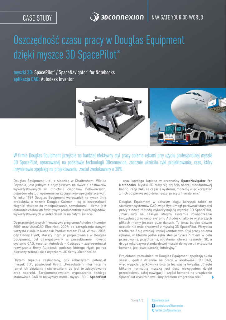 CASE STUDY Oszczędność czasu pracy w Douglas Equipment dzięki myszce 3D SpacePilot ® myszki 3D: SpacePilot / SpaceNavigator for Notebooks aplikacja CAD: Autodesk Inventor ® ® W firmie Douglas Equipment przejście na bardziej efektywny styl pracy obiema rękami przy użyciu profesjonalnej myszki 3D SpacePilot, opracowanej na podstawie technologii 3Dconnexion, znacznie ukróciło cykl projektowania; czas, który inżynierowie spędzają na projektowaniu, został zredukowany o 30%. Douglas Equipment Ltd., z siedzibą w Chaltenham, Wielka Brytania, jest jednym z największych na świecie dostawców wykorzystywanych w lotnictwie ciągników holowniczych, pojazdów obsługi naziemnej oraz ciągników specjalistycznych. W roku 1989 Douglas Equipment wprowadził na rynek linię produktów o nazwie Douglas-Kalmar – są to bezdyszlowe ciągniki służące do manipulowania samolotami – firma jest aktualnie czołowym światowym producentem takich pojazdów, wykorzystywanych w setkach sztuk na całym świecie. Do prac projektowych firma używa programu Autodesk Inventor 2009 oraz AutoCAD Electrical 2009; do zarządzania danymi korzysta z kolei z Autodesk Productstream PLM. W roku 2005, gdy Danny Hyatt, starszy inżynier projektowania w Douglas Equipment, był zaangażowany w poszukiwanie nowego systemu CAD, reseller Autodesk – Cadspec – zaprezentował rozwiązania firmy Autodesk, podczas którego Hyatt po raz pierwszy zetknął się z myszkami 3D firmy 3Dconnexion. “Byłem zupełnie zaskoczony, gdy zobaczyłem potencjał myszek 3D”, powiedział Hyatt. „Poszukałem informacji na temat ich działania i stwierdziłem, że jest to zdecydowanie krok naprzód. Zarekomendowałem wyposażenie każdego stanowiska CAD w najwyższy model myszki 3D – SpacePilot – oraz każdego laptopa w przenośny SpaceNavigator for Notebooks. Myszki 3D stały się częścią naszej standardowej konfiguracji CAD, są częścią systemu, możemy więc korzystać z nich od pierwszego dnia naszej pracy z Inventorem.” Douglas Equipment w dalszym ciągu korzysta także ze starszych systemów CAD, więc Hyatt mogł porównać stary styl pracy z nową metodą wykorzystującą myszkę 3D SpacePilot. „Pracujemy na naszym starym systemie równocześnie korzystając z nowego systemu Autodesk, jako że w starszych plikach mamy jeszcze dużo danych. To teraz bardzo dziwne uczucie nie móc pracować z myszką 3D SpacePilot. Wszystko trzeba robić się wolniej i mniej komfortowo. Styl pracy obiema rękami, w którym jedna ręka steruje SpacePilot’em w celu przesuwania, przybliżania, oddalania i obracania modeli 3D, a druga ręka używa standardowej myszki do wyboru i włączania komend, jest dużo bardziej intuicyjny.” Projektanci zatrudnieni w Douglas Equipment spędzają okolo sześciu godzin dziennie na pracy w środowisku 3D CAD, więc wygoda użytkownika była tu też ważną kwestią. „Ciągłe klikanie normalną myszką jest dość niewygodne; dzięki przeniesieniu całej nawigacji i części komend na urządzenie SpacePilot wyeliminowaliśmy problem zmęczenia ręki.” Strona 1 / 2 3dconnexion.com facebook.com/3dconnexion twitter.com/3dconnexion CASE STUDY Oszczędność czasu pracy w Douglas Equipment dzięki myszce 3D SpacePilot® Myszki 3D firmy 3Dconnexion są teraz standardowym elementem stacji roboczej CAD w firmie Douglas. „Do każdego kupowanego przez nas systemu automatycznie dołączany jest SpacePilot,” mówi Hyatt. „Nowy użytkownik potrzebuje średnio dwóch dni by czuć się komfortowo w pracy z tym urządzeniem, po trzech dniach nabiera biegłości. Nasi Marka Douglas Equipment została ostatnio wykorzystana i uwieczniona w historii Jamesa Bonda. Pinewood Studio zapytało firmę, czy mogłaby zmodyfikować swoje holowniki lotnicze tak, by można ich było użyć 50 metrów nad ziemią do sceny akcji w filmie Casino Royale. Ciągniki holownicze, które normalnie wykorzystywane są na wysokości 10 metrów projektanci nie wyobrażają już sobie powrotu do czasu, kiedy nie używali SpacePilot’a.” nad ziemią i podnoszą do 60 ton, musiały poradzić sobie z ciężarem równym połowie ich wagi, a Douglas Equipment wyposażył je dodatkowo w mocniejsze silniki, dzięki czemu holowniki osiągnęły wymaganą prędkość. Wśród korzyści bardziej biznesowych Hyatt wymienia mniejszą ilość błędów projektowych oraz ogólną poprawę produktywności. „SpacePiloty dają nam możliwość szybkiego i łatwego poruszania modelami CAD we wszystkich kierunkach podczas naszych prac inżynierskich. Pomagają tworzyć wizualizację na ekranie i manipulować modelami. Główne korzyści pracy z nimi to mniejsza ilość błędów, ponieważ możemy szybko wizualizować komponenty z każdej strony, pod każdym kątem oraz większa produktywność wynikająca z tego, że nie musimy już przełączać się ciągle między myszką i klawiaturą.” SpacePilot ma wbudowany wyświetlacz LCD, na którym użytkownik może sprawdzać zaprogramowane na przyciskach urządzenia funkcje i komendy. Dzięki tej dodatkowej funkcjonalności SpacePilot’a użytkownicy nie muszą już sięgać do klawiatury. „To zdecydowanie bardziej naturalna i intuicyjna metoda pracy nad modelami 3D,” mówi Hyatt. „Zadanie, które wykonuję w 10 minut ze SpacePilotem, zajmuje mi 30 minut pracy bez niego ze względu na zależność od przycisków na pasku narzędzi.” Myszki 3D firmy 3Dconnexion pomogły Douglas Equipment w tym przedsięwzięciu. „Trzy pojazdy zostały zbudowane i wyposażone w dodatkowe cechy specjalnie do tego filmu. Zespół projektowy pracował 18 godzin na dobę przez sześć tygodni, by przygotować ciągniki. Tylko dzięki zaangażowaniu i umiejętnościom zespołu projektowego, jak również zoptymalizowanego trybowi pracy, który osiągnęliśmy po przejściu na system Autodesk Inventor wraz ze SpacePilot’em firmy 3Dconnexion, byliśmy w stanie zdążyć z pracą na czas. Tak samo 