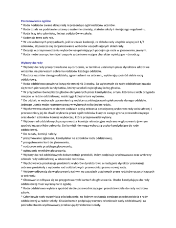 Postanowienia ogólne * Rada Rodziców zwana dalej radą reprezentuje ogół rodziców uczniów. * Rada działa na podstawie ustawy o systemie oświaty, statutu szkoły i niniejszego regulaminu. * Rada liczy tylu członków, ile jest oddziałów w szkole. * Kadencja trwa cały rok. * W uzasadnionych przypadkach, jeśli w czasie kadencji, ze składu rady ubędzie więcej niż 1/3 członków, dopuszcza się zorganizowanie wyborów uzupełniających skład rady. * Decyzje o przeprowadzeniu wyborów uzupełniających podejmuje rada w głosowaniu jawnym. * Rada może tworzyc komisje i zespoły zadaniowe mające charakter opiniująco - doradczy. Wybory do rady * Wybory do rady przeprowadzane są corocznie, w terminie ustalonym przez dyrektora szkoły we wrześniu, na pierwszym zebraniu rodziców każdego oddziału. * Rodzice uczniów danego oddziału, zgromadzeni na zebraniu, wybierają spośród siebie radę oddziałową. * Rada oddziałowa powinna liczyą nie mniej niż 3 osoby. Za wybranych do rady oddziałowej uważa się trzech pierwszych kandydatów, którzy uzyskali największą liczbę głosów. * W przypadku równej liczby głosów otrzymanych przez kandydatów, o tym, któremu z nich przypada miejsce w radzie oddziałowej, rozstrzyga kolejna tura wyborów. * Do udziału w wyborach uprawnieni są rodzice uczniów/prawni opiekunowie danego oddziału. Jednego ucznia może reprezentowaą w wyborach tylko jeden rodzic. * Wychowawca otwiera w danym oddziale częśą zebrania poświęconą wyborom rady oddziałowej i przewodniczy jej do chwili wybrania przez ogół rodziców klasy ze swego grona przewodniczącego oraz dwóch członków komisji wyborczej, która przeprowadzi wybory. * Wybory rad oddziałowych przeprowadza komisja rekrutacyjna wybrana w głosowaniu jawnym spośród uczestników zebrania. Do komisji nie mogą wchodzią osoby kandydujące do rady oddziałowej. * Do zadaA„ komisji należy: * przyjmowanie zgłoszeA„ kandydatur na członków rady oddziałowej, * przygotowanie kart do głosowania, * nadzorowanie przebiegu głosowania, * ogłoszenie wyników głosowania. * Wybory do rad oddziałowych dokumentuje protokół, który podpisuje wychowawca oraz wybrany członek rady oddziałowej w obecności rodziców. * Wychowawca przekazuje protokół z wyborów dyrektorowi, a następnie dyrektor przekazuje zebrane protokoły z wyborów rad oddziałowych przewodniczącemu nowej rady. * Wybory odbywają się w głosowaniu tajnym na zasadach ustalonych przez rodziców uczestniczących w zebraniu. * Głosowanie odbywa się na przygotowanych kartach do głosowania. Osoba kandydująca do rady oddziałowej musi wyrazią na to zgodę. * Rada oddziałowa wybiera spośród siebie przewodniczącego i przedstawiciela do rady rodziców szkoły. * Członkowie rady wypełniają oświadczenie, na którym wskazują swojego przedstawiciela z rady oddziałowej w radzie szkoły. Oświadczenie podpisują wszyscy członkowie rady oddziałowej i za pośrednictwem wychowawcy przekazują dyrektorowi szkoły. * Na wniosek rodziców uczestniczących w zebraniu, przedstawiciela rady oddziałowej do rady rodziców szkoły może wybierają ogół rodziców uczestniczących w zebraniu, w głosowaniu tajnym, spośród wybranych członków rady oddziałowej. * Obwieszczenie wyników wyborów, podanie do wiadomości składu rady i zwołanie pierwszego posiedzenia rady należy do obowiązków dyrektora. * Pierwsze posiedzenie rady powinno odbyą się nie póAoniej niż 14 dni od terminu wyborów. Władze rady * Rada wybiera ze swojego grona przewodniczącego rady, zastępcę przewodniczącego, sekretarza i skarbnika. * Przewodniczący rady organizuje prace rady, zwołuje i prowadzi posiedzenia rady, reprezentuje radę na zewnątrz. * Zastępca przewodniczącego rady przyjmuje obowiązki przewodniczącego w czasie jego nieobecności. * Sekretarz rady odpowiada za dokumentację rady i protokołowanie jej posiedzeA„. * Skarbnik rady odpowiada za prawidłową gospodarkę funduszem gromadzonym przez radę. Posiedzenia rady * Posiedzenia rady odbywają się w terminach ustalonych w rocznym harmonogramie, nie rzadziej niż 1 na 2 miesiące. * Poza terminami ustalonymi w harmonogramie, posiedzenia rady zwołuje przewodniczący, powiadamiając członków rady co najmniej 7 dni przed terminem posiedzenia. W szczególnie uzasadnionych przypadkach przewodniczący może zwołaą posiedzenie rady w trybie pilnym, bez zachowania 7 - dniowego terminu. * Posiedzenia rady mogą byą również zwoływane w każdym czasie, z inicjatywy 1/3 składu rady oraz na wniosek dyrektora, rady pedagogicznej lub samorządu uczniowskiego. * Przygotowanie zebrania jest obowiązkiem przewodniczącego. Członkowie rady, na 7 dni przed posiedzeniem, otrzymują projekt porządku obrad. Projekt porządku zamieszczany jest także na stronie internetowej szkoły. * Posiedzenia rady prowadzone są przez przewodniczącego. * W posiedzeniach rady może braą udział, z głosem doradczym, dyrektor lub inne osoby zaproszone przez przewodniczącego za zgodą lub na wniosek rady. * Posiedzenia rady są ważne, o ile obecnych jest co najmniej połowa członków rady. * Posiedzenia rady są protokołowane. * Protokoły posiedzeA„ rady są przyjmowane przez radę w drodze głosowania na następnym posiedzeniu rady. Podejmowanie uchwał * Uchwały rady podejmowane są zwykłą większością głosów, w głosowaniu jawnym. * W sprawach personalnych, a także na formalny wniosek członków rady, głosowanie odbywa się w trybie tajnym. * Uchwały rady numerowane są w sposób ciągły w danym roku szkolnym. * Opinie rady wydawane są w takim samym trybie jak uchwały. Prawa i obowiązki członków rady * Członkowie rady mają prawo do: * dostępu do wszystkich informacji i dokumentów związanych z organizacją i przebiegiem procesu dydaktyczno-wychowawczo-opiekuoczego, poza informacjami o dokumentami uznanymi za poufne lub dotyczącymi spraw personalnych, * wy