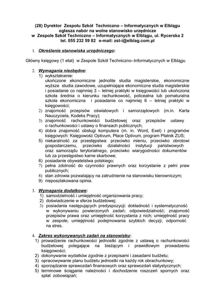 (28) Dyrektor Zespołu Szkół Techniczno – Informatycznych w Elblągu ogłasza nabór na wolne stanowisko urzędnicze w Zespole Szkół Techniczno – Informatycznych w Elblągu, ul. Rycerska 2 tel. 055 232 59 82 e-mail: [email protected] 1. Określenie stanowiska urzędniczego: Główny księgowy (1 etat) w Zespole Szkół Techniczno–Informatycznych w Elblągu 2. Wymagania niezbędne: 1) wykształcenie: ukończone ekonomiczne jednolite studia magisterskie, ekonomiczne wyższe studia zawodowe, uzupełniające ekonomiczne studia magisterskie i posiadanie co najmniej 3 – letniej praktyki w księgowości lub ukończona szkoła średnia o kierunku rachunkowość, policealna lub pomaturalna szkoła ekonomiczna i posiadanie co najmniej 6 – letniej praktyki w księgowości; 2) znajomość przepisów oświatowych i samorządowych (m.in. Karta Nauczyciela, Kodeks Pracy); 3) znajomość rachunkowości budżetowej oraz przepisów ustawy o rachunkowości i ustawy o finansach publicznych; 4) dobra znajomość obsługi komputera (m. in. Word, Exel) i programów księgowych: Księgowość Optivum, Płace Optivum, program Płatnik ZUS; 5) niekaralność za przestępstwa: przeciwko mieniu, przeciwko obrotowi gospodarczemu, przeciwko działalności instytucji państwowych oraz samorządu terytorialnego, przeciwko wiarygodności dokumentów lub za przestępstwo karne skarbowe; 6) posiadanie obywatelstwa polskiego; 7) pełna zdolność do czynności prawnych oraz korzystanie z pełni praw publicznych; 8) stan zdrowia pozwalający na zatrudnienie na stanowisku kierowniczym; 9) nieposzlakowana opinia. 3. Wymagania dodatkowe: 1) samodzielność i umiejętność organizowania pracy; 2) doświadczenie w sferze budżetowej; 3) posiadania następujących predyspozycji: dokładność i systematyczność w wykonywaniu powierzonych zadań; odpowiedzialność; znajomość przepisów prawa oraz umiejętność korzystania z nich; umiejętność pracy w zespole; umiejętność podejmowania szybkich decyzji, odporność na stres. 4. Zakres wykonywanych zadań na stanowisku: 1) prowadzenie rachunkowości jednostki zgodnie z ustawą o rachunkowości budżetowej polegające na bieżącym i prawidłowym prowadzeniu księgowości; 2) dokonywanie wydatków zgodnie z przepisami i zasadami budżetu; 3) opracowywanie planu budżetu jednostki na każdy rok obrachunkowy; 4) sporządzanie sprawozdań finansowych oraz sprawozdań statystycznych; 5) terminowe ściąganie należności i dochodzenie roszczeń spornych oraz spłat zobowiązań; 6) przygotowywanie i rozliczanie inwentaryzacji; 7) prowadzenie kontroli wewnętrznej w zakresie gospodarki kasowej, druków ścisłego zarachowania itp.; 8) przestrzeganie zasad rozliczeń pieniężnych oraz ochrony wartości pieniężnych; 9) dokonywanie kontroli zgodności operacji gospodarczych i finansowych z planem finansowym; 10)analiza wykorzystywania środków przydzielonych z budżetu i innych będących w dyspozycji jednostki oraz dokonywanie wstępnej kontroli kompletności i rzetelności dokumentów dotyczących operacji finansowych. 5. Wymagane dokumenty: 1) życiorys (CV); 2) list motywacyjny; 3) kserokopie dokumentów poświadczających wymagane wykształcenie; 4) kserokopie świadectw pracy; 5) kserokopia dowodu osobistego; 6) oświadczenie kandydata o niekaralności za przestępstwa: przeciwko mieniu, przeciwko obrotowi gospodarczemu, przeciwko działalności instytucji państwowych oraz samorządu terytorialnego, przeciwko wiarygodności dokumentów lub za przestępstwo karne skarbowe; 7) aktualne zaświadczenie o stanie zdrowia pozwalającym na zatrudnienie na stanowisku głównego księgowego; 8) inne dodatkowe dokumenty o posiadanych kwalifikacjach i umiejętnościach, opinie, referencje. Oferty z dokumentami należy: przesyłać pocztą na adres: Zespół Szkół Techniczno – Informatycznych w Elblągu ul. Rycerska 2 lub składać osobiście w sekretariacie ZSTI w terminie od 10 grudnia 2009 r. do 21 grudnia 2009 r. w zamkniętych kopertach z następującą adnotacją: ,,Nabór na wolne stanowisko urzędnicze – Główny księgowy w Zespole Szkół Techniczno – Informatycznych w Elblągu w terminie do 21 grudnia 2009 r.” Oferty, które wpłyną do Zespołu Szkół Techniczno – Informatycznych w Elblągu po wyżej określonym terminie nie będą rozpatrywane. Informacja o wyniku naboru będzie umieszczona na stronie http://zsti.elblag.pl/bip/, i na tablicy ogłoszeń w siedzibie szkoły w Elblągu, ul. Rycerska 2 oraz w Biuletynie Informacji Publicznej (BIP) na stronie internetowej Urzędu Miejskiego w Elblągu (www.umelblag.pl) …………………………………. Wymagane dokumenty: list motywacyjny, szczegółowe CV (z uwzględnieniem dokładnego przebiegu kariery zawodowej), powinny być opatrzone klauzulą: „Wyrażam zgodę na przetwarzanie moich danych osobowych zawartych w ofercie pracy dla potrzeb niezbędnych do realizacji procesu rekrutacji zgodnie z ustawą z dnia 29. 08. 1997 r. o ochronie danych osobowych (Dz. U. z 2002 r. Nr 101, poz. 926 ze zm.) oraz ustawą z dn. 21. 11. 2008 r. o pracownikach samorządowych (Dz. U. z 2008 r. Nr 223, poz. 1458)”.