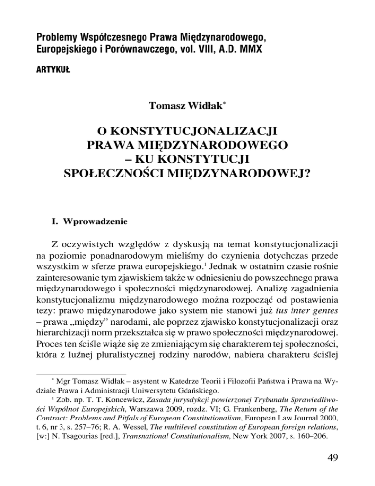 Problemy Współczesnego Prawa Międzynarodowego, Europejskiego i Porównawczego, vol. VIII, A.D. MMX ARTYKUŁ Tomasz Widłak* O KONSTYTUCJONALIZACJI PRAWA MIĘDZYNARODOWEGO – KU KONSTYTUCJI SPOŁECZNOŚCI MIĘDZYNARODOWEJ? I. Wprowadzenie Z oczywistych względów z dyskusją na temat konstytucjonalizacji na poziomie ponadnarodowym mieliśmy do czynienia dotychczas przede wszystkim w sferze prawa europejskiego.1 Jednak w ostatnim czasie rośnie zainteresowanie tym zjawiskiem także w odniesieniu do powszechnego prawa międzynarodowego i społeczności międzynarodowej. Analizę zagadnienia konstytucjonalizmu międzynarodowego można rozpocząć od postawienia tezy: prawo międzynarodowe jako system nie stanowi już ius inter gentes – prawa „między” narodami, ale poprzez zjawisko konstytucjonalizacji oraz hierarchizacji norm przekształca się w prawo społeczności międzynarodowej. Proces ten ściśle wiąże się ze zmieniającym się charakterem tej społeczności, która z luźnej pluralistycznej rodziny narodów, nabiera charakteru ściślej * Mgr Tomasz Widłak – asystent w Katedrze Teorii i Filozofii Państwa i Prawa na Wydziale Prawa i Administracji Uniwersytetu Gdańskiego. 1 Zob. np. T. T. Koncewicz, Zasada jurysdykcji powierzonej Trybunału Sprawiedliwości Wspólnot Europejskich, Warszawa 2009, rozdz. VI; G. Frankenberg, The Return of the Contract: Problems and Pitfals of European Constitutionalism, European Law Journal 2000, t. 6, nr 3, s. 257–76; R. A. Wessel, The multilevel constitution of European foreign relations, [w:] N. Tsagourias [red.], Transnational Constitutionalism, New York 2007, s. 160–206. 49 z sobą powiązanej wspólnoty wartości, celów, instytucji i norm.2 Wraz z nią, jak proponują niektórzy autorzy, prawo międzynarodowe także ewoluowało od prawa koegzystencji, poprzez prawo kooperacji aż do konstytucjonalizacji.3 Przedmiotem tego artykułu będzie wstępna weryfikacja tej tezy ze szczególnym uwzględnieniem próby udzielenia odpowiedzi na pytanie, czy rzeczywiście i w jakich znaczeniach mamy obecnie do czynienia z procesem konstytucjonalizacji prawa międzynarodowego. Aby odpowiedzieć na to pytanie, konieczne będzie po pierwsze przyjrzenie się charakterystycznym cechom „konstytucji” i „konstytucjonalizmu” w nauce prawa w ogóle,4 a następnie rozważenie na ile są one właściwym aparatem pojęciowym do opisania procesów zachodzących w prawie międzynarodowym, z wyróżnieniem znaczeń w jakich można posługiwać się ideą konstytucji i konstytucjonalizmu na poziomie globalnym. Po drugie, przedstawione zostaną przykładowe procesy i przejawy konstytucjonalizacji prawa międzynarodowego, a następnie opozycyjne w stosunku do nich przykłady trendów antykonstytucyjnych i krytyki idei globalnego konstytucjonalizmu. W konkluzji artykuł proponuje wyróżnienie trzech podstawowych sposobów rozumienia zjawiska konstytucjonalizacji prawa międzynarodowego. 2 Używając terminu „społeczność międzynarodowa” w tym artykule wychodzę od najczęściej przywoływanej, zwłaszcza w nauce stosunków międzynarodowych, klasycznej definicji społeczności międzynarodowej H. Bulla z 1977 r.: „Społeczność państw czy też społeczność międzynarodowa, istnieje gdy grupa państw, świadomych pewnych wspólnych interesów i wspólnych wartości, tworzy społeczność w tym sensie, że postrzegają one siebie jako związane w swych wzajemnych relacjach wspólnym zespołem reguł i uczestniczą w działaniu wspólnych instytucji”(H. Bull, The Anarchical Society. A Study of Order in World Politics, New York 2002, s. 13.). Powyższą definicję przywołuję z tym zastrzeżeniem, że szerzej traktuję krąg członków społeczności międzynarodowej, które nie obejmują współcześnie wyłącznie państw. Więcej na temat użycia terminu „społeczność międzynarodowa” zob. J. Zajadło, Społeczność międzynarodowa czy wspólnota międzynarodowa?, PiP 2005, z. 9, s. 34–50; na temat historycznej ewolucji idei społeczności międzynarodowej zob. T. Widłak, Zarys historii myśli o społeczności międzynarodowej, Gdańskie Studia Prawnicze 2008, t. XX, s. 349–369. 3 A. Peters, Compensatory Constitutionalism: The Function and Potential of Fundamental International Norms and Structures, Leiden Journal of International Law 2006, t. 19, s. 580 oraz cyt. tam literatura. 4 Zob. S. Besson, Whose Constitution(s)? International Law, Constitutionalism, and Democracy, [w:] J. L. Dunoff, J. P. Trachtman [red.], Ruling the World? Constitutionalism, International Law and Global Governance, New York 2009, s. 381–384. 50 II. Język debaty konstytucyjnej: „konstytucja”, „konstytucjonalizm” i „konstytucjonalizacja” Termin „konstytucja” oraz pochodne wobec niego pojęcia, takie jak „konstytucjonalizm” czy „konstytucjonalizacja” mogą mieć bardzo różne znaczenie nie tylko na gruncie różnych systemów prawnych; są także często używane w różnych kontekstach politycznych i kulturowych. Warto zauważyć jednak, że przynajmniej w języku prawniczym, terminy te łączą z sobą na ogół pozytywne konotacje i wiążą się z legitymizacją porządków prawnych będących przedmiotem konstytucjonalizacji.5 „Konstytucja” kojarzy się przede wszystkim z najbardziej oczywistym rozumieniem tego pojęcia jako „aktu określającego podstawy ustrojowe państwa”6 lub „reguł i praktyk określających skład i funkcje organów państwa i samorządu oraz regulujących związki między jednostką a państwem”.7 W sensie formalnym konstytucja jest pewnego rodzaju faktem prawotwórczym, który charakteryzuje się szczególną mocą prawną, na ogół najwyższą w danym systemie prawnym, de iure lub choćby de facto wprowadzając w ten system pewną normatywną hierarchię. Po drugie, zwykle na konstytucję składa się jeden, skodyfikowany akt prawny, chociaż – jak wiadomo – nie jest to warun