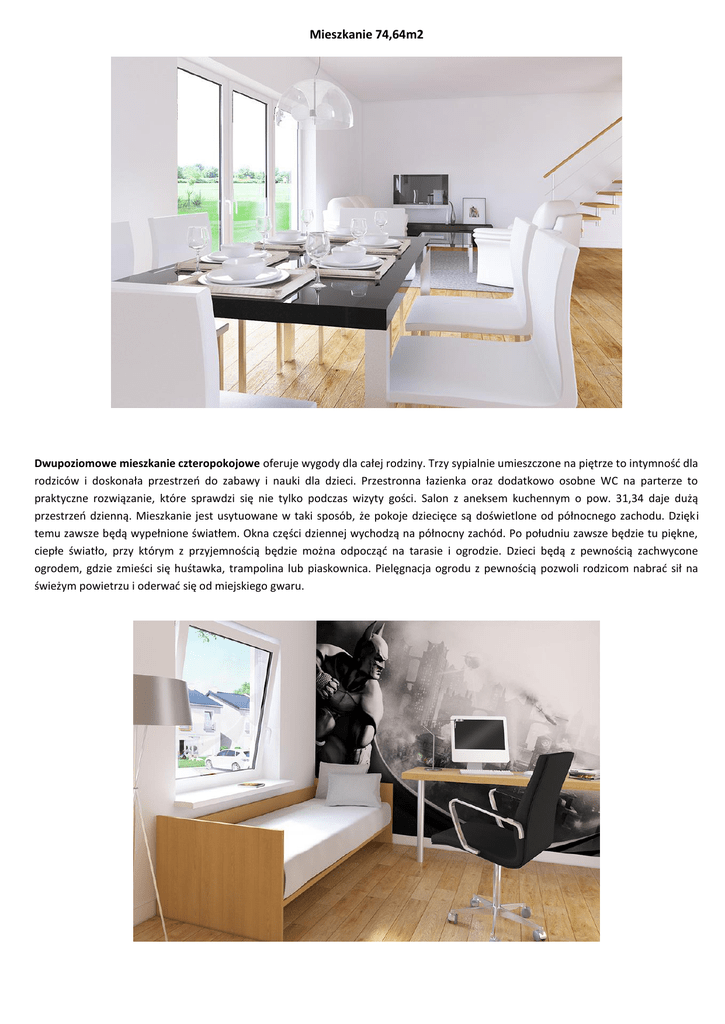 Mieszkanie 74,64m2 Dwupoziomowe mieszkanie czteropokojowe oferuje wygody dla całej rodziny. Trzy sypialnie umieszczone na piętrze to intymność dla rodziców i doskonała przestrzeń do zabawy i nauki dla dzieci. Przestronna łazienka oraz dodatkowo osobne WC na parterze to praktyczne rozwiązanie, które sprawdzi się nie tylko podczas wizyty gości. Salon z aneksem kuchennym o pow. 31,34 daje dużą przestrzeń dzienną. Mieszkanie jest usytuowane w taki sposób, że pokoje dziecięce są doświetlone od północnego zachodu. Dzięki temu zawsze będą wypełnione światłem. Okna części dziennej wychodzą na północny zachód. Po południu zawsze będzie tu piękne, ciepłe światło, przy którym z przyjemnością będzie można odpocząć na tarasie i ogrodzie. Dzieci będą z pewnością zachwycone ogrodem, gdzie zmieści się huśtawka, trampolina lub piaskownica. Pielęgnacja ogrodu z pewnością pozwoli rodzicom nabrać sił na świeżym powietrzu i oderwać się od miejskiego gwaru. Wizualizacja parteru Wizualizacja piętra