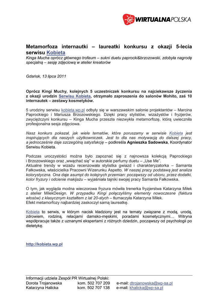 Metamorfoza internautki – laureatki konkursu z okazji 5-lecia serwisu Kobieta Kinga Mucha oprócz głównego trofeum – sukni duetu paprocki&brzozowski, zdobyła nagrodę specjalną – sesję zdjęciową w atelier kreatorów Gdańsk, 13 lipca 2011 Oprócz Kingi Muchy, kolejnych 5 uczestniczek konkursu na najciekawsze życzenia z okazji urodzin Serwisu Kobieta, otrzymało zaproszenia do salonów Mohito, zaś 10 internautek – zestawy kosmetyków. 5 urodziny serwisu kobieta.wp.pl odbyły się w warszawskim salonie projektantów – Marcina Paprockiego i Mariusza Brzozowskiego. Dzięki pracy stylistów, wizażystów i fryzjerów, zwyciężczyni konkursu – Kinga Mucha przeszła niezwykła metamorfozę, którą uwieczniła profesjonalna sesja zdjęciowa. Nasz konkurs pokazał, jak wiele tematów, które poruszamy w serwisie Kobieta jest inspirujących dla naszych użytkowniczek. Jest to dla nas motywacją do dalszej pracy, a jednocześnie daje szczególną satysfakcję – podkreśla Agnieszka Sadowska, Koordynator Serwisu Kobieta. Podczas uroczystości można było zapoznać się z najnowsza kolekcją Paprockiego i Brzozowskiego oraz „wwąchać się” w autorskie perfumy duetu – „Use Me”. Aktualne trendy w wizażu recenzowała stylistka gwiazd i charakteryzatorka – Samanta Fałkowska, właścicielka Pracowni Wizerunku Aspetto. W naszej pracy podstawą jest analiza kolorystyczna. Ona daje asumpt do kolejnych przemian: począwszy od ubioru, przez dodatki, kolor fryzury i odcienie makijażu – wyjaśniała tajniki swojej pracy Samanta Fałkowska. O tym, jak wygląda modna wieczorowa fryzura mówiła trenerka fryzjerstwa Katarzyna Miłek z atelier MilekDesign. W przypadku Kingi połączyliśmy elementy nowoczesne (faktura włosów) z klasycznym kształtem z lat 20-stych – tłumaczyła Katarzyna Miłek. Efekt metamorfozy najbardziej zaskoczył samą laureatkę. Kobieta to serwis, w którym nacisk kładziony jest na tematy związane z modą, urodą, zdrowiem, rodziną, relacjami damsko-męskimi, poradami kosmetycznymi… Witryna współpracuje także z uznanymi ekspertami z różnych dziedzin, począwszy od psychologii po dietetykę. http://kobieta.wp.pl Informacji udziela Zespół PR Wirtualnej Polski: Dorota Trojanowska kom. 502 707 209 Katarzyna Halicka kom. 502 707 138 e-mail: [email protected] e-mail: [email protected]
