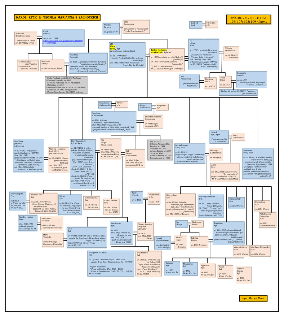 KAROL RYCK & TEOFILA MARIANNA Z SĄCHOCKICH Zofia Rosnowska Andrzej Sąchocki Karol Szter(n) Marianna Rem(b)iszewska zm. przed 1860 r. zm. przed r. 1860 https://www.geni.com/people/Karol/6000000 041605179318 - zamieszkała w Grójcu zm. 14.08.1892 Grójec - Konstancja & Józef Iwanicki - Franciszek & Antonina Smolińska Marianna Szter(n) ur. 1841w Starym Młynie ur. 1820 “… urodzony w Wielkim Księstwie Poznańskim we wsi Jelitowie…” - ekonom, Rusiec, par. Nadarzyn ślub: 01.07.1860 Grójec (akt nr 13, Archiwum Archidiecezji W-wskiej) Fryderyka n/n Gottfryd Bläch Zamieszkała w Pawłowicach “… jako dzierżawczyni…” (2) Michał Bläch (1) Karol Ryck / Ryk (wg. własnego podpisu: Rick) Anastazy Sąchocki zob. str. 72; 73; 104; 105; 106; 107; 108; 109 Albumu Teofila Marianna z Sąchockich “Rykowa” ur. ca 1789 Krobów - “maister Profesyi Kotlarskiej w Groycu zamieszkały” zm. 12.05.1841 w Woli Worowskiej (zapis: Worów, 1841/20) ur. 1809 (wg. aktów ur. córki Walerii i syna Józefa) ur. 1811 - “w Wielkim Xsięztwie Poznańskim” (?) ślub 3: z Kielanowskim zm. 22.12.1879 Kosów, par. Nadarzyn n/n Paszkiewicz - Feliks Norbert, ur. 02.06.1861 Nadarzyn - Eleonora Leokadia, ur. 1867 - Leokadia Marianna, ur. 1868 Goszczyn - Michalina, ur. 1869 - Wiktoria Florentyna, ur. 20.06.1871 Jasieniec - Kazimiera, ur. 14.01.1873 Jasieniec - Florian Stanisław, ur. 04.05.1875 Jasieniec Elżbieta z Bieleckich ur. 1775 “… w mieście Wrocławiu …w Szlązku” - “posesor dóbr Pawłowic” - “Possesor Dóbr Leśniowoli” ślub z Teofilą: 26.06.1847 w Rembertowie (zapis: 1847/ 1) zm. 25.10.1852 Pawłowice (akt nr 121 Rembertów) zm. 18.04.1839 Warszawa Tekla Bläch Krystyna Bläch “… prezydent miasta Wrocławia…” Konstanty Brodzki ur. ca 1812 ur. ca 1816 Wacław Michał, ur. 18.05.1833 Pawłowice, par. Rembertów Teresa n/n Franciszek Kielanowski Antoni Stankiewicz Stanisław Kielanowski Magdalena n/n Elżbieta Katarzyna Stankiewicz ur. 1801 Jasieniec - “w mieście Groycu zamieszkały” ślub: 31.01.1827 Gróyec (akt nr 3) - świadek na chrzcie Walerii Maryanny Ryck / Ryk - podpisał akt ur. Jana Aleksandra Ryk / Ryck ur. 1811 Grójec zm. przed 1851 r. Ludwik Ryk / Ryck ur. 12.05.1832 Przybyszew (zapis: Przybyszew 1832/46) ślub: 13.05.1856 (zapis: Rembertów/UMZ-1856/9) - “ Dzierżawca wsi Gośniewice, właściciel Usarzowa i Rudników” - “…Dzierżawca Dóbr Pęchery…” zm. 15.04.1898 Rudniki, Cmentarz w Modliborzycach Teofil Leopold Petz ślub: 1876 w W-wie, parafia św. Jana, akt 138 zm. 03.06.1921 (1) Justyna Kielanowska Józef Franciszek Ryk vel Ryck Józef Felix Jabłoński h. Dąbrowa Walerja Maryanna Ryck / Ryk (vel von Ryck ?) ur. 09.04.1838 Worów (zapis: Głuchów, 1838/24) zm. 13.11.1912 w Rudnikach, poch. w Modliborzycach Paulina Laura Ryk ur. 22.06.1852 w W-wie, Rynek Starego Miasta nr 43, parafia św. Jana. (zapis: W-wa-Stare Miasto, księga: Ch-1851-53/430) Czesław Marian Petz ślub: 05.09.1910 w W-wie, parafia św. Andrzeja, akt 94 ur. 21.04.1832 Krobów, (akt nr 56, Grójec U-1826) - “młodzian, czeladnik profesij blacharskiej w Warszawie” (wg. “Skorowidz mieszk. W-wy 1854”, zam.: Rynek St. Miasta 43) - 1870 - zam. ul. Hoża 5 ślub 1: 19.03.1851 Grójec (zapis: Grójec, 1851/13, AP W-wa) ślub 2: 30.05.1878 W-wa, Katedra Św. Jana, akt 69 zm. 30.07.1903 W-wa, cm. Powązki, kw 62, rz. 3, miejsce 22,23,24 ur. 1831 Grójec zm. 19.02.1889, poch. cm. powązkowski, kw. 62, rz. 3, m. 22,23,24 (2) Wanda Kielanowska ur. 1848 Grójec zm. 1906, poch. cm. powązkowski, W-wa Marianna Zofia Ryk ur. 20.08.1854 w W-wie, ul. Podwale 520, parafia św. Jana (zapis: W-waStare Miasto, księga: Ch-1854-56/686) ur. 1857 W-wa, par. św. Jana - n/n, ur. 1827 - Antonina Anna, ur. 1831 - Karolina, ur. 1834 - Marianna, ur. 1836 - Jadwiga Teresa, ur. 1838 - Lucjan, ur. 1841 - Walerian Antoni, ur. 1845 - Roman Antoni, ur. 1850 Maria Tokarska córka: Walerego i Bronisławy Uszyńskiej - “majster kowalski z Ksawerowa” Jan Aleksander Ryk / Ryck ur. 21.06.1834 (zapis: Grójec, księga: U-1834/61) - “dzierżawca folwarku Julianów, tamże zamieszkały” - “dzierżawca wsi Worowa” Wiktorya z Jabłońskich Alexander Ryk / Ryck ur. 1838(42) ur. 19.03.1841 w Woli Worowskiej (zapis: Worów, 1841/21) - wymieniony wśród uczestników Powstania Styczniowego 1863 - poległ pod Fajsławicami w oddziale gen. Kruka (żródła: Aleksander Nowolecki, Z. Kolumna, Pamiątka dla rodzin polskich… t.II Anna Ryk Kamila Helena Ryk ur. ca 1840 Wilhelmina Jerke Mieczysława Ryk ur. ca 1850 ur. 04.01.1862 Julianów, “…rodzicami jego chrzestnemi byli… Pan i Julia Jabłońska” (zapis: Julianów,1862/41, zespół: 1353/D Sobików) zm. 04.04.1868 w Worowie ur. 1861 W-wa, par. św. Krzyża, (akt 3137) Aleksandra Fronczek córka: Andrzeja i Marianny Dąbrowskiej Anna Garwolińska zm. 23.12.1854 w Ksawerowie, “lat trzy mająca” (zapis: Rembertów,1854/112, AP W-wa, Oddz. Grodzisk Maz.) Adolf Wajchler Michał Ryk ur. ca 1809 “… Nadleśny w lasach Rządowych Guberni Lubelskich…” Władysław Ryk Józef Ryk ur. 1/13.09.1884 w W-wie, ul. Żródlana 2637, parafia św. Jana (zapis: W-wa-Stare Miasto, księga: Ch-1883-85/58) ślub: 1908 W-wa, par. św. Trójcy zm. 18.02.1970 ur. 1877 ślub: 29.01.1900 W-wa, Katedra św. Jana zm. 14.12.1929 poch. cm. Powązkowski W-wa, inw, 19928 Jan Hoppe Wanda Karolina Wajchler (Wejchler) ur. 1878 zm. 21.02.1953 W-wa Walentyna Fibich Jadwiga Hoppe zam. Lwówek Śl. albo Wleń (?) ur. 1896 Żyrardów ur. 1899 Żyrardów ur. 16/29.05.1901 w W-wie, ul. Dobra 2648 (zapis: W-wa-Stare Miasto, ksiega: Ch-1901/518) ur. 12/25.07 1903 w W-wie, ul. Dobra 2648 (zapis: W-wa-Stare Miasto, księga: Ch-1903/530) zam.: W-wa, Wspólna 47 tel. 5 37 56 (r. 1938/39) zm. 13.03.1985 Tadeusz Ryk Mieczysław Ryk ur. 1891 W-wa, Wsz. Św. ur. 1892 W-wa, Wsz. Św. ur. 1868 Worów Bronisława Ryk ur. 1881 Worów Władysława Saturnina Ryk Eugeniusz Ryk ur. 