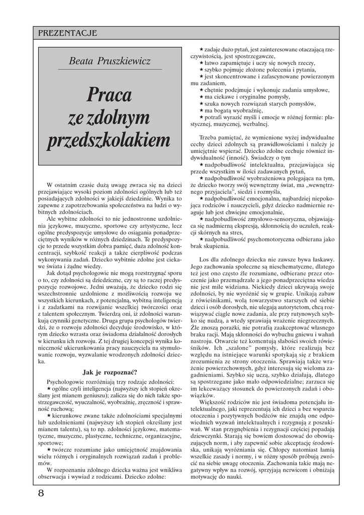 PREZENTACJE Beata Pruszkiewicz Praca ze zdolnym przedszkolakiem W ostatnim czasie dużą uwagę zwraca się na dzieci przejawiające wysoki poziom zdolności ogólnych lub też posiadających zdolności w jakiejś dziedzinie. Wynika to zapewne z zapotrzebowania społeczeństwa na ludzi o wybitnych zdolnościach. Ale wybitne zdolności to nie jednostronne uzdolnienia językowe, muzyczne, sportowe czy artystyczne, lecz ogólne predyspozycje umysłowe do osiągania ponadprzeciętnych wyników w różnych dziedzinach. Te predyspozycje to przede wszystkim dobra pamięć, duża zdolność koncentracji, szybkość reakcji a także cierpliwość podczas wykonywania zadań. Dziecko wybitnie zdolne jest ciekawe świata i żądne wiedzy. Jak dotąd psychologowie nie mogą rozstrzygnąć sporu o to, czy zdolności są dziedziczne, czy są to raczej predyspozycje rozwojowe. Jedni uważają, że dziecko rodzi się wszechstronnie uzdolnione z możliwością rozwoju we wszystkich kierunkach, z potencjalną, wybitną inteligencją i z zadatkami na rozwijanie wszelkiej twórczości oraz z talentem społecznym. Twierdzą oni, iż zdolności warunkują czynniki genetyczne. Druga grupa psychologów twierdzi, że o rozwoju zdolności decyduje środowisko, w którym dziecko wzrasta oraz świadoma działalność dorosłych w kierunku ich rozwoju. Z tej drugiej koncepcji wynika konieczność ukierunkowania pracy nauczyciela na stymulowanie rozwoju, wyzwalanie wrodzonych zdolności dziecka. Jak je rozpoznać? Psychologowie rozróżniają trzy rodzaje zdolności: ★ ogólne czyli inteligencja (najwyższy ich stopień określany jest mianem geniuszu); zalicza się do nich także spostrzegawczość, wyuczalność, wyobraźnię, zręczność i sprawność ruchową; ★ kierunkowe zwane także zdolnościami specjalnymi lub uzdolnieniami (najwyższy ich stopień określany jest mianem talentu), są to np. zdolności językowe, matematyczne, muzyczne, plastyczne, techniczne, organizacyjne, sportowe; ★ twórcze rozumiane jako umiejętność znajdowania wielu różnych i oryginalnych rozwiązań zadań i problemów. W rozpoznaniu zdolnego dziecka ważna jest wnikliwa obserwacja i wywiad z rodzicami. Dziecko zdolne: 8 ★ zadaje dużo pytań, jest zainteresowane otaczającą rzeczywistością, jest spostrzegawcze, ★ łatwo zapamiętuje i uczy się nowych rzeczy, ★ szybko pojmuje złożone polecenia i pytania, ★ jest skoncentrowane i zafascynowane powierzonym mu zadaniem, ★ chętnie podejmuje i wykonuje zadania umysłowe, ★ ma ciekawe i oryginalne pomysły, ★ szuka nowych rozwiązań starych pomysłów, ★ ma bogatą wyobraźnię, ★ potrafi wyrazić myśli i emocje w różnej formie: plastycznej, muzycznej, werbalnej. Trzeba pamiętać, że wymienione wyżej indywidualne cechy dzieci zdolnych są prawidłowościami i należy je umiejętnie wspierać. Dziecko zdolne cechuje również indywidualność (inność). Świadczy o tym ★ nadpobudliwość intelektualna, przejawiająca się przede wszystkim w ilości zadawanych pytań, ★ nadpobudliwość wyobrażeniowa polegająca na tym, że dziecko tworzy swój wewnętrzny świat, ma „wewnętrznego przyjaciela”, siedzi i rozmyśla, ★ nadpobudliwość emocjonalna, najbardziej niepokojąca rodziców i nauczycieli, gdyż dziecko nadmiernie reaguje lub jest chwiejne emocjonalnie, ★ nadpobudliwość zmysłowo-sensoryczna, objawiająca się nadmierną ekspresją, skłonnością do uczuleń, reakcji skórnych na stres, ★ nadpobudliwość psychomotoryczna odbierana jako brak skupienia. Los dla zdolnego dziecka nie zawsze bywa łaskawy. Jego zachowania społeczne są nieschematyczne, dlatego też jest ono często źle rozumiane, odbierane przez otoczenie jako przemądrzałe a jego ponadprzeciętna wiedza nie jest mile widziana. Niekiedy dzieci ukrywają swoje zdolności, by nie wyróżnić się w grupie. Unikają zabaw z rówieśnikami, wolą towarzystwo starszych od siebie dzieci i osób dorosłych, nie ulegają autorytetom, chcą rozwiązywać ciągle nowe zadania, ale przy rutynowych szybko się nudzą, a wtedy sprawiają wrażenie niegrzecznych. Źle znoszą porażki, nie potrafią zaakceptować własnego braku racji. Mają skłonności do wybuchu gniewu i wahań nastroju. Otwarcie też komentują słabości swoich rówieśników. Ich „szalone” pomysły, które realizują bez względu na istniejące warunki spotykają się z brakiem zrozumienia ze strony otoczenia. Sprawiają także wrażenie powierzchownych, gdyż interesują się wieloma zagadnieniami. Szybko się uczą, szybko działają, dlatego są spostrzegane jako mało odpowiedzialne; zarzuca się im lekceważący stosunek do powierzonych zadań i obowiązków. Większość rodziców nie jest świadoma potencjału intelektualnego, jaki reprezentują ich dzieci a bez wsparcia otoczenia i pozytywnych bodźców nie znajdą one odpowiednich wyzwań intelektualnych i rezygnują z poszukiwań. W stan przygnębienia i rezygnacji częściej popadają dziewczynki. Starają się bowiem dostosować do obowiązujących norm, i aby zapewnić sobie akceptację środowiska, unikają wyróżniania się. Chłopcy natomiast łamią wszelkie zasady i normy, i w różny sposób próbują zwrócić na siebie uwagę otoczenia. Zachowania takie mają negatywny wpływ na rozwój, sprzyjają nerwicom i obniżają motywację do nauki. PRZEGLĄD Edukacyjny 5 (62) Stymulowanie rozwoju ucznia zdolnego Wczesne rozpoznanie ponadprzeciętnych zdolności u dziecka pozwala właściwie stymulować jego rozwój. Stawianie mu bowiem takich samych wymagań jak dzieciom przeciętnie zdolnym, stwarza poważny dysonans między jego potencjałem intelektualnym a praktycznymi możliwościami wykorzystania go. Dzieci o szczególnych zdolnościach mają dużą wiedzę w wybranych dziedzinach, bogate słownictwo. Wcześniej niż rówieśnicy osiągają umiejętność formułowania zdań, szybko zapamiętują fakty i spostrzegają związki 