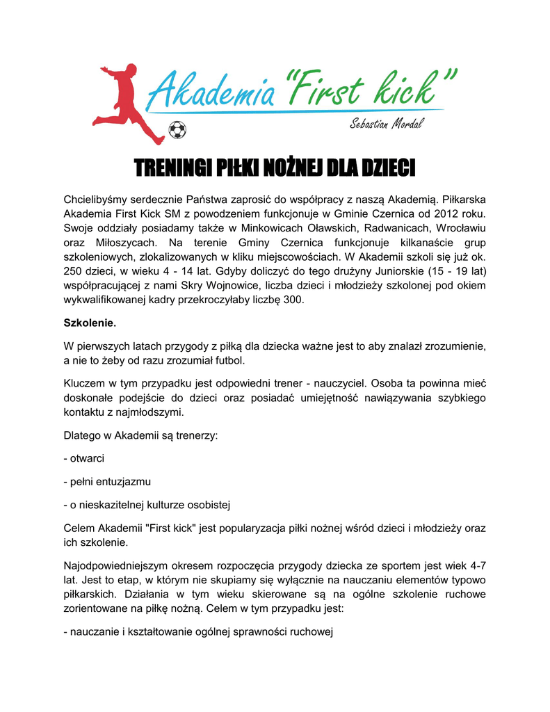 TRENINGI PIŁKI NOŻNEJ DLA DZIECI Chcielibyśmy serdecznie Państwa zaprosić do współpracy z naszą Akademią. Piłkarska Akademia First Kick SM z powodzeniem funkcjonuje w Gminie Czernica od 2012 roku. Swoje oddziały posiadamy także w Minkowicach Oławskich, Radwanicach, Wrocławiu oraz Miłoszycach. Na terenie Gminy Czernica funkcjonuje kilkanaście grup szkoleniowych, zlokalizowanych w kliku miejscowościach. W Akademii szkoli się już ok. 250 dzieci, w wieku 4 - 14 lat. Gdyby doliczyć do tego drużyny Juniorskie (15 - 19 lat) współpracującej z nami Skry Wojnowice, liczba dzieci i młodzieży szkolonej pod okiem wykwalifikowanej kadry przekroczyłaby liczbę 300. Szkolenie. W pierwszych latach przygody z piłką dla dziecka ważne jest to aby znalazł zrozumienie, a nie to żeby od razu zrozumiał futbol. Kluczem w tym przypadku jest odpowiedni trener - nauczyciel. Osoba ta powinna mieć doskonałe podejście do dzieci oraz posiadać umiejętność nawiązywania szybkiego kontaktu z najmłodszymi. Dlatego w Akademii są trenerzy: - otwarci - pełni entuzjazmu - o nieskazitelnej kulturze osobistej Celem Akademii "First kick" jest popularyzacja piłki nożnej wśród dzieci i młodzieży oraz ich szkolenie. Najodpowiedniejszym okresem rozpoczęcia przygody dziecka ze sportem jest wiek 4-7 lat. Jest to etap, w którym nie skupiamy się wyłącznie na nauczaniu elementów typowo piłkarskich. Działania w tym wieku skierowane są na ogólne szkolenie ruchowe zorientowane na piłkę nożną. Celem w tym przypadku jest: - nauczanie i kształtowanie ogólnej sprawności ruchowej - zróżnicowana aktywność sportowa - zręczność i kreatywność z piłką przy nodze Celami drugiej części działań, skierowanych na grę w piłkę nożną są przede wszystkim: - zabawa i radość - nauczanie techniki w FORMIE OGÓLNEJ - praca zespołowa + kreatywność We wszystkich projektach skupiamy się na kształtowaniu inteligencji dzieci oraz decyzyjności. Najważniejszym aspektem dla nas jest stymulacja rozwoju zawodników, postrzeganych jako jednostka. Oczywiście jest to poglądowa sytuacja i nikt w Akademii nie dzieli dzieci na „lepszych” czy „gorszych”, tylko pozwala KAŻDEMU czerpać radość z każdej jednostki treningowej. Więcej o naszym szkoleniu, można dowiedzieć się na zebraniach organizowanych dla rodziców lub kontaktując się z założycielem Akademii - Sebastianem Mordalem, pod nr: 603 553 550. Treningi odbywałyby się raz w tygodniu, czas zajęć to 45 minut, łącznie 4 jedostki treningowe w miesiącu. Więcej szczegółów będziemy mogli Państwu przedstawić, jeśli zbierza się odpowiednia ilość chętnych osób. Aby powstała grupa, musi zgłosić się co najmniej 10 osób, wówczas gdy zbierze się większa liczba chętnych, powstaną dwie grupy. Koszt zajęć wynosi 50 PLN / miesiąc. Osoby chętne prosimy, aby wysłały na e-mail [email protected] zgłoszenie, w którym prosimy podać Imię i Nazwisko dziecka, datę urodzenia. Przez miesiąc wrzesień będzie prowadzony nabór oraz ustalane szczegóły. Ewentualne pierwsze treningi odbędą się w Październiku. Serdecznie zapraszamy Państwa do współpracy z naszą Akademią. Więcej informacji mogą Państwo uzyskać pod numerem 603 - 553 - 550. Zapraszamy również na naszą stronę www.firstkick.pl oraz na Fanpage na Facebooku. Ze sportowymi pozdrowieniami, Sebastian Mordal, kom. 603 553 550 KILKA ZDJĘĆ Z NASZEJ DZIAŁALNOŚCI