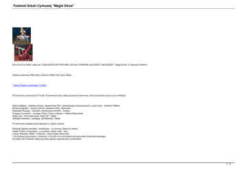 Festiwal Sztuki Cyrkowej "Magik Show" Dnia 23-24 05 2009r. odbył się I OGÓLNOPOLSKI FESTIWAL SZTUKI CYRKOWEJ dla DZIECI I MŁODZIEŻY- „Magik Show” w Dobrzeniu Wielkim. Otwarcia dokonała Wójt Gminy Dobrzeń Wielki Pani Irena Weber. Galeria Zespołu cyrkowego "Cudaki" W konkursie uczestniczyło 27 osób. W pierwszym dniu odbył się pokaz konkursowy, który był oceniany przez jury w składzie: Maria Izdebska - artystka cyrkowa, absolwentka PSC, reprezentująca stowarzyszenie „Ludzi Cyrku - Cyrkland” Miłków Mirosław Zgierski – artysta cyrkowy, absolwent PSC -Warszawa Radosław Ruchała – instruktor, wychowawca SCKiM – Kraków Grzegorz Łuniewski – menager Teatru Tańca z Ogniem – Maków Mazowiecki Agata Jop – firma reklamowa „Party-AZ”– Opole Jadwiga Kokoszka – pedagog, wychowawca - Opole Po konkursie wystąpili goście specjalni tj. artyści cyrkowi: Mirosław Zgierski akrobata , ekwilibrysta – w numerze „Balas ze szkłem” Hubert Piniarz z Sosnowca – w numerze „Lassa i baty” oraz Łukasz Wikowski „Witek” z Oleśnicy – jako żongler ekscentryk i 18 osobowa grupa dzieci i młodzieży z Chrzelic na monocyklach pod kierunkiem Eryka Murlowskiego. W drugim dniu festiwalu odbył się pokaz galowy nagrodzonych uczestników. 1/2 Festiwal Sztuki Cyrkowej "Magik Show" Decyzją jury nagrodzeni zostali: PRIX festiwalu otrzymał duet akrobatyczny „Przemki” – Ewa Przemysław Sudoł Wolniewicz stowarzyszenia „Ludzie Cyrku” – Miłków. IGRAND wyróżnienie -Szwejk, ekwilibrystyka-„wałki” Przemysław Wolniewicz, Wijata –Miłków II wyróżnienie – Anita Pinda „antypody” Miłków publiczności – Aleksander Radosław Krajewscy - Opole. Nagroda WójtaArtur Żusowski„diabolo” SCKiM - Kraków Wyróżnienie –konferansjerka Adam Banach –i„Party-AZ” Dobrzeń Wielki Nagrody specjalne: Marcin Jaskowski „diabolo” Nysa, Krzysztof Riewold „diabolo” -i Przemysław GOK Dobrzeń Wielki. Dwie nagrody dla najmłodszych uczestników festiwalu –Zespół Julia Piecha –Miłków iWielki, Aleksander Krajewski – Kultury Opolereprezentanci kategorii show” nagrody otrzymali: IW mc. Paweł Kwaśniewski „ Gminnego Kwachu” ––GOK Raszów II mc. Dawid „Elementum” – Nysa III mc. Sylwia Olga Żbikowska „–Mantra” Maków Mazowiecki Festiwal zamknął dyrektor Ośrodka Kultury Gerard Kasprzak. Reżyseria –„fire Grażyna Chmielowicz Scenografia –Duda Iwetta Duda Światło –foto, Paweł Chmielowicz Dźwięk, –„kije” firma –-Wielki, Opole Organizatorzy festiwalu: Urząd Gminy Dobrzeń Szkół Dobrzeń Gminny Ośrodek Dobrzeń Wielki. Galeria fotograficzna z imprezy 2/2