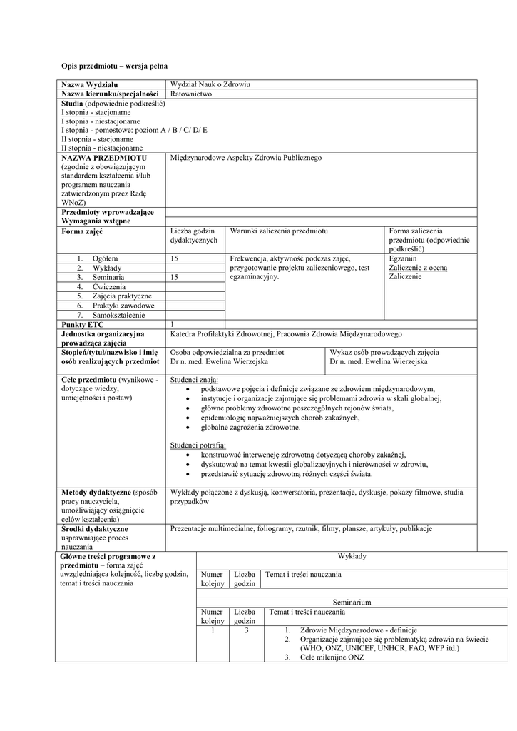 Opis przedmiotu – wersja pełna Wydział Nauk o Zdrowiu Nazwa Wydziału Nazwa kierunku/specjalności Ratownictwo Studia (odpowiednie podkreślić) I stopnia - stacjonarne I stopnia - niestacjonarne I stopnia - pomostowe: poziom A / B / C/ D/ E II stopnia - stacjonarne II stopnia - niestacjonarne Międzynarodowe Aspekty Zdrowia Publicznego NAZWA PRZEDMIOTU (zgodnie z obowiązującym standardem kształcenia i/lub programem nauczania zatwierdzonym przez Radę WNoZ) Przedmioty wprowadzające Wymagania wstępne Liczba godzin Warunki zaliczenia przedmiotu Forma zajęć dydaktycznych Frekwencja, aktywność podczas zajęć, przygotowanie projektu zaliczeniowego, test egzaminacyjny. Forma zaliczenia przedmiotu (odpowiednie podkreślić) Egzamin Zaliczenie z oceną Zaliczenie 1. Ogółem 2. Wykłady 3. Seminaria 4. Ćwiczenia 5. Zajęcia praktyczne 6. Praktyki zawodowe 7. Samokształcenie Punkty ETC Jednostka organizacyjna prowadząca zajęcia Stopień/tytuł/nazwisko i imię osób realizujących przedmiot 15 Cele przedmiotu (wynikowe dotyczące wiedzy, umiejętności i postaw) Studenci znają: podstawowe pojęcia i definicje związane ze zdrowiem międzynarodowym, instytucje i organizacje zajmujące się problemami zdrowia w skali globalnej, główne problemy zdrowotne poszczególnych rejonów świata, epidemiologię najważniejszych chorób zakaźnych, globalne zagrożenia zdrowotne. 15 1 Katedra Profilaktyki Zdrowotnej, Pracownia Zdrowia Międzynarodowego Wykaz osób prowadzących zajęcia Dr n. med. Ewelina Wierzejska Osoba odpowiedzialna za przedmiot Dr n. med. Ewelina Wierzejska Studenci potrafią: konstruować interwencję zdrowotną dotyczącą choroby zakaźnej, dyskutować na temat kwestii globalizacyjnych i nierówności w zdrowiu, przedstawić sytuację zdrowotną różnych części świata. Metody dydaktyczne (sposób Wykłady połączone z dyskusją, konwersatoria, prezentacje, dyskusje, pokazy filmowe, studia pracy nauczyciela, przypadków umożliwiający osiągnięcie celów kształcenia) Prezentacje multimedialne, foliogramy, rzutnik, filmy, plansze, artykuły, publikacje Środki dydaktyczne usprawniające proces nauczania Wykłady Główne treści programowe z przedmiotu – forma zajęć uwzględniająca kolejność, liczbę godzin, Numer Liczba Temat i treści nauczania temat i treści nauczania kolejny godzin Numer kolejny 1 Liczba godzin 3 Seminarium Temat i treści nauczania 1. 2. 3. Zdrowie Międzynarodowe - definicje Organizacje zajmujące się problematyką zdrowia na świecie (WHO, ONZ, UNICEF, UNHCR, FAO, WFP itd.) Cele milenijne ONZ 2 3 4. 3 3 5. 6. Zdrowie międzynarodowe – szanse dla studentów (praktyki, misje, organizacje pozarządowe zajmujące się zdrowiem międzynarodowym) Globalizacja a zdrowie Nierówności w zdrowiu na świecie 4 3 7. 8. 9. Dzieci w konfliktach zbrojnych Grypa (świńska, ptasia, sezonowa) Malaria – występowanie, gatunki, wektor, profilaktyka, leczenie 5 3 10. Prezentacja projektów zaliczeniowych. Numer kolejny Liczba godzin Ćwiczenia Temat i treści nauczania Zajęcia praktyczne Temat i treści nauczania Numer kolejny Liczba godzin Liczba godzin Temat i treści nauczania Praktyki zawodowe Wykaz literatury podstawowej dostępnej dla studenta (do 4 pozycji). Wykaz literatury uzupełniającej (do 4 pozycji). ─ ─ Samokształcenie Liczba Temat i treści nauczania godzin Włodarczyk C. W.: Zdrowie publiczne w perspektywie międzynarodowej. Wybrane problemy. Wydawnictwo Uniwersytetu Jagiellońskiego, Kraków 2007 http://www.who.int http://www.euro.who.int Karski J.: Postępy promocji zdrowia. Przegląd międzynarodowy. Wydawnictwo CeDeWu, Warszawa 2007 Detels R., McEwen J., Beaglehole R., Tanaka H. (eds.) Oxford Textbook of Public Health, Oxford Univ. Press, 2004 Należy stosować czcionkę Time New Roman, nr 9, pojedynczy odstęp między wierszami. Adres strony internetowej dla standardów kształcenia: http://www.bip.nauka.gov.pl/bipmein/index.jsp?place=Lead07&news_cat_id=117&news_id=982&layout=1&page=te xt