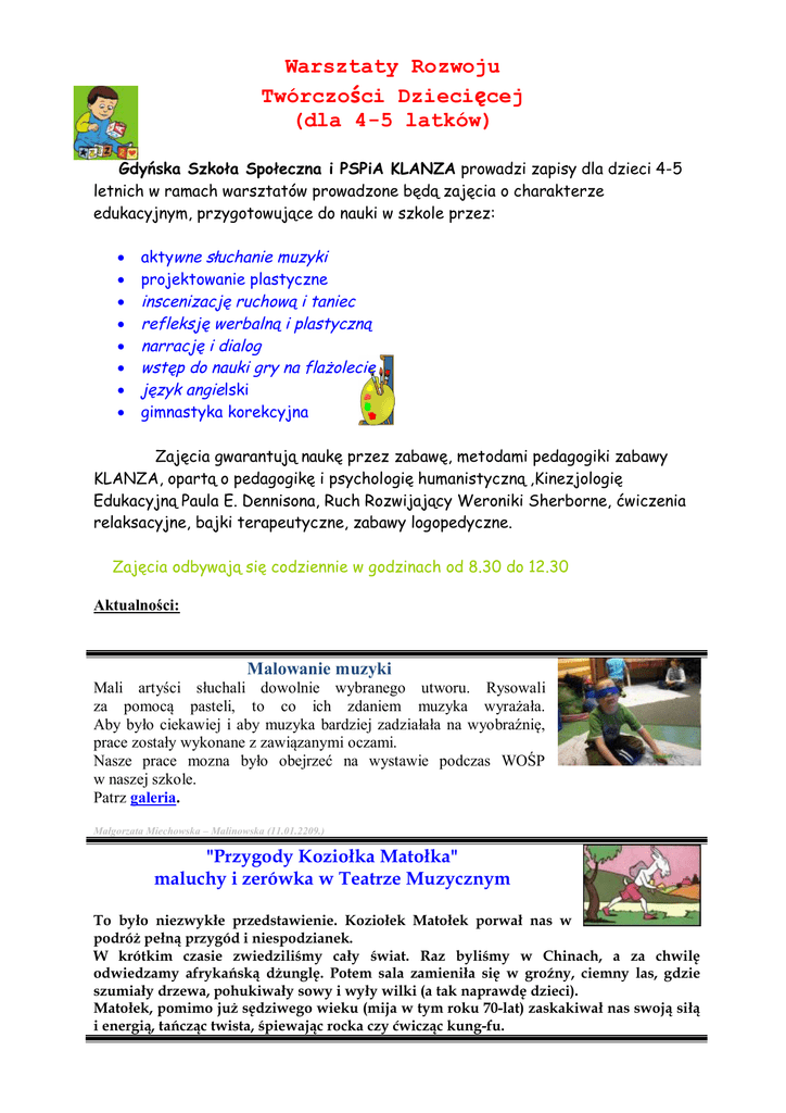 Warsztaty Rozwoju Twórczości Dziecięcej (dla 4-5 latków) Gdyńska Szkoła Społeczna i PSPiA KLANZA prowadzi zapisy dla dzieci 4-5 letnich w ramach warsztatów prowadzone będą zajęcia o charakterze edukacyjnym, przygotowujące do nauki w szkole przez: aktywne słuchanie muzyki projektowanie plastyczne inscenizację ruchową i taniec refleksję werbalną i plastyczną narrację i dialog wstęp do nauki gry na flażolecie język angielski gimnastyka korekcyjna Zajęcia gwarantują naukę przez zabawę, metodami pedagogiki zabawy KLANZA, opartą o pedagogikę i psychologię humanistyczną ,Kinezjologię Edukacyjną Paula E. Dennisona, Ruch Rozwijający Weroniki Sherborne, ćwiczenia relaksacyjne, bajki terapeutyczne, zabawy logopedyczne. Zajęcia odbywają się codziennie w godzinach od 8.30 do 12.30 Aktualności: Malowanie muzyki Mali artyści słuchali dowolnie wybranego utworu. Rysowali za pomocą pasteli, to co ich zdaniem muzyka wyrażała. Aby było ciekawiej i aby muzyka bardziej zadziałała na wyobraźnię, prace zostały wykonane z zawiązanymi oczami. Nasze prace mozna było obejrzeć na wystawie podczas WOŚP w naszej szkole. Patrz galeria. Małgorzata Miechowska – Malinowska (11.01.2209.) "Przygody Koziołka Matołka" maluchy i zerówka w Teatrze Muzycznym To było niezwykłe przedstawienie. Koziołek Matołek porwał nas w podróż pełną przygód i niespodzianek. W krótkim czasie zwiedziliśmy cały świat. Raz byliśmy w Chinach, a za chwilę odwiedzamy afrykańską dżunglę. Potem sala zamieniła się w groźny, ciemny las, gdzie szumiały drzewa, pohukiwały sowy i wyły wilki (a tak naprawdę dzieci). Matołek, pomimo już sędziwego wieku (mija w tym roku 70-lat) zaskakiwał nas swoją siłą i energią, tańcząc twista, śpiewając rocka czy ćwicząc kung-fu. Dzieci aktywnie uczestniczyły w przedstawieniu, ucząc się koziego języka, śpiewając piosenki, zapraszane były na scenę. To była prawdziwa zabawa w teatr. Takie przedstawienia zostanie na długo w pamięci. W mojej na pewno:-). Małgorzata Miechowska - Malinowska (11.01.2009) „Świąteczny nastrój” W szkole przygotowania do świąt już pełną parą. Słychać kolędy śpiewane po polsku i po angielsku, trwają przygotowania do występów jasełkowych i taśmowa produkcja łańcuchów na choinki. W powietrzu unosi się zapach pieczonych w świetlicy pierników. Zaś grupa przedszkolna wraz z dziećmi z zerówki napracowała się dzisiaj po same łokcie, wyrabiając ciasto, a z niego ... śliczne aniołki. Będzie prezent pod choinkę, jak malowany i do tego własna robótka, więc szczególnie cenny. Zapraszamy do obejrzenia kilku zdjęć w naszej szkolnej galerii: http://picasaweb.google.com/gss.gdynia1/MikoAjki2008?authkey=dkjAvaU37GM# Małgorzata Kusyk (08.12.2008.) Zerówka i Przedszkolaki na promie !!!! Wśród nadmorskich fal grupa 4, 5 i 6 - latków miała okazję ujarzmić wielki statek pasażerski Stena Line. Ta ogromna przestrzeń pokładowa przemierzona małymi stopami została poznana od środka, podziwiana na wszelkie możliwe sposób. Dzieci nie omieszkały odpocząć w kajutach, zaznajomić się z porządkiem u kapitana, poznać miejsce, w którym w podróż wypływają również samochody. Atrakcją stało się zgłębianie zagadnienia pomocy podczas ewentualnej ewakuacji łodzie ratunkowe zrobiły ogromne wrażenia. Tego dnia z plecaków znikły w pełni drugie śniadania, bo zapewne jedzenie w takich okolicznościach smakuje zdecydowanie lepiej. A gdyby tak wysłać ich w rejs... Atrakcje na pewno sprawiły, iż obraz tego wielkiego statku pasażerskiego pozostaną w pamięci pociech. Wspomnienia zapewne ożywają za sprawą upominków, którymi organizatorzy obdarowali naszych małych i dużych ciekawskich. A po szczegóły zapraszamy do galerii: http://picasaweb.google.com/gss.gdynia/NaPromie?authkey=_FGA2hlNq2Y Mirosława Sakłak (13.05.2008.) „Bąbelkowe szaleństwo” Kolejny raz czekały nas, czyli przedszkolaków, niezwykłe przygody z farbami. Tym razem, dmuchając przez słomkę, nasze farbki zamieniły się w pianę. Pani Małgosia, nasza czarodziejka, przyłożyła papier do piany. Pękające pęcherzyki utworzyły piękny marmurkowy wzór. A my z tego ozdobnego papieru zrobiliśmy obrazki. Nasze malarskie wzmagania zakończyły się zabawą w kolorowe łapki, ciapki, kropki, plamki. Ciekawe, co będzie następnym razem… A po szczegóły zapraszamy do galerii. Małgorzata Miechowska – Malinowska (10.02.2008.)