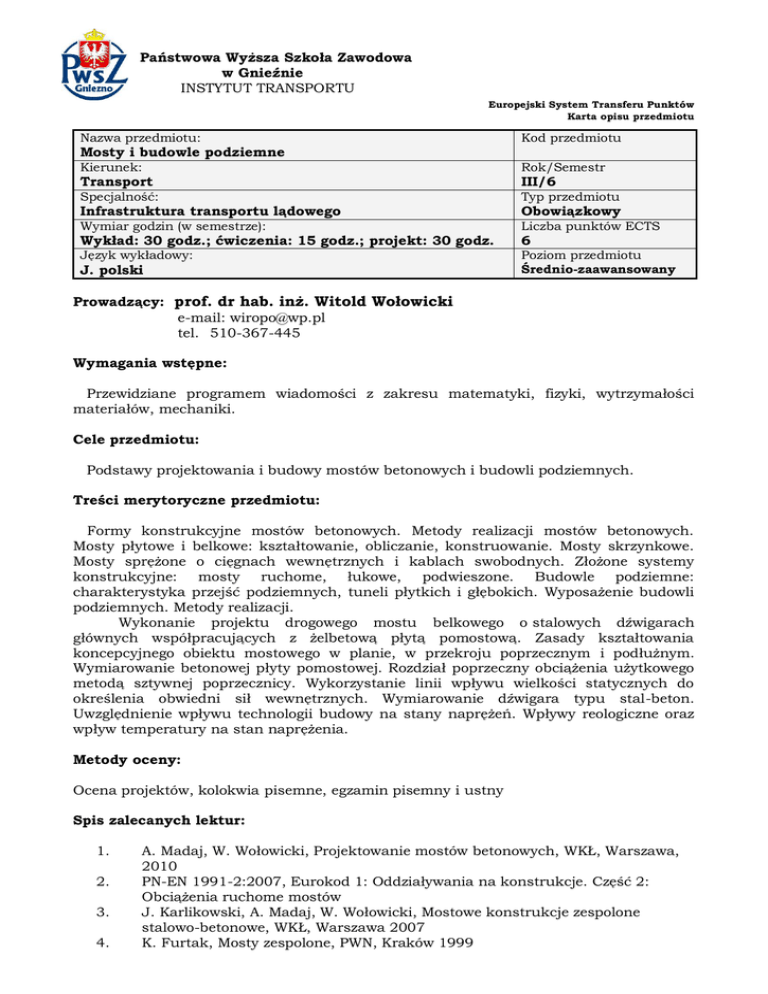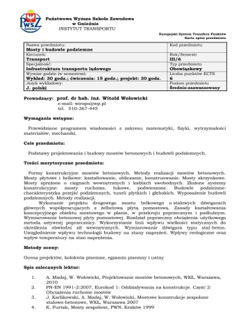 Państwowa Wyższa Szkoła Zawodowa w Gnieźnie INSTYTUT TRANSPORTU Europejski System Transferu Punktów Karta opisu przedmiotu Nazwa przedmiotu: Kod przedmiotu Mosty i budowle podziemne Kierunek: Rok/Semestr Transport III/6 Specjalność: Typ przedmiotu Infrastruktura transportu lądowego Obowiązkowy Wymiar godzin (w semestrze): Liczba punktów ECTS Język wykładowy: Poziom przedmiotu Średnio-zaawansowany Wykład: 30 godz.; ćwiczenia: 15 godz.; projekt: 30 godz. J. polski 6 Prowadzący: prof. dr hab. inż. Witold Wołowicki e-mail: [email protected] tel. 510-367-445 Wymagania wstępne: Przewidziane programem wiadomości z zakresu matematyki, fizyki, wytrzymałości materiałów, mechaniki. Cele przedmiotu: Podstawy projektowania i budowy mostów betonowych i budowli podziemnych. Treści merytoryczne przedmiotu: Formy konstrukcyjne mostów betonowych. Metody realizacji mostów betonowych. Mosty płytowe i belkowe: kształtowanie, obliczanie, konstruowanie. Mosty skrzynkowe. Mosty sprężone o cięgnach wewnętrznych i kablach swobodnych. Złożone systemy konstrukcyjne: mosty ruchome, łukowe, podwieszone. Budowle podziemne: charakterystyka przejść podziemnych, tuneli płytkich i głębokich. Wyposażenie budowli podziemnych. Metody realizacji. Wykonanie projektu drogowego mostu belkowego o stalowych dźwigarach głównych współpracujących z żelbetową płytą pomostową. Zasady kształtowania koncepcyjnego obiektu mostowego w planie, w przekroju poprzecznym i podłużnym. Wymiarowanie betonowej płyty pomostowej. Rozdział poprzeczny obciążenia użytkowego metodą sztywnej poprzecznicy. Wykorzystanie linii wpływu wielkości statycznych do określenia obwiedni sił wewnętrznych. Wymiarowanie dźwigara typu stal-beton. Uwzględnienie wpływu technologii budowy na stany naprężeń. Wpływy reologiczne oraz wpływ temperatury na stan naprężenia. Metody oceny: Ocena projektów, kolokwia pisemne, egzamin pisemny i ustny Spis zalecanych lektur: 1. 2. 3. 4. A. Madaj, W. Wołowicki, Projektowanie mostów betonowych, WKŁ, Warszawa, 2010 PN-EN 1991-2:2007, Eurokod 1: Oddziaływania na konstrukcje. Część 2: Obciążenia ruchome mostów J. Karlikowski, A. Madaj, W. Wołowicki, Mostowe konstrukcje zespolone stalowo-betonowe, WKŁ, Warszawa 2007 K. Furtak, Mosty zespolone, PWN, Kraków 1999
