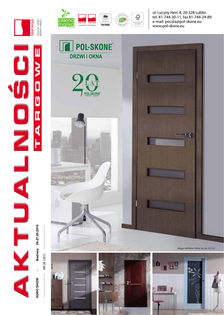 OFICJALNY PATRON MEDIALNY FUNDACJI AGRO SHOW - 321/3 druga reklama firmy na str. 62-63 NR 26 (321) Bednary 24-27.09.2010 T A R G O W E Laureat XI i XII edycji ul. Lucyny Herc 8, 20-328 Lublin tel. 81-744-30-11, fax 81-744-24-89 e-mail: [email protected] www.pol-skone.eu Yes,you can www.expovortal.com/gadzet sam wstaw swoje logo i zamów gadżet od redakcji SPIS TREŚCI Rolnictwo niemal od zawsze odgrywało ważną rolę w polskiej gospodarce i życiu mieszkańców kraju nad Wisłą. To jak sobie radzi w zmiennym otoczeniu warunkują głównie czynniki naturalne – temperatura, wilgotność, cyrkulacja mas powietrza, ukształtowanie terenu, żyzność i rodzaj podłoża, a także czynniki antropogeniczne, a więc struktura agrarna, polityka państwa, poziom cen i mechanizacji oraz wiedza na temat rolnictwa i tradycji upraw. Rolnictwo to także polska wieś – kiedyś chluba narodowa, symbol polskości, motor napędowy gospodarki – dziś odsunięta na bok, troszkę zapomniana, starzejąca się i opustoszała. Żyzne tereny rolne, na których jeszcze niedawno uprawiano zboża, kukurydzę czy ziemniaki, w wyniku rozrostu miast wchłaniających coraz większe obszary pod rozbudowę – bezustannie kurczą się, a tym samym polska wieś stopniowo znika z krajobrazu rolniczych terenów. A ci, którzy na niej pozostają borykają się z wieloma problemami organizacyjnymi, ekonomicznymi i prawnymi. Niewielkie gospodarstwa, których w kraju jest najwięcej, nie dysponują potencjałem rozwojowym, a wytworzone przez nie dobra zapewniają jedynie utrzymanie się gospodarującej rodzinie. Produkcja przestaje być opłacalna. Przychody z prowadzonej działalności są niewspółmierne do wysokich kosztów wytworzenia i utrzymania, a brak pieniędzy na poważne decyzje modernizacyjne wyhamowuje i tak powolny już rozwój polskiego rolnictwa. Ale na szczęście są ludzie, dla których rolnictwo jest pasją, powołaniem, a także sposobem na dobry biznes. Umiejętnie wykorzystują ukształtowanie terenu, zróżnicowanie warunków naturalnych pozwalających na bogatą strukturę zasiewów, a także dopłaty z UE na modernizację i zakup nowego sprzętu, nie pozwalając tym samym na całkowite zahamowanie rozwoju rolnictwa w Polsce. Patrząc z optymizmem na przyszłość rolnictwa, zapraszam Państwa serdecznie do Bednar k. Poznania na dwunastą już edycję największej w Polsce i jednej z największych w Europie międzynarodowych wystaw techniki rolniczej. Setki wystawców i tysiące zwiedzających z kraju i zagranicy potwierdzają znaczenie tego wydarzenia dla przedstawicieli branży. Atrakcją imprezy są firmowe poletka pokazowe, na których prezentowane są nowości światowych liderów sektora maszyn rolniczych, premiery rynkowe, nowe rozwiązania techniczne i technologiczne w ciekawej dla publiczności formule – w trakcie prac polowych. To niecodzienne show ukazujące pracę w naturalnych warunkach oferowanego sprzętu daje potencjalnym nabywcom pełną wiedzę na temat realnych możliwości i ewentualnych ograniczeń prezentowanych urządzeń, a proponowana przez organizatora formuła pomaga w nawiązaniu bliższych kontaktów handlowych skutkujących niejednokrotnie podpisaniem umów. Agro Show obok prezentacji najnowszej generacji maszyn i urządzeń proponuje zwiedzającym bogatą ofertę nasion, nawozów i innych środków produkcji rolnej. Poza częścią wystawienniczą w opracowanym programie wydarzeń towarzyszących imprezie zawarte są również specjalistyczne seminaria i branżowe spotkania. W tej edycji jednym z punktów tegoż programu jest debata z udziałem naukowców, przedsiębiorców i zainteresowanych rolników na temat oczekiwań polskiego rolnictwa co do zaopatrzenia w maszyny i urządzenia niezbędne do produkcji pt. „Polskie rolnictwo potrzebuje nowoczesnych maszyn rolniczych”. Ponadto uczniowie i studenci szkół o profilu rolniczym będą mieli okazję zmierzyć się w konkursie wiedzy rolniczej, a także stanąć w szranki w turnieju sprawnościowym. 25 września na Agro Show w pełnej gali rozstrzygnięty zostanie VIII Ogólnokrajowy Konkurs Bezpieczne Gospodarstwo Rolne, a jego laureaci uhonorowani zostaną atrakcyjnymi nagrodami. Tyle o samej imprezie, na której na pewno warto być! A co w „Aktualnościach Targowych”? Tym razem na 108 stronach prezentujemy sylwetki ponad 200 przedstawicieli sektora rolniczego: liderów rynku, instytucje branżowe, targowych medalistów, nowe atrakcyjne oferty handlowe i promocyjne oraz aktualne informacje na temat branży, a także dostępnych na rynku maszyn i urządzeń rolniczych. Życząc pięknej aury, która jest niewątpliwym sprzymierzeńcem tego rolniczego wydarzenia, zapraszam gorąco do lektury „Aktualności Targowych”. Odmienne oblicze Międzynarodowych Targów Hodowli Zwierząt FARMA 4 Ośrodki targowe 6 Instytucje branżowe 7 Najlepsza polska marka 15 Medaliści 16 ISO 20 Giganci branży 21 Z tradycją 32 Nowość 33 Liderzy rynku 34 ----------------------------------------------------------------------Prezentacje 47 Wystawcy 58 Tylko dla orłów 61 ----------------------------------------------------------------------Podział branż Maszyny, urządzenia, narzędzia rolnicze, ogrodnicze, leśne 68 Środki transportu, części zamienne 87 Urządzenia chłodnicze, klimatyzacyjne, grzewcze 88 Zwierzęcy materiał hodowlany 89 Pasze, dodatki paszowe 89 Nawozy, środki ochrony roślin 92 Nasiona roślin rolniczych i ogrodniczych 93 Budownictwo rolnicze 95 BHP 97 Opakowania, magazynowanie 98 Kwiaty, owoce, warzywa, zioła 99 Materiał szkółkarski 99 Podłoża i pojemniki 100 Informacja, usługi, doradztwo, informatyka w rolnictwie 101 Inne 103 Indeks branżowy 104 WYDAWCA Siedziba: Dąbrowskiego 23/4, 60-840 Poznań tel. 61-664-70-00, fax 61-664-70-01 e-mail: [email protected] www.aktualnosci.pl Katarzyna Skowrońska redaktor naczelna ZAPRASZAMY DO NASZEGO STOISKA NR 11 W HALI Wydawca Redaktor Naczelna Dy