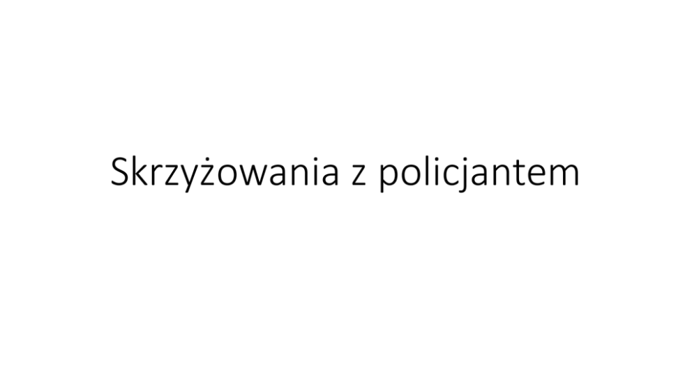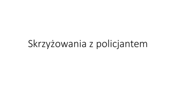 Skrzyżowania z policjantem Gdy ruchem kieruje policjant w wyjątkowych sytuacjach ruch drogowy może regulować wyznaczona do tego osoba, najczęściej policjant. Kiedy stoi on na skrzyżowaniu, piesi i kierowcy muszą podporządkować się wyłącznie dawanym przez niego znakom. Postawy kierującego ruchem JEDŹ Kierujący ruchem jest zwrócony bokiem do nadjeżdżających pojazdów- oznacza zezwolenie na wjazd na skrzyżowanie lub odcinek drogi za osobą kierującą ruchem, a dla pieszych zezwolenie na wejście na jezdnię. STÓJ Kierujący ruchem jest zwrócony przodem lub tyłem do nadjeżdżających pojazdów- oznacza zakaz wjazdu na skrzyżowanie lub odcinek drogi za osobą kierującą ruchem, a dla pieszych zakaz wejścia na jezdnię. UWAGA Kierujący ruchem podnosi rękę do góryoznacza mającą nastąpić zmianę dotychczas nadawanego sygnału. Przez skrzyżowanie przejadą D i B. Pojazdy A i C muszą stać, ponieważ policjant stoi do nich przodem i tyłem Przez skrzyżowanie przejadą B i C. Mogą jechać samochód 2 i 3.