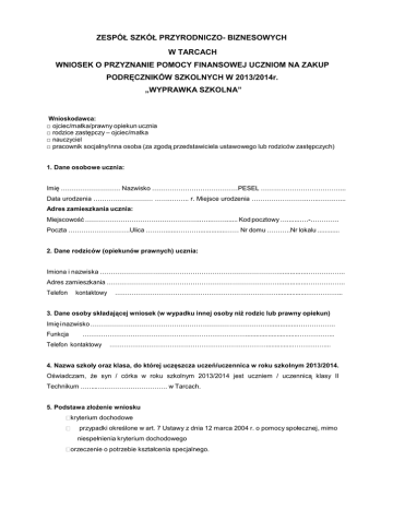 ZESPÓŁ SZKÓŁ PRZYRODNICZO- BIZNESOWYCH W TARCACH WNIOSEK O PRZYZNANIE POMOCY FINANSOWEJ UCZNIOM NA ZAKUP PODRĘCZNIKÓW SZKOLNYCH W 2013/2014r. „WYPRAWKA SZKOLNA” Wnioskodawca: □ ojciec/matka/prawny opiekun ucznia □ rodzice zastępczy – ojciec/matka □ nauczyciel □ pracownik socjalny/inna osoba (za zgodą przedstawiciela ustawowego lub rodziców zastępczych) 1. Dane osobowe ucznia: Imię ……………………… Nazwisko …………………………………PESEL ………………………………... Data urodzenia ……………………… ……..…….. r. Miejsce urodzenia ……………………..…..…….…... Adres zamieszkania ucznia: Miejscowość ……………………………………………..…..……....... Kod pocztowy ….......….-…………. Poczta ……………………….Ulica ……….......………...............…… Nr domu ………..Nr lokalu ............ 2. Dane rodziców (opiekunów prawnych) ucznia: Imiona i nazwiska ………………………………………………………………………................…………….. Adres zamieszkania ……………………………………………………………………................…………….. Telefon kontaktowy ……………………………………………………………………................……………... 3. Dane osoby składającej wniosek (w wypadku innej osoby niż rodzic lub prawny opiekun) Imię i nazwisko ………………………………………………………………………................…………….. Funkcja ……………………………………………………………………..............................……………... Telefon kontaktowy …………………………………………………………………...............…………….... 4. Nazwa szkoły oraz klasa, do której uczęszcza uczeń/uczennica w roku szkolnym 2013/2014. Oświadczam, że syn / córka w roku szkolnym 2013/2014 jest uczniem / uczennicą klasy II Technikum ……..…..………………………. w Tarcach. 5. Podstawa złożenie wniosku kryterium dochodowe przypadki określone w art. 7 Ustawy z dnia 12 marca 2004 r. o pomocy społecznej, mimo niespełnienia kryterium dochodowego orzeczenie o potrzebie kształcenia specjalnego. 6. Uzasadnienie wniosku o przyznanie pomocy materialnej - w przypadku uczniów przekraczających kryterium dochodowe na osobę w rodzinie (np. ubóstwo, bezdomność, bezrobocie, niepełnosprawność, długotrwała lub ciężka choroba, przemoc w rodzinie, alkoholizm lub narkomania, wielodzietność, rodzina niepełna itp.) ………………………………………………………………………………………………………………………. ………………………………………………………………………………………………………………………. ………………………………………………………………………………………………………………………. ………………………………………………………………………………………………………………………. ………………………………………………………………………………………………………………………. ………………………………………………………………………………………………………………………. 7. Dane dotyczące gospodarstwa domowego Oświadczam, że moja rodzina składa się z …….. osób pozostających we wspólnym gospodarstwie domowym. W skład rodziny wchodzą następujące osoby: l.p. Nazwisko i imię Data Stopień Miejsce pracy/miejsce nauki (nazwa i urodzenia pokrewieństwa typ szkoły) / źródło dochodu 1. 2. 3. 4. 5. 6. 7. 8. 9. 10. Łączny miesięczny dochód gospodarstwa domowego: Miesięczny dochód po przeliczeniu na osobę w rodzinie: Wysokość miesięczna dochodu netto 8. Załączniki Lista załączników (proszę wpisać ilość załączników dołączoną do wniosku) zaświadczenie z zakładu pracy o wysokości dochodu uzyskanego przez członka rodziny w miesiącu poprzedzającym złożenie wniosku (kwota brutto z wyszczególnieniem miesięcznego obciążenia podatkiem dochodowym od osób fizycznych, składki na ubezpieczenie zdrowotne oraz ubezpieczenia społeczne, kwotę alimentów świadczonych na rzecz innych osób), odcinek od renty/emerytury za miesiąc poprzedzający złożenie wniosku, oświadczenie o wysokości otrzymywanych alimentów (potwierdzone przekazem pocztowym lub wyciągiem bankowym), zaświadczenie z Powiatowego Urzędu Pracy w przypadku osób bezrobotnych (wraz z kwotą otrzymywanego zasiłku dla bezrobotnych), zaświadczenie z Urzędu Skarbowego o rodzaju prowadzonej pozarolniczej działalności gospodarczej oraz: w przypadku prowadzenia działalności opodatkowanej na zasadach określonych w przepisach o podatku dochodowym od osób fizycznych - zaświadczenie wydane przez naczelnika właściwego urzędu skarbowego, zawierające informację o wysokości : przychodu, kosztów uzyskania przychodu, różnicy pomiędzy przychodem a kosztami jego uzyskania, dochodów z innych źródeł ( w sytuacji gdy składający wniosek łączy przychody z działalności gospodarczej z innymi przychodami lub rozlicza się wspólnie z małżonkiem), odliczonych od dochodu składek na ubezpieczenie społeczne, należnego podatku, odliczonych od podatku składek na ubezpieczenie zdrowotne związanych z prowadzeniem pozarolniczej działalności gospodarczej; W przypadku prowadzenia pozarolniczej działalności na zasadach określonych w przepisach o zryczałtowanym podatku dochodowym – zaświadczenie wydane przez naczelnika właściwego urzędu skarbowego zawierające informację o formie opodatkowania oraz zdeklarowany w oświadczeniu dochód z działalności pomniejszony o należny zryczałtowany podatek dochodowy i zapła