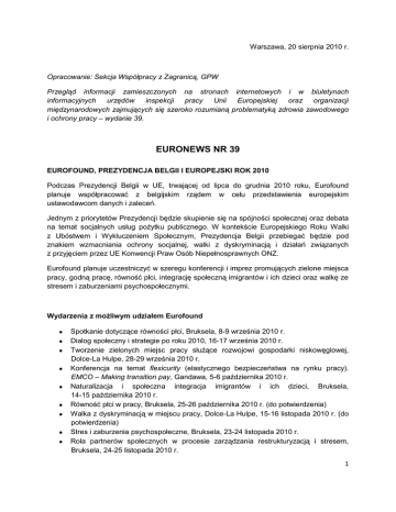 Warszawa, 20 sierpnia 2010 r. Opracowanie: Sekcja Współpracy z Zagranicą, GPW Przegląd informacji zamieszczonych na stronach internetowych i w biuletynach informacyjnych urzędów inspekcji pracy Unii Europejskiej oraz organizacji międzynarodowych zajmujących się szeroko rozumianą problematyką zdrowia zawodowego i ochrony pracy – wydanie 39. EURONEWS NR 39 EUROFOUND, PREZYDENCJA BELGII I EUROPEJSKI ROK 2010 Podczas Prezydencji Belgii w UE, trwającej od lipca do grudnia 2010 roku, Eurofound planuje współpracować z belgijskim rządem w celu przedstawienia europejskim ustawodawcom danych i zaleceń. Jednym z priorytetów Prezydencji będzie skupienie się na spójności społecznej na temat socjalnych usług pożytku publicznego. W kontekście Europejskiego z Ubóstwem i Wykluczeniem Społecznym, Prezydencja Belgii przebiegać znakiem wzmacniania ochrony socjalnej, walki z dyskryminacją i działań z przyjęciem przez UE Konwencji Praw Osób Niepełnosprawnych ONZ. oraz debata Roku Walki będzie pod związanych Eurofound planuje uczestniczyć w szeregu konferencji i imprez promujących zielone miejsca pracy, godną pracę, równość płci, integrację społeczną imigrantów i ich dzieci oraz walkę ze stresem i zaburzeniami psychospołecznymi. Wydarzenia z możliwym udziałem Eurofound Spotkanie dotyczące równości płci, Bruksela, 8-9 września 2010 r. Dialog społeczny i strategie po roku 2010, 16-17 września 2010 r. Tworzenie zielonych miejsc pracy służące rozwojowi gospodarki niskowęglowej, Dolce-La Hulpe, 28-29 września 2010 r. Konferencja na temat flexicurity (elastycznego bezpieczeństwa na rynku pracy). EMCO – Making transition pay, Gandawa, 5-6 października 2010 r. Naturalizacja i społeczna integracja imigrantów i ich dzieci, Bruksela, 14-15 października 2010 r. Równość płci w pracy, Bruksela, 25-26 października 2010 r. (do potwierdzenia) Walka z dyskryminacją w miejscu pracy, Dolce-La Hulpe, 15-16 listopada 2010 r. (do potwierdzenia) Stres i zaburzenia psychospołeczne, Bruksela, 23-24 listopada 2010 r. Rola partnerów społecznych w procesie zarządzania restrukturyzacją i stresem, Bruksela, 24-25 listopada 2010 r. 1 Konferencja Europejskiej Agencji Bezpieczeństwa i Zdrowia w Pracy, Bruksela, 26 listopada 2010 r. http://www.eurofound.europa.eu/presidencies/index.htm MINISTERSTWO OPIEKI SPOŁECZNEJ I PRACY REPUBLIKI LITEWSKIEJ 22 miliony litów przeznaczono na walkę z bezrobociem wśród młodzieży litewskiej Od sierpnia br. pracodawcy litewscy, którzy chcą zatrudnić młodych ludzi bez doświadczenia mogą korzystać z pomocy finansowej Europejskiego Funduszu Społecznego (EFS). Otrzymają oni dotacje i będą je mogli wykorzystać na pokrycie maksimum 50% wynagrodzenia za pracę i obowiązkowych składek na ubezpieczenie społeczne dla młodych pracowników. Powyższe przywileje będą przysługiwały tym pracodawcom, którzy przystąpią do nowego projektu "Bądź aktywny na rynku pracy" i zatrudnią osoby poniżej 29 roku życia zarejestrowane w urzędach pracy jako bezrobotne. Na realizację projektu "Bądź aktywny na rynku pracy" przeznaczono 22 miliony litów (ponad 19 milionów złotych). Powyższa kwota zostanie wykorzystana jako dotacja do zatrudniania (średnio przez okres 5 miesięcy) i pomoc w nabywaniu przez młodych ludzi kwalifikacji zawodowych (średnio przez okres 9 miesięcy). To pierwszy tego rodzaju projekt, którego celem jest wspieranie młodych ludzi i stymulowanie ich zatrudnienia. Realizacja projektu potrwa do końca 2012 roku. Projekt koncentruje się przede wszystkim na implementacji zmian w Ustawie o Wspieraniu Zatrudnienia, które mają ograniczyć bezrobocie. Powyższe zmiany zgłosiło Ministerstwo Opieki Społecznej i Pracy, a po uchwaleniu przez parlament litewski nowelę do Ustawy podpisał Prezydent kraju. "Wcześniej młodzi ludzi, którzy nie ukończyli 29 lat nie mogli otrzymać dodatkowej pomocy na rynku pracy i nie przysługiwało im prawo do subsydiów w zatrudnieniu, jeżeli nie należeli do innej z grup pracowników szczególnie chronionych na rynku pracy. Teraz oni również mogą uczestniczyć w tego typu projektach", powiedział Donatas Jankauskas, litewski Minister Opieki Socjalnej i Pracy na Litwie. Powyższe przywileje mają zachęcać pracodawców do zatrudniania osób nieposiadających żadnego doświadczenia zawodowego i szkolenia ich, tak aby nabyli wszelkie niezbędne 2 kwalifikacje do czasu kiedy dotowanie ich pracy przez państwo dobiegnie końca. Wsparcie finansowe ma również pomóc młodym ludziom ugruntować swoją pozycję na rynku pracy. Oczekuje się, że z rozwiązań na rzecz nabywania kwalifikacji zawodowych i subsydiów w zatrudnieniu skorzysta ponad 5200 młodych osób poniżej 29 roku życia, a co najmniej połowa z nich powinna otrzymać stałą pracę po zakończeniu okresu dotowania. 1 maja 2010 r. liczba osób w wieku poniżej 25 lat poszukujących pracy na Litwie wynosiła ponad 46 tysięcy, co stanowiło 14,6% wszystkich bezrobotnych zarejestrowanych w urzędach pracy. Artykuł w języku angielskim pochodzi z portalu internetowego litewskiego Ministerstwa Opieki Socjalnej i Pracy i jest dostępny pod adresem: http://www.socmin.lt/index.php?-1723240774 FIŃSKI INSTYTUT ZDROWIA ZAWODOWEGO (FIOH) Praca w nadgodzinach ma zły wpływ na serce Badania naukowe, których wyniki opublikowano niedawno w Europejskim Magazynie Serce wskazują, że osoby pracujące jedenaście lub więcej godzin dziennie są, w porównaniu z osobami pracującymi zwyczajowe osiem godzin, o 60% bardziej zagrożone chorobami układu krążenia, w tym zgonem w wyniku chorób serca lub zawałami i chorobami niedokrwiennymi serca. Dr Marianna Virtanen, epidemiolog z Fińskiego Instytutu Zdrowia Zawodowego (FIOH) powiedziała: "Związek pomiędzy długimi godzinami pracy i chorobami wieńcowymi był niezależny od innych czynników ryzyka, które zmierzyliśmy na samym początku badania, takich ja