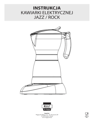 INSTRUKCJA KAWIARKI ELEKTRYCZNEJ JAZZ / ROCK Importer: Megapunkt 500 sp. z o.o. , Os. Oświecenia 30 31-636 Kraków, Poland www.megapunkt.pl MADE IN PRC Prosimy dokładnie przeczytać niniejszą instrukcję przed pierwszym uruchomieniem kawiarki. Postępowanie niezgodne z instrukcją może powodować utratę gwarancji. BUDOWA KAWIARKI Podane niżej nazwy są używane w dalszej treści instrukcji: A. Pokrywka B. Dysza C.Dzbanek D.Filtr E.Uszczelka F. Reduktor G.Lejek H.Zaworek I. Zbiornik J. Zasilacz K.Włącznik L. Kabel z wtyczką ZASADY BEZPIECZEŃSTWA • Urządzenie jest przeznaczone wyłącznie do parzenia kawy. Nie wolno w nim zaparzać żadnych ziół ani innych substancji. To może powodować zatkanie filtra i nadmierny wzrost ciśnienia. • W trakcie mycia nie wolno zamaczać kabla z wtyczką (L), zasilacza (J) ani zbiornika (I). Elementy te zawierają obwody elektryczne. • Posługując się kawiarką trzeba uważać, aby nie poparzyć się parą i nie ochlapać się gorącym naparem. • Posługując się urządzeniem nie wolno dotykać jego rozgrzanych części. Najlepiej używać jedynie uchwytu i przycisków. • Przed każdym użyciem zawsze sprawdzić, czy urządzenie jest kompletne i nie ma widocznych uszkodzeń. Jeśli tak nie jest prosimy nie używać kawiarki i skontaktować się ze sprzedawcą. • Wszystkie elementy opakowania (torebki, wypełnienia etc.) nie powinny być dostępne dla dzieci, bo mogą być niebezpieczne. • Kawiarka jest przeznaczona wyłącznie do użytku domowego. Użycie w innych warunkach lub bardziej intensywne prowadzi do usterek lub szybszego zużycia i nie jest objęte gwarancją. • Sprzedawca i producent nie odpowiadają za usterki i szkody wynikłe z użycia kawiarki niezgodnie z niniejszą instrukcją. • Żaden z elementów kawiarki nie może być używany na palniku (płomieniowym, elektrycznym, indukcyjnym etc.). • Nie wolno dotykać żadnego elementu kawiarki mokrymi dłońmi. • Urządzenie może być używane wyłącznie przez osoby dorosłe. Dzieci nie powinny się nim bawić nawet gdy nie jest podłączone. • Zawsze przed postawieniem kawiarki na zasilaczu (J) należy napełnić wodą zbiornik (I). Poziom wody w zbiorniku (I) msusi być poniżej zaworka(H). • K abel nie może się stykać z żadnym rozgrzanym elementem. • W przypadku uszkodzenia lub nieprawidłowego działania urządzenia prosimy je od razu wyłączyć i skontaktować się ze sprzedawcą Nie wolno dokonywać żadnych samodzielnych napraw lub przeróbek kawiarki pod sankcją utraty praw gwarancyjnych. Naprawy mogą być dokonywane tylko w zakładach usługowych wskazanych przez sprzedawcę lub importera. W przeciwnym wypadku sprzedawca i producent oraz importer nie ponoszą odpowiedzialności za żadne szkody. URUCHOMIENIE • Ustawić kawiarkę daleko do kranów i zlewów oraz palników. • Upewnić się, czy napięcie w gniazdku elektrycznym jest zgodne z opisem na kawiarce. Gniazdko powinno mieć uziemienie (zerowanie) o parametrze minimum 6A. • Jeśli wtyczka nie pasuje do gniazdka, należy ją wymienić w profesjonalnym serwisie napraw elektrycznych. ZAPARZANIE KAWY 1. Zimny korpus kawiarki rozkręcić, przytrzymując zbiornik (I) i obracając drugą dłonią dzbankiem (C) w kierunku przeciwnym do ruchu wskazówek zegara 2. Wyjąć lejek (G) i nalać wody do zbiornika (I). Aby zaparzyć maksymalną ilość kawy (6 fil) poziom wody powinien sięgać nieznacznie poniżej zaworka (H) we wnętrzu zbiornika. Aby uzyskać mniej naparu zbiornik (I) napełnić wodą do znacznika w jego wnętrzu (ok. 2 cm poniżej zaworka (H)) Wskazówka: dla dobrego smaku używać świeżej, miękkiej wody. UWAGA: Nie włączać kawiarki bez wody w zbiorniku. Nie wlewać ciepłej wody w celu skrócenia czasu parzenia. 3. Na zbiornik (I) nałożyć lejek (G) rurką do dołu. Napełnić lejek kawą w całości lub najpierw włożyć reduktor do lejka i dopiero zasypać go kawą także do pełna. 4. Zmieloną kawę wsypywać małymi porcjami, aby jej nie rozsypać. Po napełnieniu nie ubijać proszku , ale wyrównać jego poziom oraz oczyścić obrzeża lejka. WAŻNE: Należy używać dobrej jakości, średnio mielonej kawy przeznaczonej do kawiarek tzw. typu MOKA. 5. Na ustawiony na płaskiej powierzchni zbiornik (I) z wodą nakryty wypełnionym kawą lejkiem (G) należy nałożyć dzbanek (C) i skręcić obie części obracając nim powoli zgodnie z kierunkiem ruchu wskazówek zegara, aż do wyczuwalnego oporu uszczelki. Przed skręceniem należy upewnić się, że od spodu dzbanka (C) znajdują się dobrze umocowane i suche filtr (D) i uszczelka (E). 6. Skręconą kawiarkę ustawić na zasilaczu (J). 7. Włączyć zasilacz przyciskiem. 8. Po kilku minutach da się słyszeć szum pary wypychającej wrzącą wodę z pojemnika (I) do dzbanka (C). Po przeparowaniu większości wody szum przycichnie. Kawa jest gotowa. 9. Zdjąć kawiarkę z zasilacza (J) trzymając za uchwyt dzbanka (C). Lekko zamieszać napar poruszając kawiarką w poziomie i nalewać do filiżanek. 10.Jeśli w dzbanku pozostanie kawa, którą chcemy później rozlać, to odstawiamy ją na włączony zasilacz (C). Jeśli dzbanek jest pusty należy zasilacz (C) wyłączyć. WAŻNE: Przed pierwszym użyciem należy dokładnie umyć wnętrze zbiornika, dzbanek, filtr, uszczelkę, reduktor i lejek ciepłą wodą. Dla pewności dobrego smaku zaparzyć niewielką ilość kawy 2-3 razy i ją wylać. MYCIE I KONSERWACJA • Myć wyłącznie wystudzoną kawiarkę. • Od czasu do czasu szczególnie dokładnie wymyć dyszę (B). • Regularnie sprawdzać stan lejka (G) oraz uszczelki (E). Jeśli pojawią się widoczne ślady zużycia lub uszkodzenia, należy wadliwy element wymienić na nowy. • Jak najczęściej sprawdzać czy otwory filtra (D) nie są zatkane. Jeśli są to umyć filtr dokładnie przetykając otwory szpikulcem. • Kawiarki ani jej elementów nie wolno myć w zmywarce. • Kawiarkę najlepiej