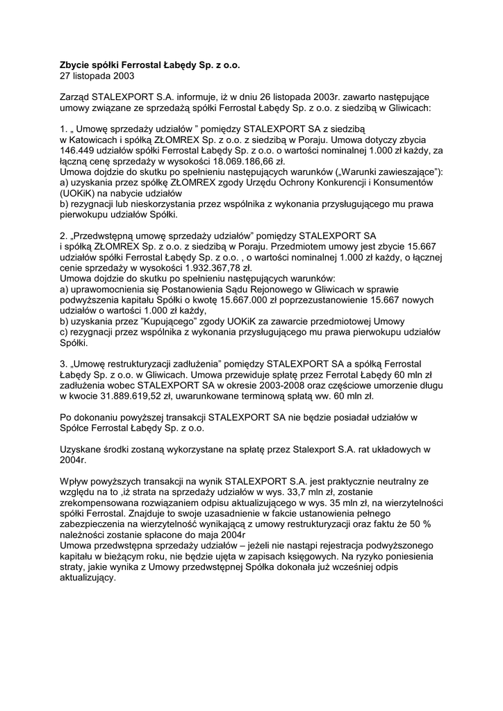 Zbycie spółki Ferrostal Łabędy Sp. z o.o. 27 listopada 2003 Zarząd STALEXPORT S.A. informuje, iż w dniu 26 listopada 2003r. zawarto następujące umowy związane ze sprzedażą spółki Ferrostal Łabędy Sp. z o.o. z siedzibą w Gliwicach: 1. „ Umowę sprzedaży udziałów ” pomiędzy STALEXPORT SA z siedzibą w Katowicach i spółką ZŁOMREX Sp. z o.o. z siedzibą w Poraju. Umowa dotyczy zbycia 146.449 udziałów spółki Ferrostal Łabędy Sp. z o.o. o wartości nominalnej 1.000 zł każdy, za łączną cenę sprzedaży w wysokości 18.069.186,66 zł. Umowa dojdzie do skutku po spełnieniu następujących warunków („Warunki zawieszające”): a) uzyskania przez spółkę ZŁOMREX zgody Urzędu Ochrony Konkurencji i Konsumentów (UOKiK) na nabycie udziałów b) rezygnacji lub nieskorzystania przez wspólnika z wykonania przysługującego mu prawa pierwokupu udziałów Spółki. 2. „Przedwstępną umowę sprzedaży udziałów” pomiędzy STALEXPORT SA i spółką ZŁOMREX Sp. z o.o. z siedzibą w Poraju. Przedmiotem umowy jest zbycie 15.667 udziałów spółki Ferrostal Łabędy Sp. z o.o. , o wartości nominalnej 1.000 zł każdy, o łącznej cenie sprzedaży w wysokości 1.932.367,78 zł. Umowa dojdzie do skutku po spełnieniu następujących warunków: a) uprawomocnienia się Postanowienia Sądu Rejonowego w Gliwicach w sprawie podwyższenia kapitału Spółki o kwotę 15.667.000 zł poprzezustanowienie 15.667 nowych udziałów o wartości 1.000 zł każdy, b) uzyskania przez ”Kupującego” zgody UOKiK za zawarcie przedmiotowej Umowy c) rezygnacji przez wspólnika z wykonania przysługującego mu prawa pierwokupu udziałów Spółki. 3. „Umowę restrukturyzacji zadłużenia” pomiędzy STALEXPORT SA a spółką Ferrostal Łabędy Sp. z o.o. w Gliwicach. Umowa przewiduje spłatę przez Ferrotal Łabędy 60 mln zł zadłużenia wobec STALEXPORT SA w okresie 2003-2008 oraz częściowe umorzenie długu w kwocie 31.889.619,52 zł, uwarunkowane terminową spłatą ww. 60 mln zł. Po dokonaniu powyższej transakcji STALEXPORT SA nie będzie posiadał udziałów w Spółce Ferrostal Łabędy Sp. z o.o. Uzyskane środki zostaną wykorzystane na spłatę przez Stalexport S.A. rat układowych w 2004r. Wpływ powyższych transakcji na wynik STALEXPORT S.A. jest praktycznie neutralny ze względu na to ,iż strata na sprzedaży udziałów w wys. 33,7 mln zł, zostanie zrekompensowana rozwiązaniem odpisu aktualizującego w wys. 35 mln zł, na wierzytelności spółki Ferrostal. Znajduje to swoje uzasadnienie w fakcie ustanowienia pełnego zabezpieczenia na wierzytelność wynikającą z umowy restrukturyzacji oraz faktu że 50 % należności zostanie spłacone do maja 2004r Umowa przedwstępna sprzedaży udziałów – jeżeli nie nastąpi rejestracja podwyższonego kapitału w bieżącym roku, nie będzie ujęta w zapisach księgowych. Na ryzyko poniesienia straty, jakie wynika z Umowy przedwstępnej Spółka dokonała już wcześniej odpis aktualizujący.