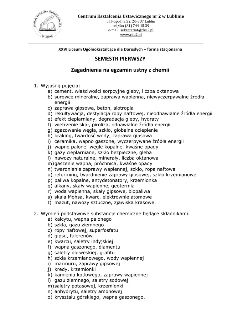 Centrum Kształcenia Ustawicznego nr 2 w Lublinie ul. Pogodna 52, 20-337 Lublin tel./fax (81) 744 15 39 e-mail: [email protected] www.cku2.pl XXVI Liceum Ogólnokształcące dla Dorosłych – forma stacjonarna SEMESTR PIERWSZY Zagadnienia na egzamin ustny z chemii 1. Wyjaśnij pojęcia: a) cement, właściwości sorpcyjne gleby, liczba oktanowa b) surowce mineralne, zaprawa wapienna, niewyczerpywalne źródła energii c) zaprawa gipsowa, beton, alotropia d) rekultywacja, destylacja ropy naftowej, nieodnawialne źródła energii e) efekt cieplarniany, degradacja gleby, hydraty f) wietrzenie skał, piroliza, odnawialne źródła energii g) zgazowanie węgla, szkło, globalne ocieplenie h) kraking, twardość wody, zaprawa gipsowa i) ceramika, wapno gaszone, wyczerpywane źródła energii j) wapno palone, węgle kopalne, kwaśne opady k) gazy cieplarniane, szkło bezpieczne, gleba l) nawozy naturalne, minerały, liczba oktanowa m) gaszenie wapna, próchnica, kwaśne opady n) twardnienie zaprawy wapiennej, szkło, ropa naftowa o) reforming, twardnienie zaprawy gipsowej, szkło krzemianowe p) paliwa kopalne, antydetonatory, krzemionka q) alkany, skały wapienne, geotermia r) woda wapienna, skały gipsowe, biopaliwa s) skala Mohsa, kwarc, elektrownie atomowe t) mazut, nawozy sztuczne, zjawiska krasowe. 2. Wymień podstawowe substancje chemiczne będące składnikami: a) kalcytu, wapna palonego b) szkła, gazu ziemnego c) ropy naftowej, superfosfatu d) gipsu, fulerenów e) kwarcu, saletry indyjskiej f) wapna gaszonego, diamentu g) saletry norweskiej, grafitu h) szkła krzemianowego, wody wapiennej i) marmuru, zaprawy gipsowej j) kredy, krzemionki k) kamienia kotłowego, zaprawy wapiennej l) gazu ziemnego, saletry sodowej m) saletry potasowej, krzemionki n) anhydrytu, saletry amonowej o) kryształu górskiego, wapna gaszonego. 3. Wyjaśnij: a) dlaczego szkło to ciało bezpostaciowe? b) dlaczego płonącej benzyny nie można gasić wodą? c) jak można odróżnić skały wapienne od gipsowych? d) na czym polega twardnienie zaprawy wapiennej? e) na czym polega twardnienie zaprawy gipsowej? f) na czym polega charakter kwasowy tlenku krzemu (IV)? g) czym różni się szkło od krzemionki? h) na czym polega proces produkcji szkła? i) na czym polegają różnice w budowie diamentu i grafitu? j) na czym polegają różnice we właściwościach diamentu i grafitu? k) na czym polega usuwanie twardości wody (przemijającej)? l) na czym polega proces wietrzenia skał wapiennych? m) na czym polega proces powstawania gleby? n) na czym polega destylacja ropy naftowej? o) na czym polega piroliza węgla? p) czym różni się piroliza od zgazowania? q) jakie są różnice pomiędzy odnawialnymi a nieodnawialnymi źródłami energii? r) jakie są sposoby podwyższenia liczby oktanowej benzyny? s) na czym polega rekultywacja gleb? t) jakie substancje chemiczne mogą spowodować zanieczyszczenie gleby? u) dlaczego kwasu fluorowodorowego nie przechowuje się w szklanych butlach? v) dlaczego czad jest trujący? 4. Zapisz równanie reakcji ilustrujące: a) mętnienie wody wapiennej b) gaszenie wapna c) twardnienie zaprawy wapiennej d) spalanie całkowite metanu e) proces trawienia szkła f) proces wietrzenia skał wapiennych g) twardnienie zaprawy gipsowej h) działanie kwasu solnego na skały wapienne i) prażenie gipsu j) prażenie wapienia k) pirolizę metanu l) niecałkowite spalanie węgla m) otrzymywanie szkła wodnego z krzemionki n) spalanie całkowite etanu o) rozkład termiczny węglanu wapnia.