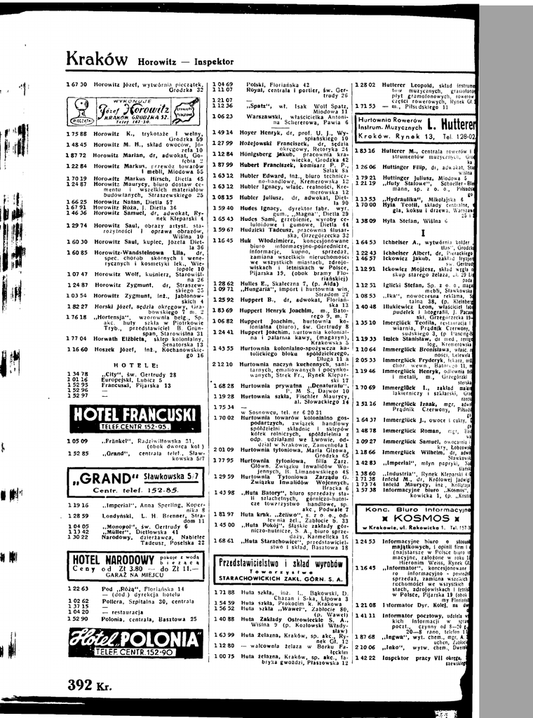 Kraków 167 Horowitz — Inspektor Horowitz Józef, wytwórnia pieczątek, Orodzka 32 30 WVK Qszef 0 NUJE yCorowitz KRAKÓW. GRODZKA Telef. i67-10. 175 SS 1 4 8 45 187 72 122 84 17019 124 87 166 167 146 29 91 36 129 74 160 30 160 83 107 47 124 87 103 54 1 82 27 17618 177 04 116 60 13478 10116 1 5 2 95 15296 19297 10623 32. Horowitz K., trykotaże I wełny. Grodzka 59 Horowitz M. H., sktad owoców, J ó zefa 10 Horowitz Marian, dr, adwokat. Go łębia 2 Horowitz Markus, przewóz towarów I mebli. Miodowa 55 Horowitz Markus Hirsch, Dietla 45 Horowitz Maurycy, biuro dostaw ce mentu I wszelkich materiałów budowlanych, Straszewskiego 25 Horowitz Natan, Dietla 67 Horowitz Róża, J. Dietla 36 Horowitz Samuel, dr, adwokat, Ry nek Kleparski 4 Horowitz Saul, obrazy artyst. sta rożytności I oprawa obrazów, Wiślna 10 Horowitz Saul, kupiec, Józefa Diet la 36 Horowitz-Wandstetnowa Lila, dr, spec. chorób skórnych I wene rycznych i kosmetyki lek., Wie lopole 10 Horowitz Wolf, kuśnierz, Starowiśl na 26 Horowitz Zygmunt, dr, Straszew skiego 25 Horowitz Zygmunt, inż., Jabłonow skich 4 Horskl Józef, sędzia okręgowy, Gra bowskiego 7 m. 2 „Hortensja", wzorownla belg., Sp. akc. huty szklą w Piotrkowie Tryb., przedstawiciel B . Orflnspan. Starowiślna 31 Horwath Elżbieta, sklep kolonialny. Senatorska 13 Hoszek Józef, Inż., Kochanowskie go 16 H O T E L E : „ C i t y " , św. Gertrudy 28 Europejski, Lubicz 5 Francuski, Pijarska 13 — — HOTEL FRANCUSKI 105 09 152 85 ff „Fränkel", Radziwiłłowska 3 1 , (obok dworca kol ) „Grand", centrala telef., Sław kowska 6/7 GRAND" Centr. 11916 12B99 104 113 130 05 42 22 telef. s < a w k o w s k a Ceny 122 63 10262 13715 1 04 20 152 90 392 5 / 7 152-85. „Imperial", Anna Sperling, Koper nika 8 Londyński. L. H. Brenner, Stra dom 11 ,.Monopol", św. Oertrudy 6 „Muller", Dietlowska 41 Narodowy, dzierżawca, Nabielec Tadeusz, Poselska 22 HOTEL NARODOWY pokoje z woda) od Zł 3.80 — do Zł GARAŻ NA MIEJCU 11.— Pod „ R ó ż ą " , Floriańska 14 — (dod ) dyrekcja hotelu Pollera, Szpitalna 30, centrala — restauracja Polonia, centrala, Basztowa 25 Kr. 1 04 69 11107 12107 112 36 149 14 127 99 112 84 1 87 99 16312 16312 10815 159 40 165 45 159 67 116 45 128 109 62 71 125 92 183 69 1 06 82 124 41 1 43 55 21210 168 28 119 28 175 34 170 02 Polski, Floriańska 42 Royal, centrala i portier, i w . Oer trudy 26 128 „ S p a t z " , wł. Isak Woli Spatz, Miodowa 11 Warszawski, właścicielka Antoni na Schererowa, Pawia 6 17155 Hoyer Henryk, dr, prof. U. ] . , Wy spiańskiego 10 Hożejowskl Franciszek, dr, sędzia okręgowy. Retoryka 24 Hönigsberg Jakub, pracownia kra wiecka, Grodzka 42 Hubert Franciszek, komisarz P. P., Szlak 8a Hubler Edward, Inż., biuro techniczno-handlowe, Kremerowska 12 Hubler Ignacy, wlaśc. realności, Kre merowska 12 Hubler Juliusz, dr, adwokat, Diet la 90 Hudes Ignacy, dyrektor fabr. wyr. gum., „ M a g n a " , Dietla 29 Hudes Sami, grzebienie, wyroby ce luloidowe 1 gumowe, Dietla 44 Hudzlcki Tadeusz, pracownia ślusar ska, Grzegórzecka 32 Hak Włodzimierz, koncesjonowane biuro inlormacyjno-posrednlcze, Informacje, kupno, sprzedaż, zamiana wszelkich nieruchomości we wszystkich miastach, zdrojo wiskach i letniskach w Polsce, Pijarska 19, (obok bramy Flo riańskiej) Hulles E., Skaleczna 7, (p. Aida) „Hungaria", import i hurtownia win, Stradom 27 Huppert B., dr, adwokat. Floriań ska 13 Huppert Henryk Joachim, m., Bato rego 9, m. 7 Huppert Joachim, hurtownia ko lonialna (biuro), św. Gertrudy 8 Huppert Joachim, hurtownia kolonial na I palarnia kawy, (magazyn), Krakowska 5 Hurtownia kolonialno-spożywcza ka tolickiego bloku spółdzielczego, Długa 11 a Hurtownia naczyń kuchennych, sani tarnych, emaliowanych i pocynkowanych, Strek Fr., Rynek Klepar ski 17 Hurtownia prywatna „Denaturatu", P. M S., Dajwór 10 Hurtownia szklą, Fischler Maurycy, al. Słowackiego 14 02 Hutterer Leopold, sktad instrume tów muzycznych, gramolono płyt gramofonowych, rowerów części rowerowych, Rynek 01 — m., Pitsidskiego 11 Hurtownia Rowerów I Insłrum. Muzycznych L « K r a k ó w . R y n e k 13, 183 UiiHara IlUllCTC Tel. 128-02] 16 Hutterer M., centrala rowerów I strumentów muzycznych, Gro 1 26 06 Huttinger Filip, dl, adwokat. Stii ka wiślna 179 21 Huttinger Juliusz, Miodowi i 12119 „Huty Stalowe", Schoeller-Blet mann, sp. z o. o., Piłsudski go 11555 170 00 „Hydraulika", Mikołajska 6 Hyla Teolil, składy centralne gla, koksu i drzewa, Warszawś 1 38 09 Hyla Stefan, Wiślna 6 1 64 53 Ichbeiser A., wytwórnia kołder tlas", Grodzki 1 22 43 Ichbeiser Albert, dr, Pierackiep 146 57 Ickowicz Jakub, zakład Iryzjers * Św. Gertrud: 112 91 Ickowicz Mojżesz, skład węgla skup starego żelaza, al. 29 Lis 112 51 Igllckl Stelan, Sp. z o. o., magai 108 53 „ I k a " , nowoczesna reklama, & talna 38, (p. Klelnberg llluklcwicz Leon, właściciel labi pudelek i litografii, J. Pacan 1 40 48 ski. 15510 Grzegórzecka 11 Imerglück Teoiila, restauracji I wiarnia, Prądnik Czerwony, sudskiego 3, (p. Dancing-I Imlcb Stanisław, dr med., renlg«| 11955 110 pada mebli, Sławkowski 64 2 0 5 33 log, Kremerowska Immergiiick Bronisława, włiśc. ri ności, Lelewela 119 46 Immergiiick Fryderyk, lekarz, ordj chor. wewn., Batorego U, ml Immergiiick Henryk, odlewnii i t l | i metali, m., Grzegórzki 170 69 ImmerglBck I . , zakład matan lakierniczy i szklarski, Gm 15116 sterska rzeck Immergiiick Izaak, mgr, adwo Prądnik Czerwony, Pllsuds w SosnoWcu, tel. nr 6 20 31 go Hurtownia towarów kolonlalno gos podarczych, związek handlowy 16457 Immergiiick J., owoce i cukry, spółdzielni składnic i sklepów kółek rolniczych, spółdzielnia z 148 78 Immergiiick Roman, mgr, Basj odp. udziałami we Lwowie, od 1 09 27 Immergiiick Samuel, owocarnii dział w Krakowie, Zamenhola 1 kry. Łobzowski 2 0109 Hurtownia tytoniowa, Marla Gizowa Grodzka 65 118 66 Immergiiick Wilhelm, dr, adworj Slawkowsl filia Zarz. 177 95 Hurtownia tytoniowa, Nai Otówn. Związku I