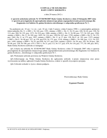 UCHWAŁA NR XIX/206/2012 RADY GMINY KROKOWA z dnia 29 marca 2012 r. w sprawie uchylenia uchwały Nr XVIII/98/2007 Rady Gminy Krokowa z dnia 23 listopada 2007 roku w sprawie przystąpienia do sporządzenia miejscowego planu zagospodarowania przestrzennego dla fragmentu wsi Sulicice II, gmina Krokowa określonego w załączniku graficznym Nr 1 . Na podstawie art. 18 ust. 1 w zw. z art. 18 ust. 2 pkt 5 ustawy z dnia 8 marca 1990 r. o samorządzie gminnym (tekst jednolity Dz. U. z 2001 r. Nr 142, poz. 1591, zmiany z 2002 r.: Dz. U. Nr 23, poz. 220, Nr 62, poz. 558, Nr 113, poz. 984, Nr 153, poz. 1271, Nr 214, poz. 1806, zmiany z 2003 r.: Dz. U. Nr 80, poz. 717, Nr 162, poz. 1568, zmiany z 2004 r.: Dz. U. Nr 102, poz. 1055, Nr 116, poz. 1203,Nr 167, poz. 1759, zmiany z 2005 r: Dz. U. Nr 172, poz. 1441, Dz. U. nr 175, poz. 1457, zmiany z 2006 r.: Dz. U. nr 17, poz. 128, Dz.U. nr. 181, poz. 1337; zmiany z 2007 r: Dz.U. Nr 48 poz. 327, nr 138, poz.974, Nr 173, poz. 1218, zmiany z 2008 r.: Nr 180, poz. 1111, Nr 223, poz. 1458, zmiany z 2009 r.: Nr 52, poz.420, Nr 157, poz.1241; zmiany z 2010 r. Nr 28, poz. 142, Nr 28 poz. 146, Nr 40, poz. 230, Nr 106, poz. 675; z 2011 r. Nr 21, poz.113, Nr 117, poz. 679, Nr 134, poz. 777, Nr 149, poz. 887), Rada Gminy Krokowa uchwala co następuje: § 1. Uchyla się uchwałę Nr XVIII/98/2007 Rady Gminy Krokowa z dnia 23 listopada 2007 roku w sprawie przystąpienia do sporządzenia miejscowego planu zagospodarowania przestrzennego dla fragmentu wsi Sulicice II, gmina Krokowa , określonego w załączniku graficznym Nr 1 . § 2. Wykonanie uchwały powierza się Wójtowi Gminy Krokowa. § 3. Zobowiązuje się Wójta Gminy Krokowa do ogłoszenia uchwały w prasie miejscowej oraz przez wywieszenie na tablicy ogłoszeń Urzędu Gminy Krokowa, a także w sposób zwyczajowo przyjęty. § 4. Uchwała wchodzi w życie z dniem podjęcia . Przewodniczący Rady Gminy Zygmunt Piontek Id: 0F15CE78-14CD-496E-8CAF-DFDA5B7430DC. Podpisany Strona 1 Uzasadnienie W dniu 23 listopada 2007 roku Rada Gminy Krokowa podjęła uchwałę Nr XVIII/98/2007w sprawie przystąpienia do sporządzenia miejscowego planu zagospodarowania przestrzennego dla fragmentu wsi Sulicice II, gmina Krokowa określonego w załączniku graficznym Nr 1 . Z wnioskiem z dnia 09.02.2007r. , inwestor „Krokowa 2010 SP z o.o” zwrócił się o skierowanie pod obrady Rady Gminy Krokowa o podjęcie w/w uchwały. Prace nad sporządzeniem miejscowego planu na podstawie w/w uchwały nie były zaawansowane proceduralnie, osiągnęły etap opracowania projektu planu. W pismach kierowanych do firmy opracowującej miejscowy plan wskazywano , że podstawowym przeznaczeniem i funkcją terenu objętego projektem planu winno być pole golfowe. Ponadto jednoznacznie nie wyjaśniono, czy na wskazanym terenie możliwa jest w ogóle lokalizacja i budowa pola golfowego (brak w jednym kawałku terenu co najmniej o powierzchni 70 ha na budowę pola golfowego dla tzw. 18 „dołków”), nawet z uwzględnieniem terenu , dla którego równolegle przystąpiono do sporządzenia miejscowego planu dla fragmentu wsi Sulicice I, również z przeznaczeniem na pole golfowe. Potencjalny inwestor (poza jednym spotkaniem z Radnymi w celach prezentacji jednego z wariantów planu ) nie nawiązywał współpracy i nie zawarł żadnego stanowiska w sprawie partycypacji w kosztach inwestycyjnych niezbędnych do wykonania infrastruktury wodociągowo-kanalizacyjnej przy realizacji przedmiotowej inwestycji. Mając powyższe na uwadze oraz brak również publicznego interesu gminy i konieczności opracowania w/w planu stwierdza się, że istnieją wystarczające przesłanki do podjęcia powyższej uchwały. Id: 0F15CE78-14CD-496E-8CAF-DFDA5B7430DC. Podpisany Strona 1