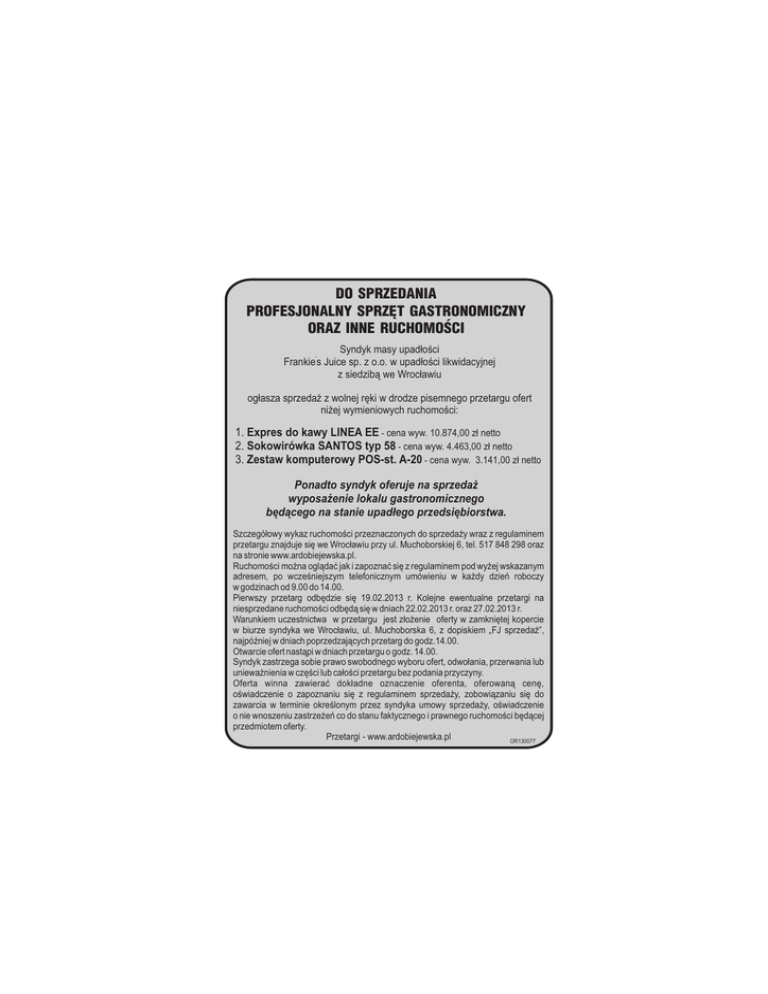 DO SPRZEDANIA PROFESJONALNY SPRZÊT GASTRONOMICZNY ORAZ INNE RUCHOMOŒCI Syndyk masy upad³oœci Frankies' Juice sp. z o.o. w upad³oœci likwidacyjnej z siedzib¹ we Wroc³awiu og³asza sprzeda¿ z wolnej rêki w drodze pisemnego przetargu ofert ni¿ej wymieniowych ruchomoœci: 1. Expres do kawy LINEA EE - cena wyw. 10.874,00 z³ netto 2. Sokowirówka SANTOS typ 58 - cena wyw. 4.463,00 z³ netto 3. Zestaw komputerowy POS-st. A-20 - cena wyw. 3.141,00 z³ netto Ponadto syndyk oferuje na sprzeda¿ wyposa¿enie lokalu gastronomicznego bêd¹cego na stanie upad³ego przedsiêbiorstwa. Szczegó³owy wykaz ruchomoœci przeznaczonych do sprzeda¿y wraz z regulaminem przetargu znajduje siê we Wroc³awiu przy ul. Muchoborskiej 6, tel. 517 848 298 oraz na stronie www.ardobiejewska.pl. Ruchomoœci mo¿na ogl¹daæ jak i zapoznaæ siê z regulaminem pod wy¿ej wskazanym adresem, po wczeœniejszym telefonicznym umówieniu w ka¿dy dzieñ roboczy w godzinach od 9.00 do 14.00. Pierwszy przetarg odbêdzie siê 19.02.2013 r. Kolejne ewentualne przetargi na niesprzedane ruchomoœci odbêd¹ siê w dniach 22.02.2013 r. oraz 27.02.2013 r. Warunkiem uczestnictwa w przetargu jest z³o¿enie oferty w zamkniêtej kopercie w biurze syndyka we Wroc³awiu, ul. Muchoborska 6, z dopiskiem „FJ sprzeda¿”, najpóŸniej w dniach poprzedzaj¹cych przetarg do godz.14.00. Otwarcie ofert nast¹pi w dniach przetargu o godz. 14.00. Syndyk zastrzega sobie prawo swobodnego wyboru ofert, odwo³ania, przerwania lub uniewa¿nienia w czêœci lub ca³oœci przetargu bez podania przyczyny. Oferta winna zawieraæ dok³adne oznaczenie oferenta, oferowan¹ cenê, oœwiadczenie o zapoznaniu siê z regulaminem sprzeda¿y, zobowi¹zaniu siê do zawarcia w terminie okreœlonym przez syndyka umowy sprzeda¿y, oœwiadczenie o nie wnoszeniu zastrze¿eñ co do stanu faktycznego i prawnego ruchomoœci bêd¹cej przedmiotem oferty. Przetargi - www.ardobiejewska.pl OR130077