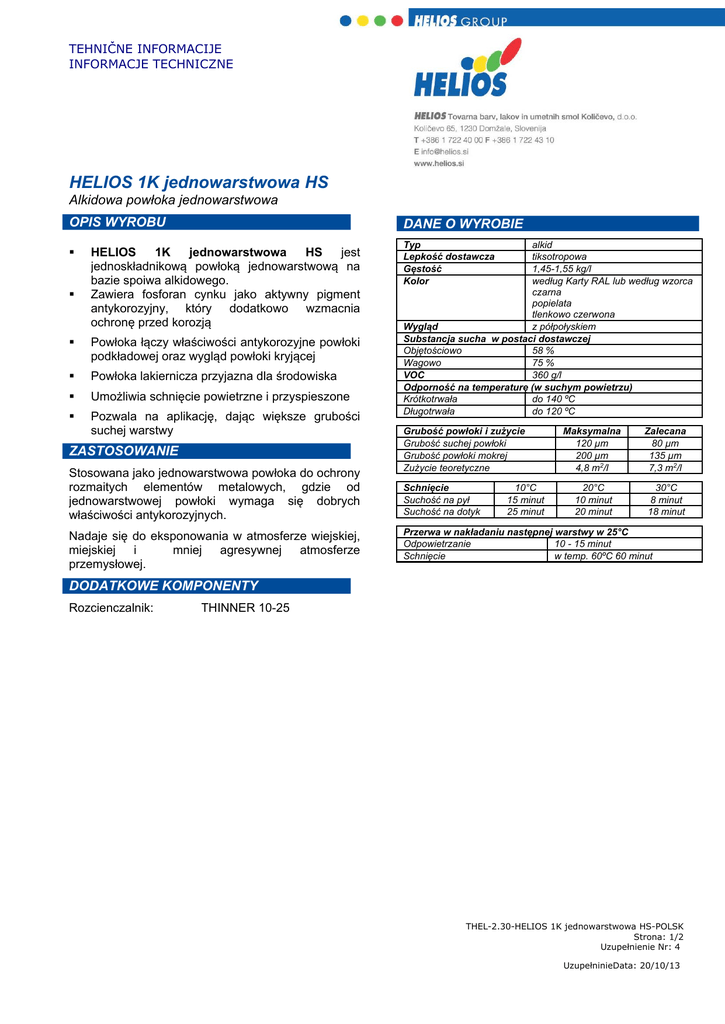 TEHNIČNE INFORMACIJE INFORMACJE TECHNICZNE HELIOS 1K jednowarstwowa HS Alkidowa powłoka jednowarstwowa OPIS WYROBU DANE O WYROBIE HELIOS 1K jednowarstwowa HS jest jednoskładnikową powłoką jednowarstwową na bazie spoiwa alkidowego. Zawiera fosforan cynku jako aktywny pigment antykorozyjny, który dodatkowo wzmacnia ochronę przed korozją Powłoka łączy właściwości antykorozyjne powłoki podkładowej oraz wygląd powłoki kryjącej Powłoka lakiernicza przyjazna dla środowiska Umożliwia schnięcie powietrzne i przyspieszone Pozwala na aplikację, dając większe grubości suchej warstwy ZASTOSOWANIE Stosowana jako jednowarstwowa powłoka do ochrony rozmaitych elementów metalowych, gdzie od jednowarstwowej powłoki wymaga się dobrych właściwości antykorozyjnych. Nadaje się do eksponowania w atmosferze wiejskiej, miejskiej i mniej agresywnej atmosferze przemysłowej. Typ Lepkość dostawcza Gęstość Kolor alkid tiksotropowa 1,45-1,55 kg/l według Karty RAL lub według wzorca czarna popielata tlenkowo czerwona Wygląd z półpołyskiem Substancja sucha w postaci dostawczej Objętościowo 58 % Wagowo 75 % VOC 360 g/l Odporność na temperaturę (w suchym powietrzu) Krótkotrwała do 140 ºC Długotrwała do 120 ºC Grubość powłoki i zużycie Grubość suchej powłoki Grubość powłoki mokrej Zużycie teoretyczne Schnięcie Suchość na pył Suchość na dotyk 10°C 15 minut 25 minut Maksymalna 120 µm 200 µm 4,8 m2/l Zalecana 80 µm 135 µm 7,3 m2/l 20°C 10 minut 20 minut 30°C 8 minut 18 minut Przerwa w nakładaniu następnej warstwy w 25°C Odpowietrzanie 10 - 15 minut Schnięcie w temp. 60ºC 60 minut DODATKOWE KOMPONENTY Rozcienczalnik: THINNER 10-25 THEL-2.30-HELIOS 1K jednowarstwowa HS-POLSK Strona: 1/2 Uzupełnienie Nr: 4 UzupełninieData: 20/10/13 PRZYGOTOWANIE POWIERZCHNI SYSTEMY LAKIERNICZE Powierzchnie stalowe powinny być suche, czyste, odtłuszczone, bez produktów korozji i innych zanieczyszczeń. Zaleca się piaskowanie wg normy ISO 8501 do stopnia Sa 2,5. Chropowatość nowych powierzchni: 20-40 µm. Systemy powłok lakierniczych dobieramy ze względu na rodzaj wpływów klimatycznych, zgodnie z zaleceniami standardu EN ISO 12944. PRZECHOWYWANIE WARUNKI PRACY 24 miesiące w temperaturze do +35ºC Minimalna temperatura podczas aplikacji +5º C. Wilgotność względna powietrza od 20% do 85%. Temperatura powierzchni powinna wynosić najmniej 3ºC powyżej punktu rosy. BHP co SPOSÓB NAKŁADANIA Wyrób przed użyciem musi być dokładnie wymieszany. NATRYSK AIRLESS Rozcieńczanie: Średnica dyszy: Ciś. wyjściowe: DO 10 % objętościowo 0,33 - 0,48 mm 12 - 15 MPa Patrz Karta Charakterystyki niebezpiecznej oraz etykieta wyrobu. Substancji UWAGI Dla każdej szarży farby wydajemy odpowiednie świadectwo jakości. Informacje techniczne są wynikiem wiedzy, opartej na pracy laboratoryjnej i doświadczeniach praktycznych. W przypadku zastosowania powłoki lakierniczej poza naszą kontrolą nie możemy przejąć odpowiedzialności i gwarantujemy tylko jakość powłoki jako takiej. Zastrzegamy sobie prawo do zmian danych bez uprzedniego zawiadomienia. System jakości jest zgodny z EN ISO 9001. NATRYSK POWIETRZNY Rozcieńczanie: Średnica dyszy: Ciś. wyjściowe: DO 15 % objętościowo 1,3 - 1,7 mm 0,3 - 0,5 MPa Procent dodanego rozcieńczalnika zależy od temperatury farby. Podana informacja odnosi się do temperatury farby 20ºC. THEL-2.30-HELIOS 1K jednowarstwowa HS-POLSK Strona: 2/2 Uzupełnienie Nr: 4 UzupełninieData: 20/10/13