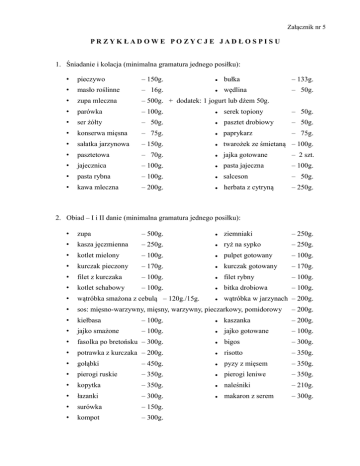 Załącznik nr 5 PRZYK ŁAD OWE PO ZYC J E JADŁ O SPI S U 1. Śniadanie i kolacja (minimalna gramatura jednego posiłku): • pieczywo – 150g. ● bułka – 133g. • masło roślinne – 16g. ● wędlina – 50g. • zupa mleczna – 500g. + dodatek: 1 jogurt lub dżem 50g. • parówka – 100g. ● serek topiony – 50g. • ser żółty – 50g. ● pasztet drobiowy – 50g. • konserwa mięsna – 75g. ● paprykarz – 75g. • sałatka jarzynowa – 150g. ● twarożek ze śmietaną – 100g. • pasztetowa – 70g. ● jajka gotowane – 2 szt. • jajecznica – 100g. ● pasta jajeczna – 100g. • pasta rybna – 100g. ● salceson – 50g. • kawa mleczna – 200g. ● herbata z cytryną – 250g. 2. Obiad – I i II danie (minimalna gramatura jednego posiłku): • zupa – 500g. ● ziemniaki – 250g. • kasza jęczmienna – 250g. ● ryż na sypko – 250g. • kotlet mielony – 100g. ● pulpet gotowany – 100g. • kurczak pieczony – 170g. ● kurczak gotowany – 170g. • filet z kurczaka – 100g. ● filet rybny – 100g. • kotlet schabowy – 100g. ● bitka drobiowa – 100g. • wątróbka smażona z cebulą – 120g./15g. ● wątróbka w jarzynach – 200g. • sos: mięsno-warzywny, mięsny, warzywny, pieczarkowy, pomidorowy – 200g. • kiełbasa – 100g. ● kaszanka – 200g. • jajko smażone – 100g. ● jajko gotowane – 100g. • fasolka po bretońsku – 300g. ● bigos – 300g. • potrawka z kurczaka – 200g. ● risotto – 350g. • gołąbki – 450g. ● pyzy z mięsem – 350g. • pierogi ruskie – 350g. ● pierogi leniwe – 350g. • kopytka – 350g. ● naleśniki – 210g. • łazanki – 300g. ● makaron z serem – 300g. • surówka – 150g. • kompot – 300g.