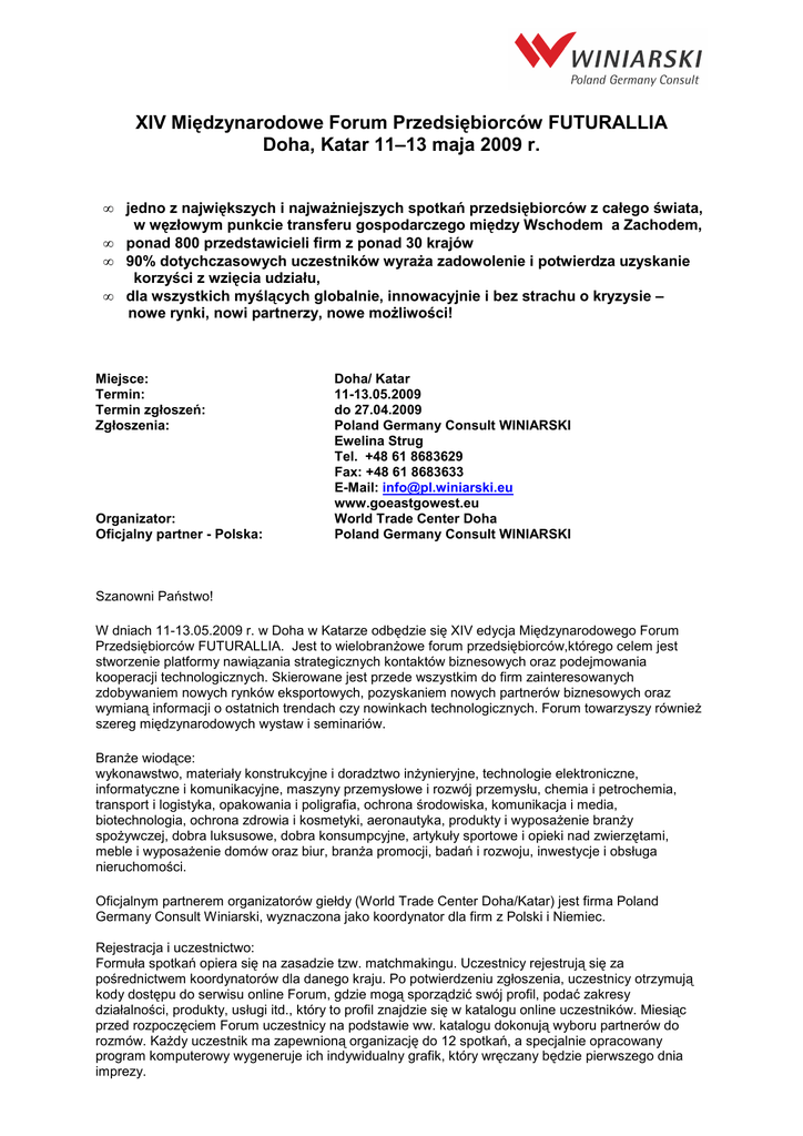 XIV Międzynarodowe Forum Przedsiębiorców FUTURALLIA Doha, Katar 11–13 maja 2009 r. • • • • jedno z największych i najwaŜniejszych spotkań przedsiębiorców z całego świata, w węzłowym punkcie transferu gospodarczego między Wschodem a Zachodem, ponad 800 przedstawicieli firm z ponad 30 krajów 90% dotychczasowych uczestników wyraŜa zadowolenie i potwierdza uzyskanie korzyści z wzięcia udziału, dla wszystkich myślących globalnie, innowacyjnie i bez strachu o kryzysie – nowe rynki, nowi partnerzy, nowe moŜliwości! Miejsce: Termin: Termin zgłoszeń: Zgłoszenia: Organizator: Oficjalny partner - Polska: Doha/ Katar 11-13.05.2009 do 27.04.2009 Poland Germany Consult WINIARSKI Ewelina Strug Tel. +48 61 8683629 Fax: +48 61 8683633 E-Mail: [email protected] www.goeastgowest.eu World Trade Center Doha Poland Germany Consult WINIARSKI Szanowni Państwo! W dniach 11-13.05.2009 r. w Doha w Katarze odbędzie się XIV edycja Międzynarodowego Forum Przedsiębiorców FUTURALLIA. Jest to wielobranŜowe forum przedsiębiorców,którego celem jest stworzenie platformy nawiązania strategicznych kontaktów biznesowych oraz podejmowania kooperacji technologicznych. Skierowane jest przede wszystkim do firm zainteresowanych zdobywaniem nowych rynków eksportowych, pozyskaniem nowych partnerów biznesowych oraz wymianą informacji o ostatnich trendach czy nowinkach technologicznych. Forum towarzyszy równieŜ szereg międzynarodowych wystaw i seminariów. BranŜe wiodące: wykonawstwo, materiały konstrukcyjne i doradztwo inŜynieryjne, technologie elektroniczne, informatyczne i komunikacyjne, maszyny przemysłowe i rozwój przemysłu, chemia i petrochemia, transport i logistyka, opakowania i poligrafia, ochrona środowiska, komunikacja i media, biotechnologia, ochrona zdrowia i kosmetyki, aeronautyka, produkty i wyposaŜenie branŜy spoŜywczej, dobra luksusowe, dobra konsumpcyjne, artykuły sportowe i opieki nad zwierzętami, meble i wyposaŜenie domów oraz biur, branŜa promocji, badań i rozwoju, inwestycje i obsługa nieruchomości. Oficjalnym partnerem organizatorów giełdy (World Trade Center Doha/Katar) jest firma Poland Germany Consult Winiarski, wyznaczona jako koordynator dla firm z Polski i Niemiec. Rejestracja i uczestnictwo: Formuła spotkań opiera się na zasadzie tzw. matchmakingu. Uczestnicy rejestrują się za pośrednictwem koordynatorów dla danego kraju. Po potwierdzeniu zgłoszenia, uczestnicy otrzymują kody dostępu do serwisu online Forum, gdzie mogą sporządzić swój profil, podać zakresy działalności, produkty, usługi itd., który to profil znajdzie się w katalogu online uczestników. Miesiąc przed rozpoczęciem Forum uczestnicy na podstawie ww. katalogu dokonują wyboru partnerów do rozmów. KaŜdy uczestnik ma zapewnioną organizację do 12 spotkań, a specjalnie opracowany program komputerowy wygeneruje ich indywidualny grafik, który wręczany będzie pierwszego dnia imprezy. Koszt uczestnictwa:1350 euro obejmujący: - organizację do 12 spotkań biznesowych/mozliwosc dodatkowych spotkan poza grafikiem - wpis do katalogu Forum - obecność w bazie danych Futurallia 2009 przez okres jednego roku - calodzienne wyzywienie, udział w bankiecie i wieczorze międzynarodowym - udział w seminariach i wystawach - usługi tłumaczy - 3 noclegi Podmioty zainteresowane serdecznie zapraszamy i prosimy o kontakt: Ewelina Strug Tel. +48 61 868 36 29 Fax: +48 61 868 36 33 E-Mail: [email protected] Prześlemy formularz zgłoszeniowy i udzielimy wszelkich niezbędnych informacji. Dziękujemy. Z powaŜaniem WINIARSKI Poland Germany Consult Business Center Poznań World Trade Center Poznań, pawilon 5, pokój 124 (1. p) ul. Bukowska 12 | PL-60-810 Poznań Tel. +48 61 868 36 29 | Fax +48 61 868 36 33 [email protected] | www.winiarski.eu Business Center Berlin Westhafenstr. 1 | D-13353 Berlin Tel. +49 30 21 96 60 38 | Fax +49 30 21 96 61 74 [email protected] | www.winiarski.eu