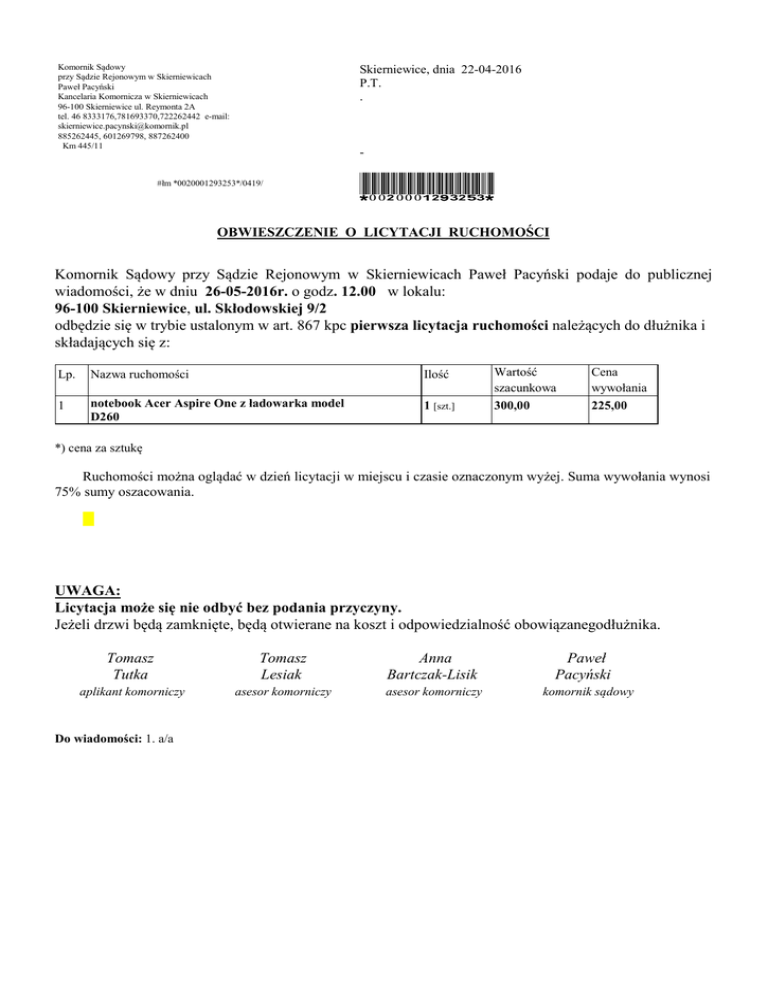 Komornik Sądowy przy Sądzie Rejonowym w Skierniewicach Paweł Pacyński Kancelaria Komornicza w Skierniewicach 96-100 Skierniewice ul. Reymonta 2A tel. 46 8333176,781693370,722262442 e-mail: [email protected] 885262445, 601269798, 887262400 Km 445/11 Skierniewice, dnia 22-04-2016 P.T. . - #łm *0020001293253*/0419/ *0020001293253* OBWIESZCZENIE O LICYTACJI RUCHOMOŚCI Komornik Sądowy przy Sądzie Rejonowym w Skierniewicach Paweł Pacyński podaje do publicznej wiadomości, że w dniu 26-05-2016r. o godz. 12.00 w lokalu: 96-100 Skierniewice, ul. Skłodowskiej 9/2 odbędzie się w trybie ustalonym w art. 867 kpc pierwsza licytacja ruchomości należących do dłużnika i składających się z: Lp. Nazwa ruchomości Ilość 1 notebook Acer Aspire One z ładowarka model D260 1 [szt.] Wartość szacunkowa 300,00 Cena wywołania 225,00 *) cena za sztukę Ruchomości można oglądać w dzień licytacji w miejscu i czasie oznaczonym wyżej. Suma wywołania wynosi 75% sumy oszacowania. UWAGA: Licytacja może się nie odbyć bez podania przyczyny. Jeżeli drzwi będą zamknięte, będą otwierane na koszt i odpowiedzialność obowiązanegodłużnika. Tomasz Tutka Tomasz Lesiak Anna Bartczak-Lisik aplikant komorniczy asesor komorniczy asesor komorniczy Do wiadomości: 1. a/a Paweł Pacyński komornik sądowy