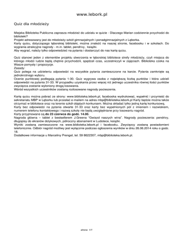 www.lebork.pl Quiz dla młodzieży Miejska Biblioteka Publiczna zaprasza młodzież do udziału w quizie - Dlaczego Marian codziennie przychodzi do biblioteki? Projekt adresowany jest do młodzieży szkół gimnazjalnych i ponadgimnazjalnych z Lęborka. Karty quizu, dotyczącego lęborskiej biblioteki, można znaleźć na naszej stronie, facebooku i w szkołach. Do wygrania atrakcyjne nagrody - m.in. tablet, pendrivy, książki. Aby wygrać, należy tylko odpowiedzieć na pytania i dostarczyć do nas kartę quizu. Quiz stanowi jeden z elementów projektu stworzenia w lęborskiej bibliotece strefy młodzieży, czyli miejsca do którego młodzi ludzie będą chętnie przychodzili, spędzali czas, uczestniczyli w zajęciach. Biblioteka czeka na Wasze pomysły i propozycje. Zasady: Quiz polega na udzieleniu odpowiedzi na wszystkie pytania zamieszczone na karcie. Pytania zamknięte są jednokrotnego wyboru. Ocenie punktowej podlegają pytania 1-30. Quiz wygrywa osoba z największą liczbą punktów i która udzieli odpowiedzi na pytania 31-33. W przypadku uzyskania przez więcej niż jednego uczestnika równej ilości punktów zwycięzca zostanie wyłoniony drogą losowania. Wśród wszystkich uczestników zostaną rozlosowane nagrody pocieszenia. Kartę quizu można pobrać ze strony: www.biblioteka.lebork.pl, facebooka wydrukować, wypełnić i przynieść do sekretariatu MBP w Lęborku lub przesłać e-mailem na adres [email protected] Karty będzie można także otrzymać w bibliotece oraz na terenie szkół objętych konkursem. Można składać tylko jedną kartę konkursową. Karty bez odpowiedzi na pytania otwarte 31-33 oraz karty bez wypełnionych pól z imieniem i nazwiskiem, numerem telefonu kontaktowego i nazwą szkoły nie będą uwzględniane przy losowaniu nagród. Karty przyjmowane są do 23 czerwca do godz. 14.00. Nagroda główna – tablet z bestsellerem J.Greena “Gwiazd naszych wina”. Nagrody pocieszenia: pendrivy, długopisy do ekranów dotykowych, półroczny abonament w Ludotece, książki. Wyniki zostaną zamieszczone na www.biblioteka.lebork.pl i facebooku. Zwycięzcy zostaną powiadomieni telefonicznie. Odbiór nagród możliwy jest wyłącznie podczas ogłoszenia wyników w dniu 26.06.2014 roku o godz. 18. Dodatkowe informacje u Marceliny Prengel, tel. 59 8622307, [email protected]. strona 1/1 Powered by TCPDF (www.tcpdf.org)