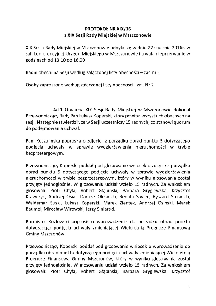 PROTOKOŁ NR XIX/16 z XIX Sesji Rady Miejskiej w Mszczonowie XIX Sesja Rady Miejskiej w Mszczonowie odbyła się w dniu 27 stycznia 2016r. w sali konferencyjnej Urzędu Miejskiego w Mszczonowie i trwała nieprzerwanie w godzinach od 13,10 do 16,00 Radni obecni na Sesji według załączonej listy obecności – zał. nr 1 Osoby zaproszone według załączonej listy obecności –zał. Nr 2 Ad.1 Otwarcia XIX Sesji Rady Miejskiej w Mszczonowie dokonał Przewodniczący Rady Pan Łukasz Koperski, który powitał wszystkich obecnych na sesji. Następnie stwierdził, że w Sesji uczestniczy 15 radnych, co stanowi quorum do podejmowania uchwał. Pani Koszulińska poprosiła o zdjęcie z porządku obrad punktu 5 dotyczącego podjęcia uchwały w sprawie wydzierżawienia nieruchomości w trybie bezprzetargowym. Przewodniczący Koperski poddał pod głosowanie wniosek o zdjęcie z porządku obrad punktu 5 dotyczącego podjęcia uchwały w sprawie wydzierżawienia nieruchomości w trybie bezprzetargowym, który w wyniku głosowania został przyjęty jednogłośnie. W głosowaniu udział wzięło 15 radnych. Za wnioskiem głosowali: Piotr Chyła, Robert Głąbiński, Barbara Gryglewska, Krzysztof Krawczyk, Andrzej Osial, Dariusz Olesiński, Renata Siwiec, Ryszard Stusiński, Waldemar Suski, Łukasz Koperski, Marek Zientek, Andrzej Osiński, Marek Baumel, Mirosław Wirowski, Jerzy Siniarski. Burmistrz Kozłowski poprosił o wprowadzenie do porządku obrad punktu dotyczącego podjęcia uchwały zmieniającej Wieloletnią Prognozę Finansową Gminy Mszczonów. Przewodniczący Koperski poddał pod głosowanie wniosek o wprowadzenie do porządku obrad punktu dotyczącego podjęcia uchwały zmieniającej Wieloletnią Prognozę Finansową Gminy Mszczonów, który w wyniku głosowania został przyjęty jednogłośnie. W głosowaniu udział wzięło 15 radnych. Za wnioskiem głosowali: Piotr Chyła, Robert Głąbiński, Barbara Gryglewska, Krzysztof 1 Krawczyk, Andrzej Osial, Dariusz Olesiński, Renata Siwiec, Ryszard Stusiński, Waldemar Suski, Łukasz Koperski, Marek Zientek, Andrzej Osiński, Marek Baumel, Mirosław Wirowski, Jerzy Siniarski. Rada Miejska w Mszczonowie w wyniku przeprowadzonego głosowania przyjęła następujący porządek obrad XIX Sesji Rady Miejskiej w Mszczonowie: 1. Otwarcie sesji i stwierdzenie prawomocności obrad. 2. Przyjęcie protokołu z poprzedniej sesji Rady Miejskiej. 3. Ocena stanu bezpieczeństwa pożarowego na terenie miasta i gminy Mszczonów. 4. Podjęcie uchwały w sprawie wydzierżawienia nieruchomości w trybie bezprzetargowym. 5. Podjęcie uchwały w sprawie powołania Komisji Inwentaryzacyjnej mienia komunalnego. 6. Podjęcie uchwały skargi mieszkańców Gminy Radziejowice na działanie Burmistrza Mszczonowa 7. Podjęcie uchwały zmieniającą Uchwałę Budżetową Gminy Mszczonów na rok 2016. 8. Podjęcie uchwały zmieniającej Wieloletnią Prognozę Finansową Gminy Mszczonów 9. Informacja z działalności Burmistrza Mszczonowa między sesjami. 10. Wolne wnioski i zapytania. 11. Zakończenie obrad. W głosowaniu udział wzięło 15 radnych. Za przyjęciem porządku obrad głosowali: Piotr Chyła, Robert Głąbiński, Barbara Gryglewska, Krzysztof Krawczyk, Andrzej Osial, Dariusz Olesiński, Renata Siwiec, Ryszard Stusiński, Waldemar Suski, Łukasz Koperski, Marek Zientek, Andrzej Osiński, Marek Baumel, Mirosław Wirowski, Jerzy Siniarski Ad. 2 Przewodniczący Koperski stwierdził, że protokół z XVIII Sesji został sporządzony i był przekazany radnym przed sesją. Radni nie wnieśli uwag i zastrzeżeń do protokołów przyjmując go w drodze głosowania przy dwóch głosach wstrzymujących się (Piotr Chyła, Andrzej Osial) i 13 głosach za (Robert Głąbiński, Barbara Gryglewska, Krzysztof Krawczyk, Dariusz Olesiński, Renata Siwiec, Ryszard Stusiński, Waldemar Suski, Łukasz Koperski, Marek Zientek, Andrzej Osiński, Marek Baumel, Mirosław Wirowski, Jerzy Siniarski). W głosowaniu udział wzięło 15 radnych. 2 Ad.3 W tym punkcie głos zabrali: Pan Tomasz Piątkowski – Naczelnik Wydziału Operacyjnego KPPSP w Żyrardowie przedstawił informację o stanie bezpieczeństwa w zakresie ochrony przeciwpożarowej w roku 2015 na terenie miasta i gminy Mszczonów. Informacja stanowi załącznik do protokołu. Pan Grzegorz Koperski – Naczelnik OSP w Mszczonowie prosi o wyjaśnienie, dlaczego jednostka OSP Mszczonów otrzymała ocenę niedostateczną w czasie przeglądu sprawności bojowej. Pan Piątkowski poinformował, że ocena niedostateczna wynika z błędu krytycznego strażaka ochotnika i błąd ten polegał na nie założeniu rękawiczek ochronnych podczas ćwiczeń na manekinie. Ponadto dodał, że dopuszczalne jest niezałożenie rękawiczek przez ratownika, ale musi być sygnalizacja słowna, że takie rękawiczki zakłada. Burmistrz Kurek poinformował, że w informacji jest błąd dotyczący braku agregatów na ujęciu wody w Badowo Dańkach i Markowie Towarzystwo. Zarówno na jednym jak i drugim ujęciu takie ręczne agregaty prądotwórcze są. Nie ma tylko agregatu na ujęciu wody w Mszczonowie przy ul. Tysiąclecia, ale w tym roku też będzie on zakupiony. Radny Wirowski zapytał się czy przewiduje się kontynuację serialu Strażacy w Żyrardowie. Pan Piątkowski odpowiedział, że liczba błędów w tym serialu była przerażająca. Prawdopodobnie przewidziana jest II seria tego serialu, ale nikt z Komendy Powiatowej ani nikt ze strażaków nie brał udziału w konsultacjach tego serialu. Jedyną pozytywną rzeczą jest to, że Żyrardów pojawił się w mediach. Pani Korzonkowska przedstawiła sprawozdanie z realizacji zadań w zakresie ochrony przeciwpożarowej w gminie Mszczonów w 2015r. Sprawozdanie stanowi załącznik do protokołu. Radny Głąbiński zapytał się czy zrealizowana była prośba dotycząca zakupu sprężarki do nabijania butli dla potrzeb OSP Mszczonów. Pani Korzonkowska odpowiedziała, że tak. Sprężarka zost