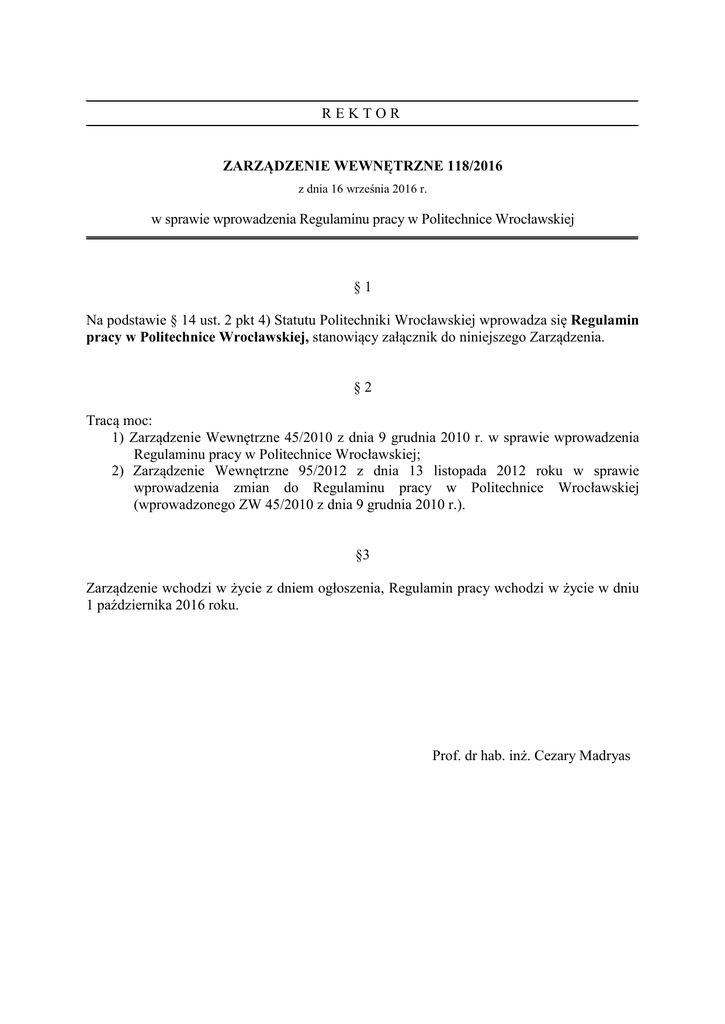 Regulamin pracy w Politechnice Wrocławskiej obowiązujący od