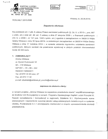 KAPiTAtLUDZKf promise .<£> \e| NARODOWA STRATEGIC SPbJNOSCl MINY WIDAWA ul. RyneK Kosciuszki 10 UNlft EUROPE/SKA EUROPEJSKI FUNDUSZSPOtECZNY 98-170 Widawa tel. /043/ 67 21 034 Widawa, dn. 20.08.2015r. ROS.042.7.2015.EBB Zapytanie ofertowe Na podstawie art. 4 pkt. 8 ustawy Prawo zamowieri publicznych ftj. Dz. U. z 2013 r., poz. 907 z pozn. zm.) oraz art. 44 ust. 3 ustawy z dnia 27 sierpnia 2009 r. o finansach publicznych (Dz. U. z 2009 r. nr 157 poz. 1240 z pozn. zm.) zgodnie z zarza^dzeniem nr 39/2013 Wojta Gminy Widawa z dnia 30 lipca 2013r. w zmienionym zarzajdzeniem nr 28/2014 Wojta Gminy Widawa z dnia 17 kwietnia 2014 r. w sprawie ustalenia regulaminu udzielania zamowieh publicznych, ktorych wartosc nie przekracza wyrazonej w ztotych polskich rownowartosci kwoty 30 000 euro. 1. ZAMAWIAJ^CY Gmina Widawa ul. Rynek Kosciuszki 10 98- 170 Widawa NIP 831 -15-69-344 REGON 730934571 Tel. 43672 1034wew. 37 Fax. 43672 11 52 e-mail: [email protected], [email protected] zaprasza do ztozenia oferty: w ramach projektu ,,Gmina Widawa na wypasione przedszkola stawia" wspotfinansowanego ze srodkow Unii Europejskiej w ramach Programu Operacyjnego Kapital Ludzkl Priorytet IX. Rozwoj wyksztalcenia i kompetencji w regionach, Dziatanie 9.1. Wyrownywanie szans edukacyjnych i zapewnienie wysokiej jakosci uslug edukacyjnych swiadczonych w systemie oswiaty, Poddzialanie 9.1.1 Zmniejszanie nierownosci w stopniu upowszechnienia edukacjl przedszkolnej. KAPfTAtLUDZKl NARODOWA STRATECIA SPOJNOiCf 2. iodzkle UHtAEimOPEJSKA EUROPEJSKI FUNDUSZSPOtECZMY PRZEDMIOTZAMOWIENIA Przedrniotem zamowienia jest zakup i dostawa mebli i wyposazenia - drobnego wyposazenia do realizacji zaje,c w oddziale przedszkolnym w szkole podstawowej w Ochlach. MEBLE I WYPOSAZENIE - DROBNE WYPOSAZENIE SALI DO REALIZACJI ZAJ^C W ODDZIALE PRZEDSZKOLNYM W SP W OCHLACH L.P OPIS Ilosc sztuki/zestaw Tablice korkowe Korkowa tablica z drewniana, rama_, do prezentacji prac lub wywieszania ogloszeri szkolnych. - wym. 90 x 150 cm 1 szt. Tablica magnetyczna WytrzymaJa biaia lakierowana tablica z powierzchnia_ suchoscieralnq. Odporna na uszkodzenia. - wym. 100x 170 cm. 1 szt. NAZWA Duze dekoracje do samodzielnego zawieszenia na scianie, uatrakcyjnia^ wyglqd sal przedszkolnych. Wykonane z twardej Zestaw z chmurkq,tektury, z otworami do mocowania. dekoracje - 2 chmurki o wym. 45 x 68 cm - sloneczko o wym. 53,5 x 49 cm Duze dekoracje do samodzielnego zawieszenia na scianie, uatrakcyjnia^ wygla^d sal przedszkolnych. Wykonane z twardej tektury, z otworami do Zestaw z motylkiemmocowania. dekoracje - motylek o wym. 60 x 48 cm - pszczoika o wym. 54,5 x 48,5 cm - ptaszeko wym. 51,5 x48,5 cm Duze dekoracje do samodzielnego zawieszenia na scianie, uatrakcyjnia^ wyglajd sal przedszkolnych. Wykonane z twardej tektury, z otworami do Zestaw ze skrzynia_ mocowania. Pirata - skarb o wym. 51,8 x43,8 cm - krab o wyrn. 52 x 39,4 cm - papuga o wym. 62,2 x 26,7 cm Kolorowa aplikacja z plyty MDF w ksztalcie wiewiorki z zol^dziem, do zarnocowania na scian?. Stanowi zarowno dekoracjq sali, jak rowniez panels manipulacyjne Przesuwankausprawniajace motoryk§ r^ki dziecka. Wiewiorka - sensoryczny ogon - wym. wiewiorki 89 x 76 cm - wym. orzecha 38 x 49 cm PrzesuwankaSyrenka Kolorowa aplikacja 2 piyty MDF w ks2talcie syrenki, do 2amocowania na scian§, Stanowi zarowno dekoracj^ sali, jak rowniez panels manipulacyjne usprawniaja.ce motoryk^ r?ki dziecka. - wym. 90 x 100 cm 1 szt. 1 szt. 1szt. 1 szt. 1 szt. KAPJTA1LUDZKI NARODOWA STRATEC1A SPOJNOSC! 10 11 promise \e I UHIA EUROPEJSKA EUROPEJSKJ FUNDUSZ SPOIECZNY Aplikacja wrozka Kolorowa aplikacja z ptyty MDF w ksztalcie wrozki, do zarnocowania na scian?. Stanowi zarowno dekoracje^ sail, jak rowniez panele manipulacyjne usprawniajace motoryk§ r^ki dziecka. - doczepiane na napy materialowe skrzydeika i nozki, a na nich sznurowanki - wym. 75 x 147 cm 1 szt. Zestaw z fala_ Duze dekoracje do samodzielnego zawieszenia na scianie, uatrakcyjnia_ wyglqd sal przedszkolnych. Wykonane z twardej tektury, z otworami do mocowania. - wieloryb o wym. 66,8 x 43,3 cm - ryba o wyrn. 66,8 x 28 crn - osmiornica o wym. 30,2 x 37,4 cm 1 szt. Zestaw z wiewiorka^ Duze dekoracje do samodzielnego zawieszenia na scianie, uatrakcyjnia, wygla_d sal przedszkolnych. Wykonane z twardej tektury, z otworami do mocowania. - wiewiorka o wym. 47,5 x 57 cm - sowa o wym. 35,5 x 53 cm - krzak malin o wym. 62 x 55,5 cm 1 szt. Dekoracja- ta_ka Dekoracje scienne w zywych, intensywnych kolorach. Elementy dekoracji przymocowane sa_ na stafe. Material: welur wypeiniony ga^bka, w celu usztywnienia. Mocowane do £ciany za pomoca_ szlufek. -wym. 171 x71 cm 2 szt. 12 Zegar 13 Kalendarz na wszystkie pory roku Zegar ma utatwic nauczycielowi wyjasnienie zasad odczytywania godzin i minut w cia_gu doby a takze zjawisk astronomicznych, zmiennosci dtugosci dnia i nocy w ciqgu roku. Umieszczone na dzwonku zegara symbole poszczegolnych por roku, napisy ,,dzien" i ,,noc" oraz wskazowki ,,^wit" i ,,zmierzch" umozliwiaja_ w sposob obrazowy i czytelny wyjasnienie dzieciom, ze np. zim^ dzieii zaczyna sie o godzinie osmej, a koiiczy si? okofo szesnastej zas latem swit wstaje o godzinie czwartej a zmierzch zapada o godzinie dwudziestej pierwszej. Jesienia, I wiosna_ nast^puje zrownanie dlugosci dnia i nocy. Dookola tarczy umieszczone sa^ symbole czynnosci, ktore dziecko wykonuje w ci^gu doby. Zielona wskazowka rna okreslic, co b^dzie robione w danej chwili. Pod tarcza_ znajduje si§ pojemna kieszen z dodatkowym wyposazeniem. Ruchome elementy to 3 wskazowki, 2 napisy ,,dzien" i ,,noc", 4 pory roku i 12 czynnosci. Wszystkie te czynnosci majq. przyszyty rzep, dzi^ki ktoremu mozna je przyczepiac w dowolne miejsce obrazu. -wym. 100 x78 cm Kalendarz zawiera: - 9 obrazkow o wym. 5 x 5 cm, z codziennymi czynnosciami, do umieszczania w okienkach domku - 6 obrazkow o wym. 5 x 5 cm, z warunkami atmosferycznymi - 2 strzatki do zaznaczania ternperatury oraz wfasciwego miesiapa i pory roku - 1 kolko do zaznaczania 